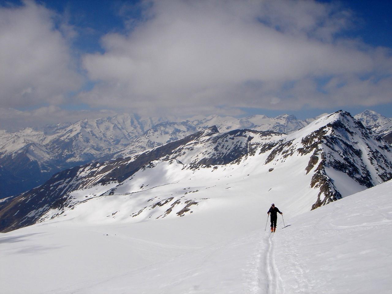 Traumfirnverhältnisse am Hocharn und Sonnblick. Abfahrt bis 2700 m, Gegenanstieg zur Goldzechscharte, Abfahrt zum Zirmsee und Aufstieg Sonnblick.