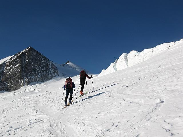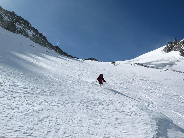 Am nächsten Tag Aufstieg zum Kleinvenediger und weiter zum Gipfel des Großvenedigers. Ab dem oberen Keesboden herrschte zeitweise extremer Sturm. Bei der Abfahrt östlich des Niederen Zaunes zum Viltragen Kees hatten wir zuerst Pulverschnee, ab ?Unterm Gewänd? Firn.