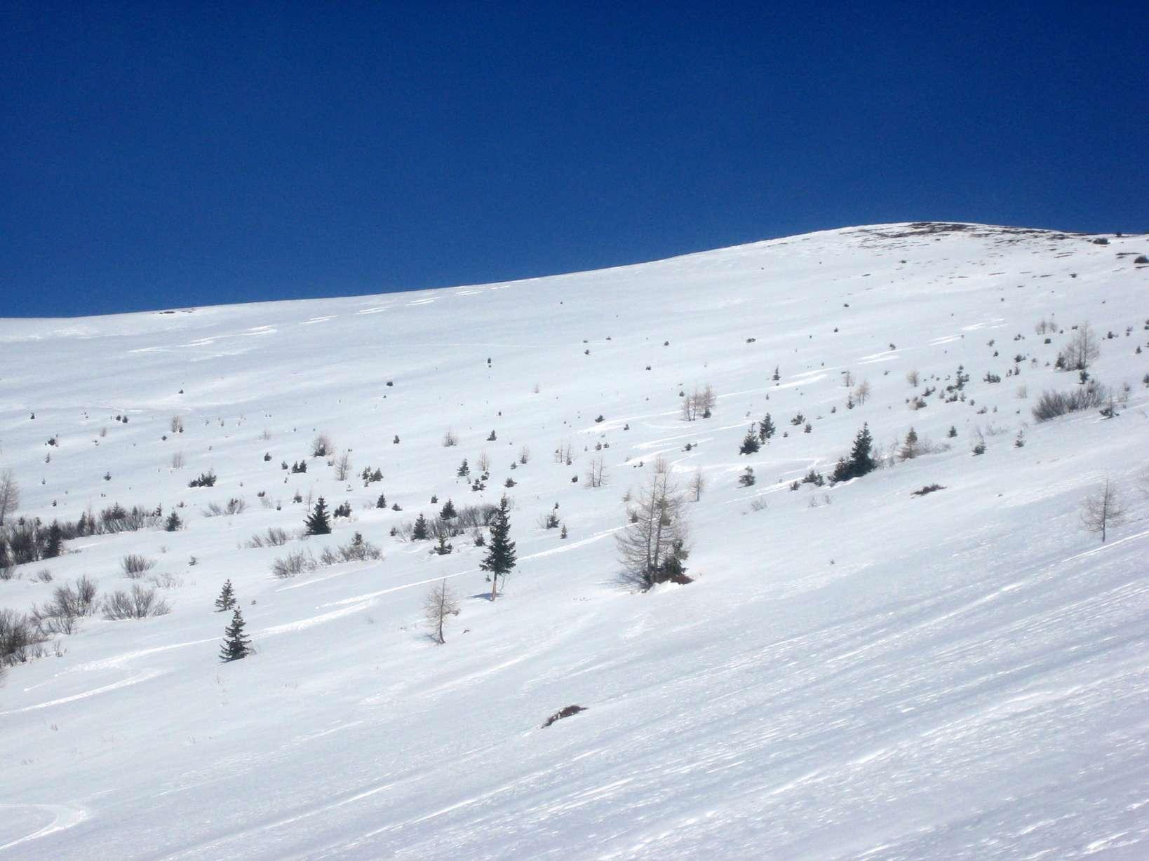 Nachmittagstour - trotz der allgemeinen Wärme mit recht guten Schneebedingungen, Firn überwiegt, Pulver nur mehr in ganz schattigen Hängen - da aber nach wie vor bis ca. 1900 m hinunter, teilweise Windharsch. Die geräumten Forststraßen sind nach Holzbringungs-Aktivitäten bereits stark ausgeapert, sowohl im Zustieg über die Karteisalm als auch bei der Abfahrt über die Ragglalm muss man ca. 25 Minuten Fußmarsch einplanen.