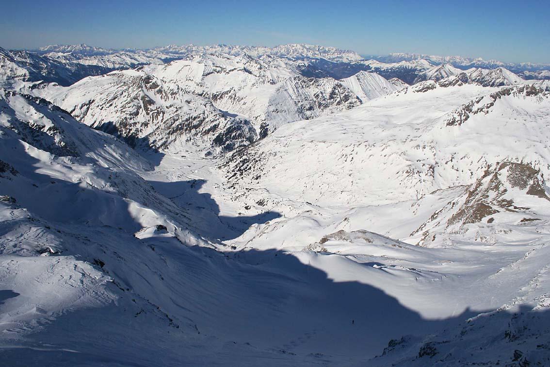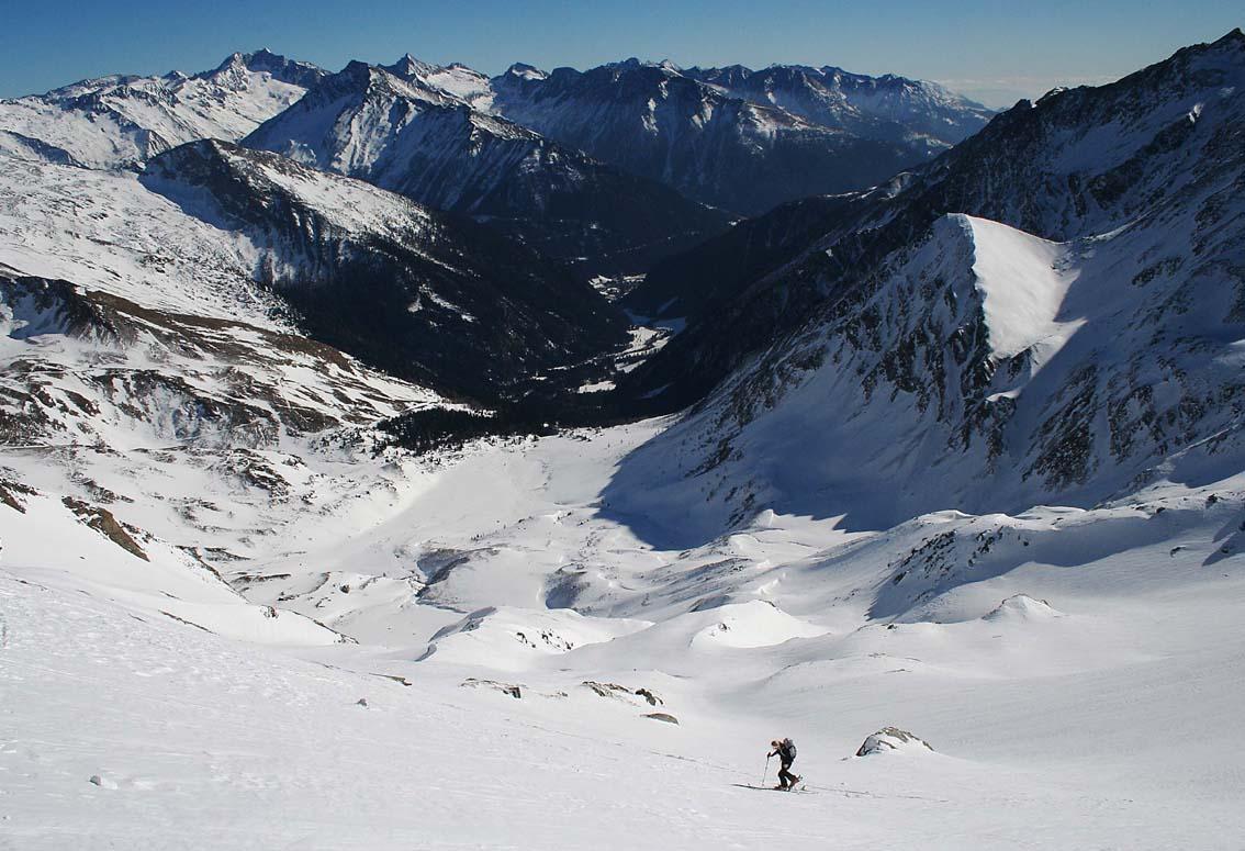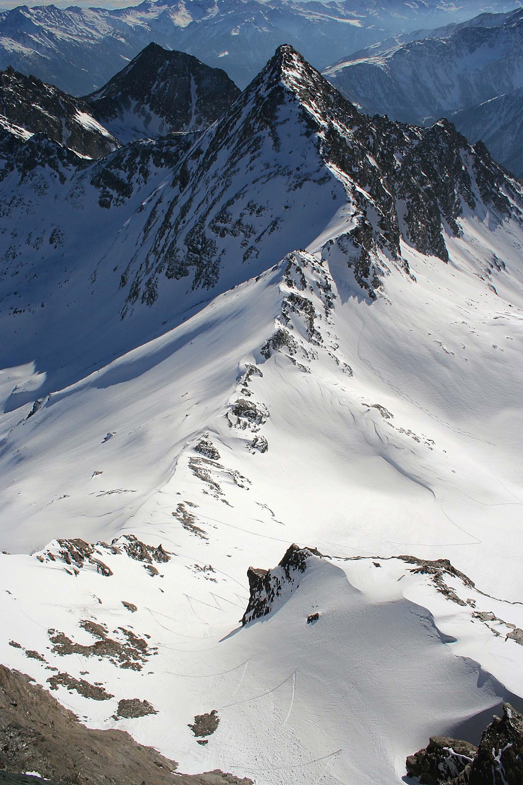 Hohe Geisel 2974m Grenzberg im Herzen des Nationalpark Hohe Tauern. Überschreitung vom Süden. Mit der Bahn von Böckstein nach Mallnitz,weiter mit dem Taxi zum Parkplatz unterhalb der Jamnighütte.(1700m) Aufstieg in die Feldseescharte/ Weißgerber Biwak (2714m) über den Südgrat auf die Hohe Geisel (2972m). Abfahrt über die Hagener Hütte, Eselkar nach Sportgastein. Zurück mit den Bus nach Böckstein. Südseite- günstige Touren und Firnverhältnisse zur Feldseescharte, zur Hagener Hütte oder auch Romatespitze. Lokale Gefahrenstellen im Kammbereich durch Einwehungen (Feldseescharte) Nordabfahrt- Im Gipfelhang Pulver, danach bis zur Hagener Hütte alles verblasen, gepresst und mit Windgangln übersät. In den Steilhängen der ?oberen Hagener Einfahrt? stabiler, harter griffiger Untergrund. Teils Pulver durch die ?Eselkar? und ?Gugelrinne? nach Sportgastein.