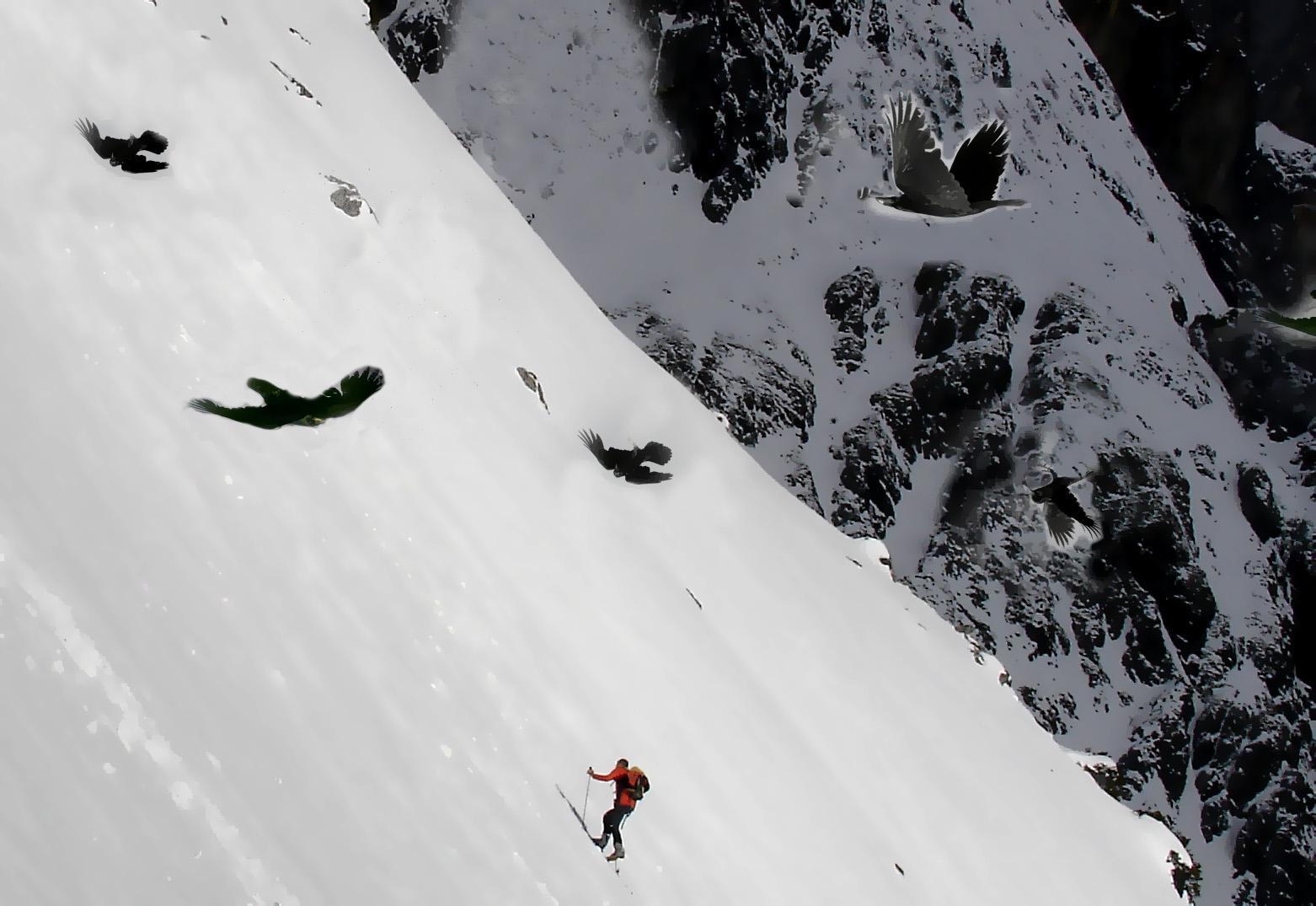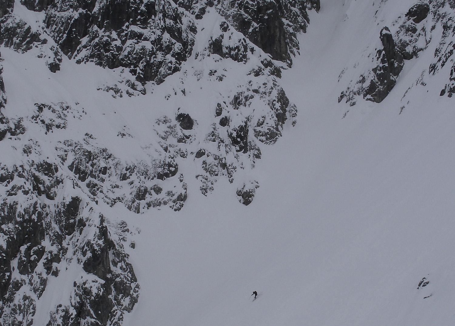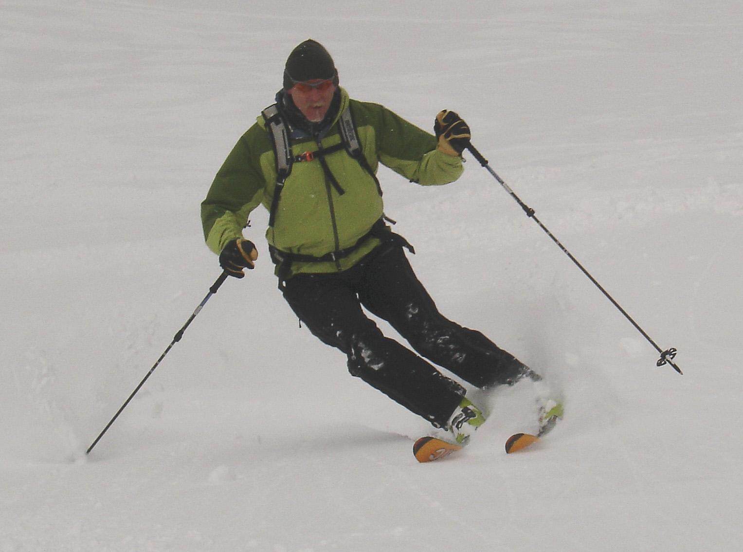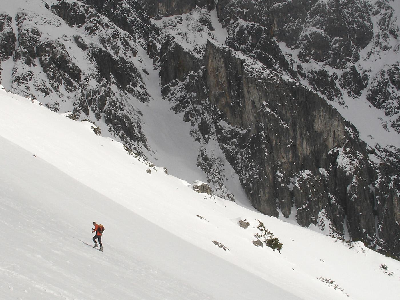 Ein fescher Rock und das Birgkar haben etwas Gemeinsames: man greift gerne öfters danach.! Auch heute wieder in das schöne Kar; für mich in greifbarer Nähe, die Schneeverhältnisse sehr gut- weil doch etwas windgeschützt-die alten Spuren leicht zugezuckert, Sonne und Schneefall wechseln, so manche Böe fährt einem ins Gesicht.