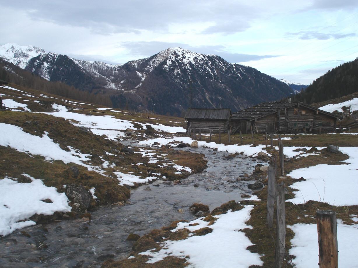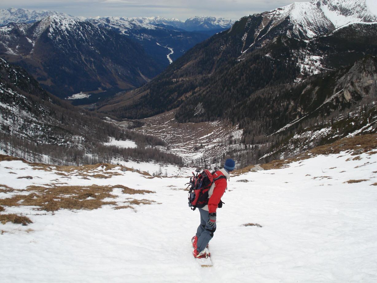 Es ist schon erstaunlich, wie sehr die warme Luft und der Regen in den letzten beiden Tagen der ohnehin nicht mächtigen Schneedecke zugesetzt haben. Die Schi mussten immerhin von der Tauernalm (1200 m) bis auf ca. 1600 m getragen werden. Alle anderen Tourengeher dürften dies schon gewusst haben - wir waren daher ganz alleine unterwegs.