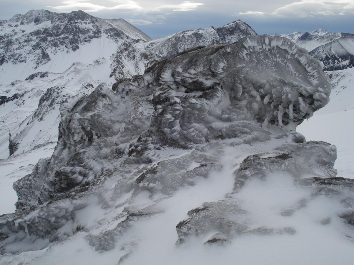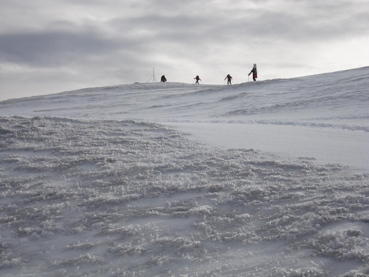 Verhältnisse: bis auf den Grund durchfeuchtete Schneedecke bis 2000 m. Weiter oben gibt es eine extrem harte und äußerst glatte Regeneisschicht. Wenige Zentimeter Neuschnee wurden vom Wind in ostseitige Hänge verblasen. Allerdings bestehen aufgrund der sehr geringen Neuschneemenge kaum neue Einwehungen. Aufgrund der derzeitigen geringen Schneelage ist die Tour nicht empfehlenswert!