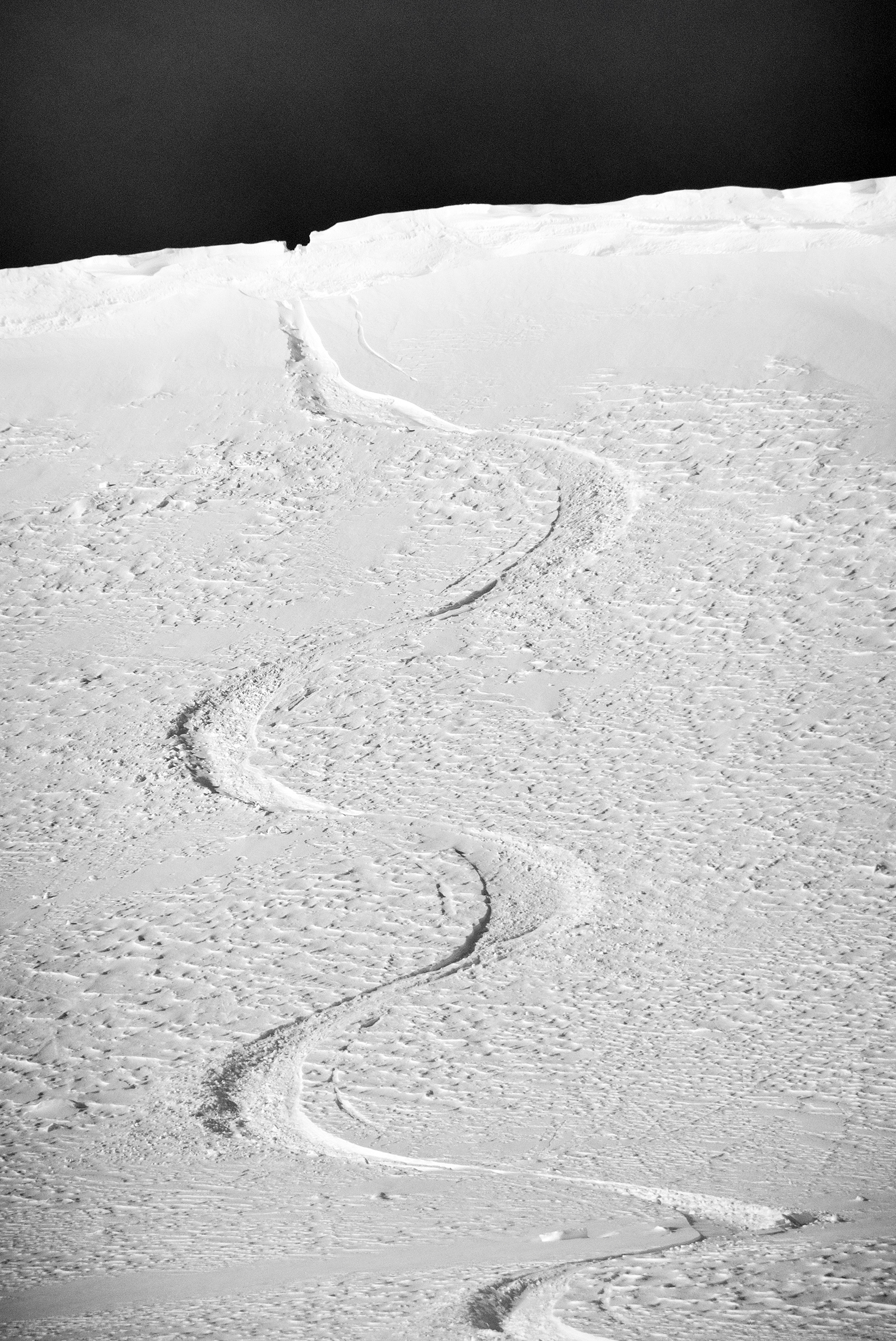 Der neue Schnee ist südseitig etwas windgepresst, aber viel schöner als auf der abbschließend zu fahrenden Nordwestseite, wo sich Triebschnee mit Harsch abwechselt oder gar aufeinander liegt. Und: Der Harsch trägt nicht!