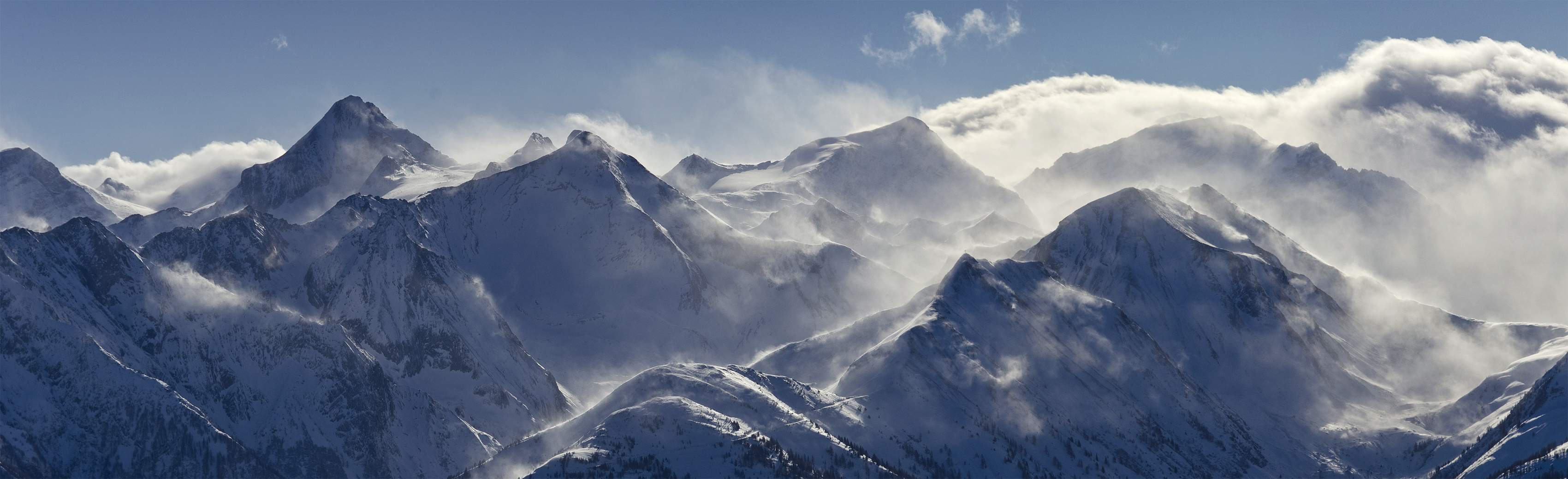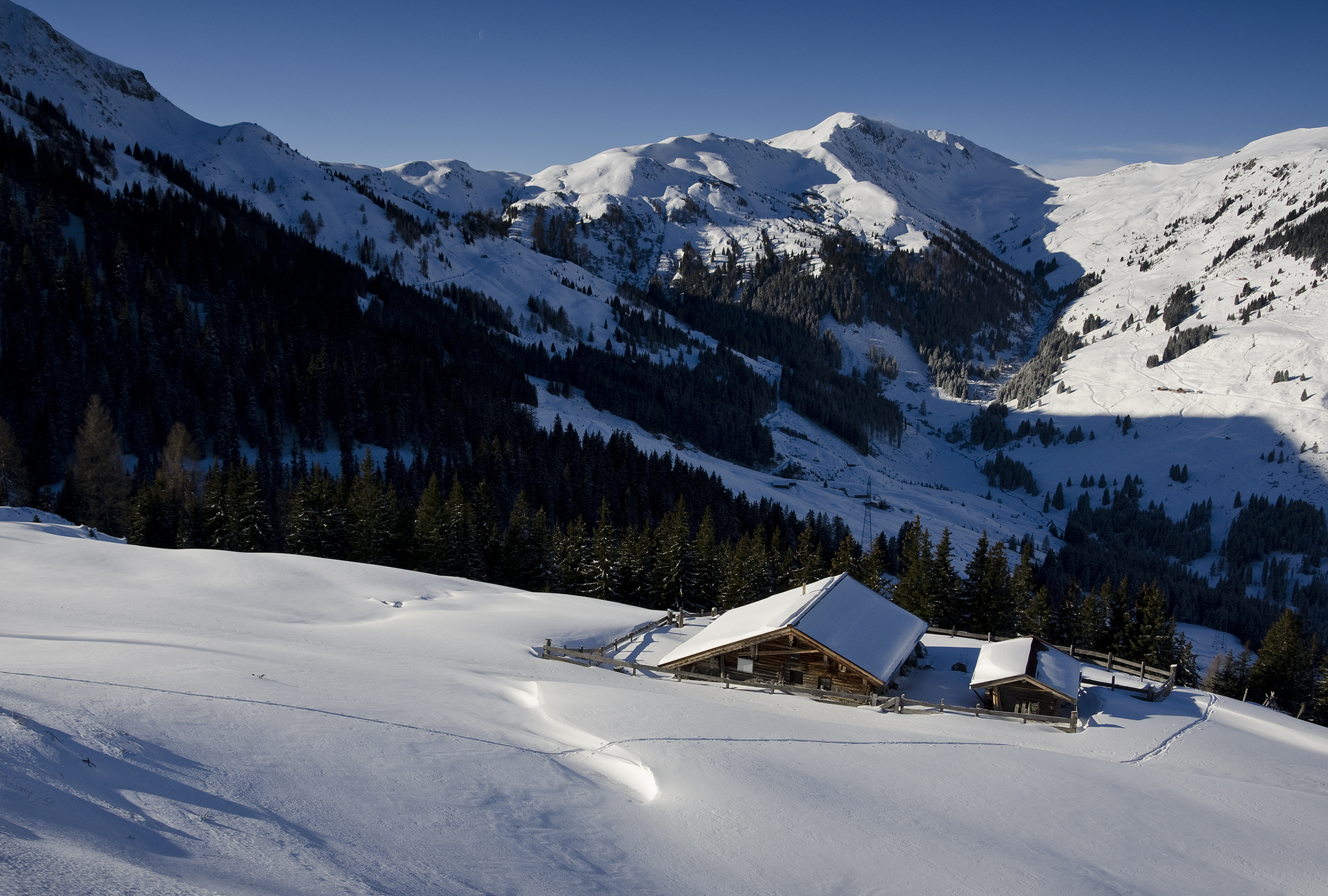 Es wird langsam winterlich. Bei minus 5 Grad gehe ich aus dem Schwarzachgraben über die Huberalmen und den Medalkogel zum Hochsaalbachkogel. Ganz oben am Grat ist die Herausforderung, ein windgeschütztes Skidepot zu finden.