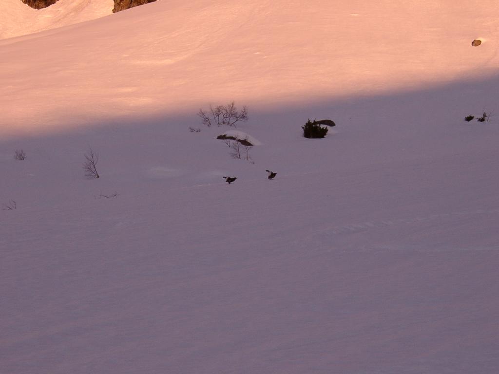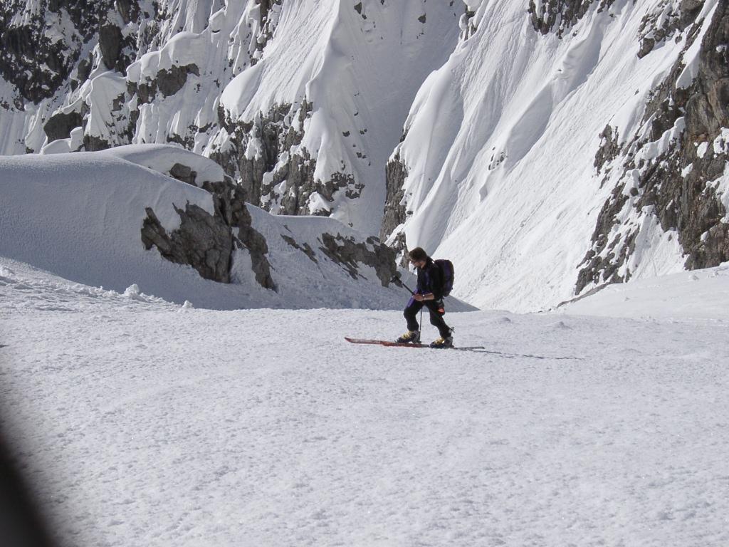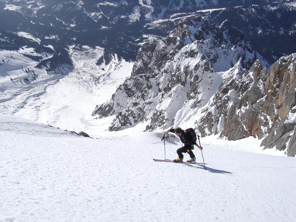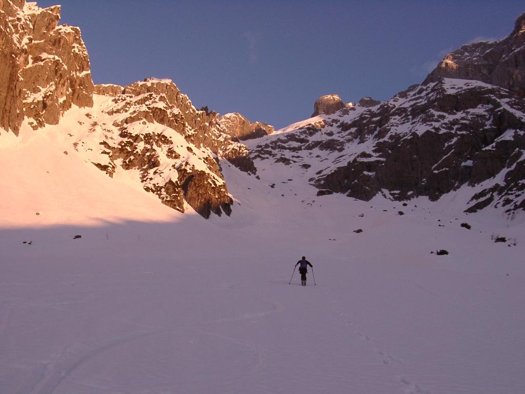 Heute Aufstieg ins Birgkar nachdem sich trotz des Föhns in der klaren Nacht dank der Abstrahlung ein gut tragfähiger Harschdeckel gebildet hat. Abfahrt um 9.45 Uhr für den oberen Teil gut (3 cm Firn), für den unteren Teil des Birgkares fast schon zu spät. (Zunehmende Verfirnung dank Föhnunterstützung schon ab 8 Uhr!!