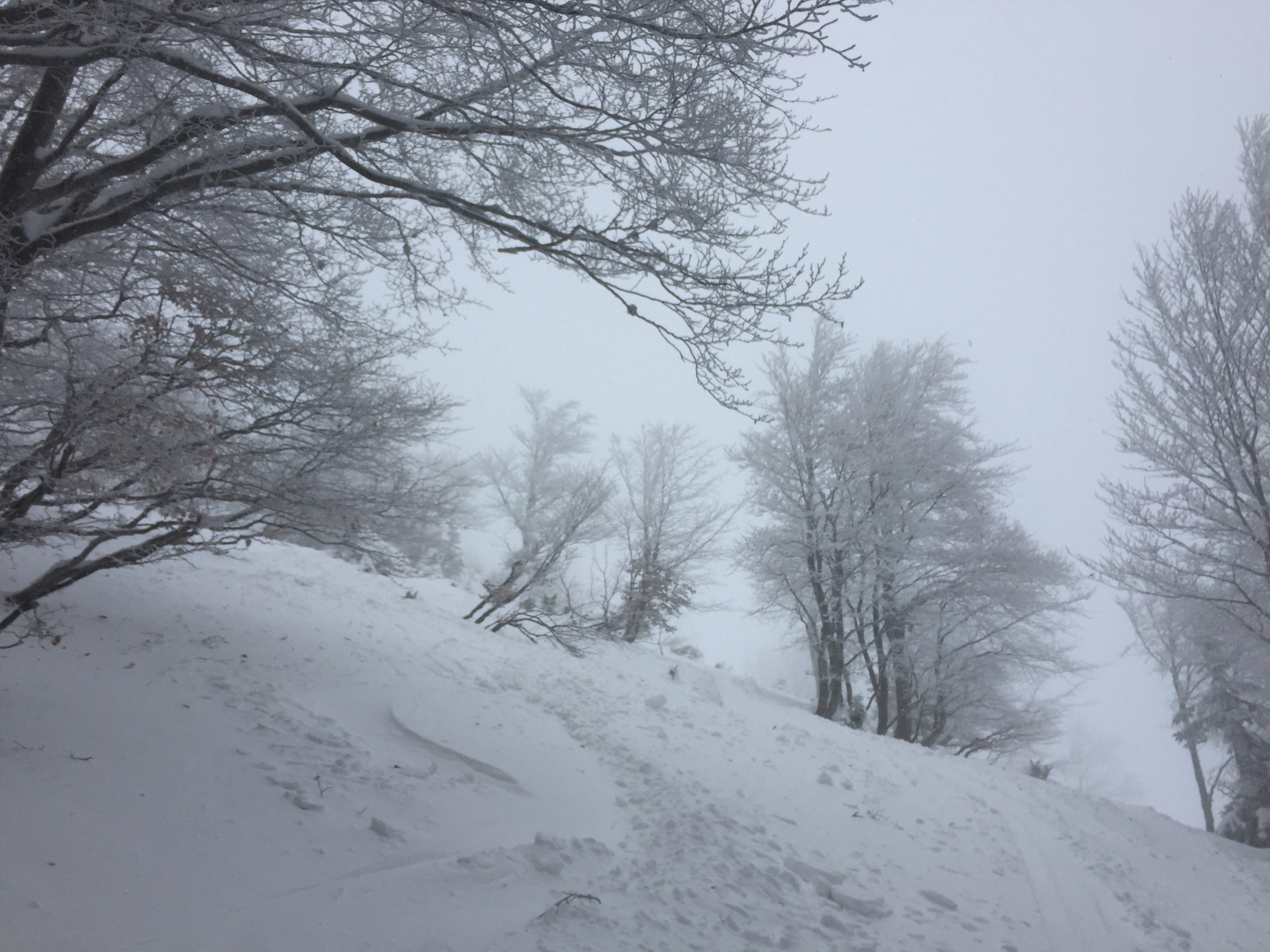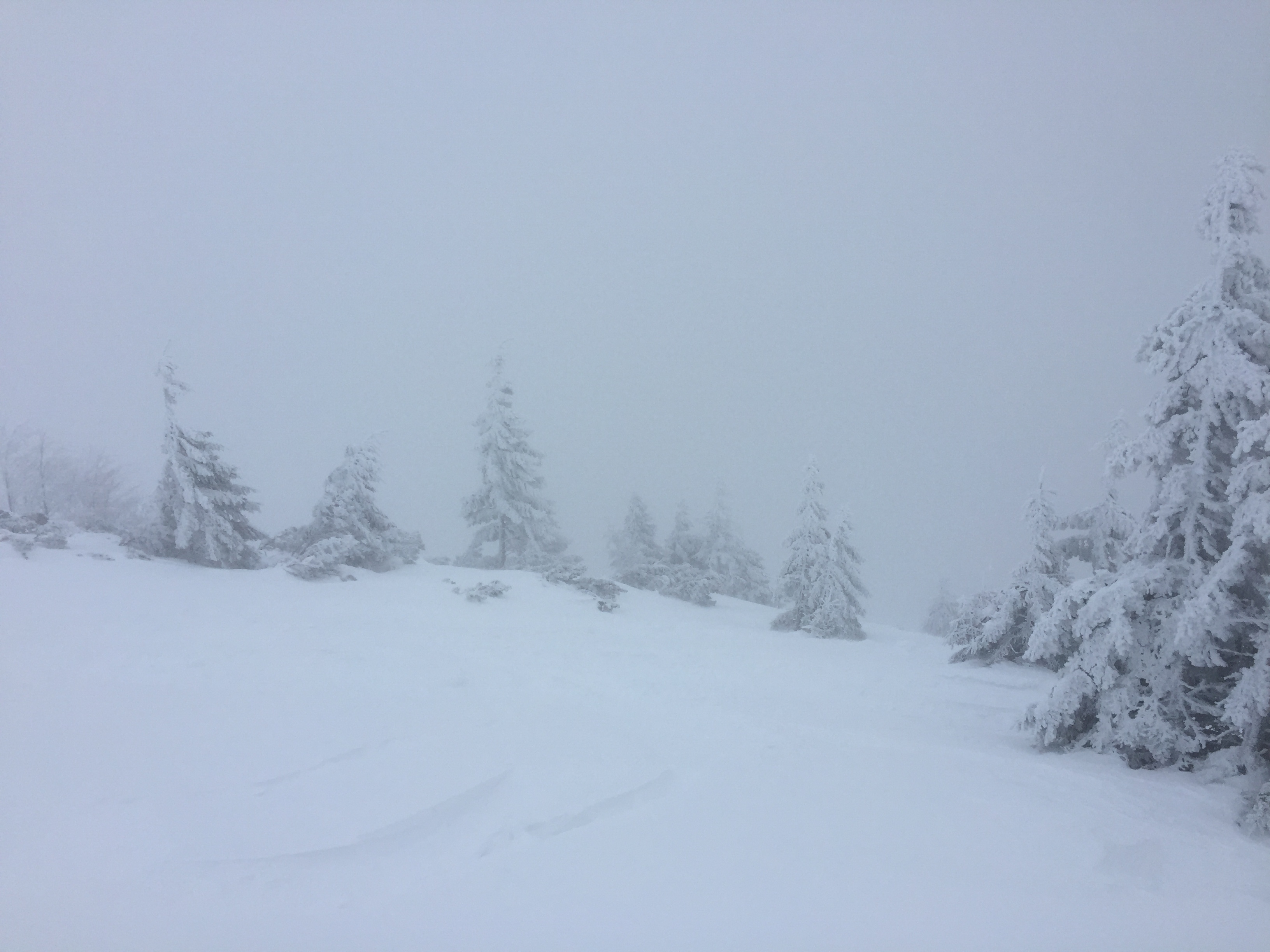 Vom Lahnsattel über den Mitterriegel auf den Terzer Göller. Mit zunehmender Höhe kälter und stürmisch. Im Gipfelbereich praktisch keine Sicht. Schneequalität: Unterhalb ca. 1.400 müA. gebundener kompakter Pulver, allerdings bis in den Wald hinein windbeeinflusst. Oberhalb 1.400 müA. wechselnd abgeblasen auf harter Altschneedecke oder Triebschneeablagerung. Stufe 3 > 1.400 müA. Stufe 2 < 1.400 müA.