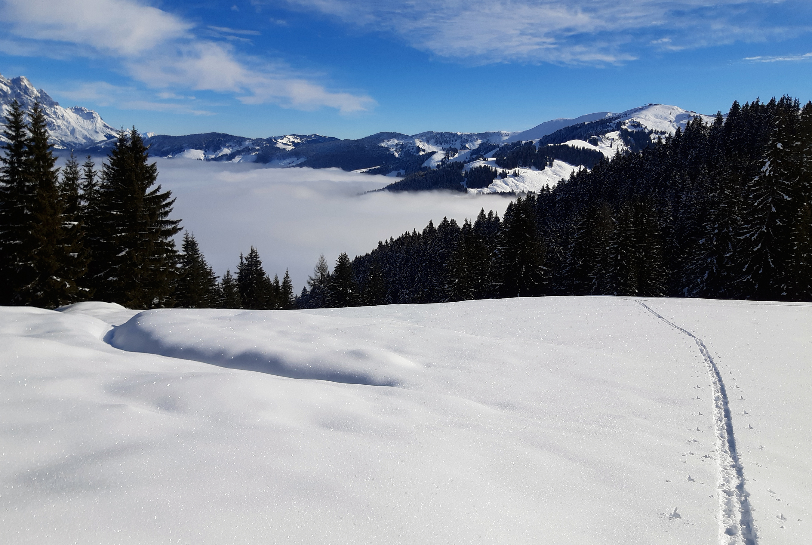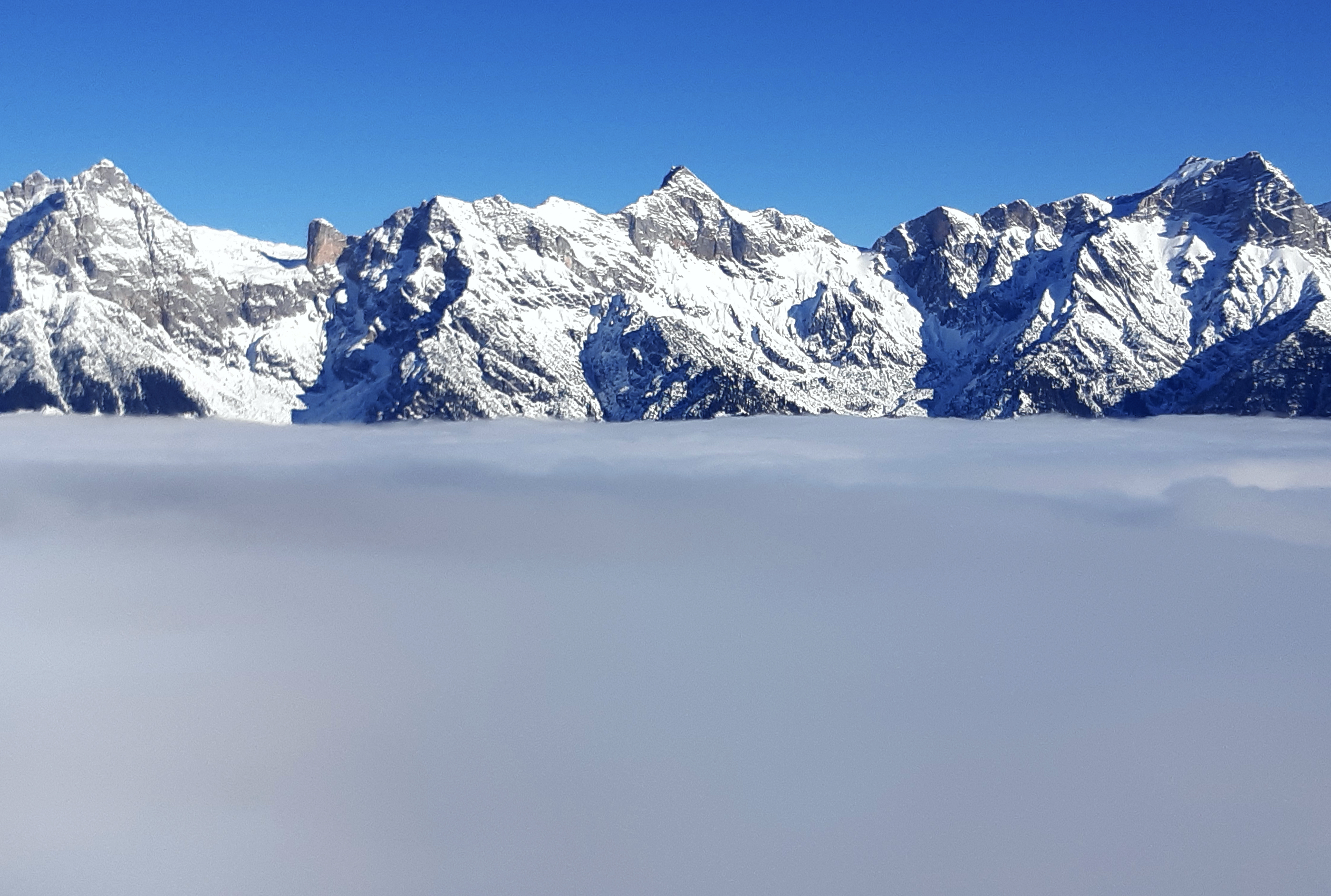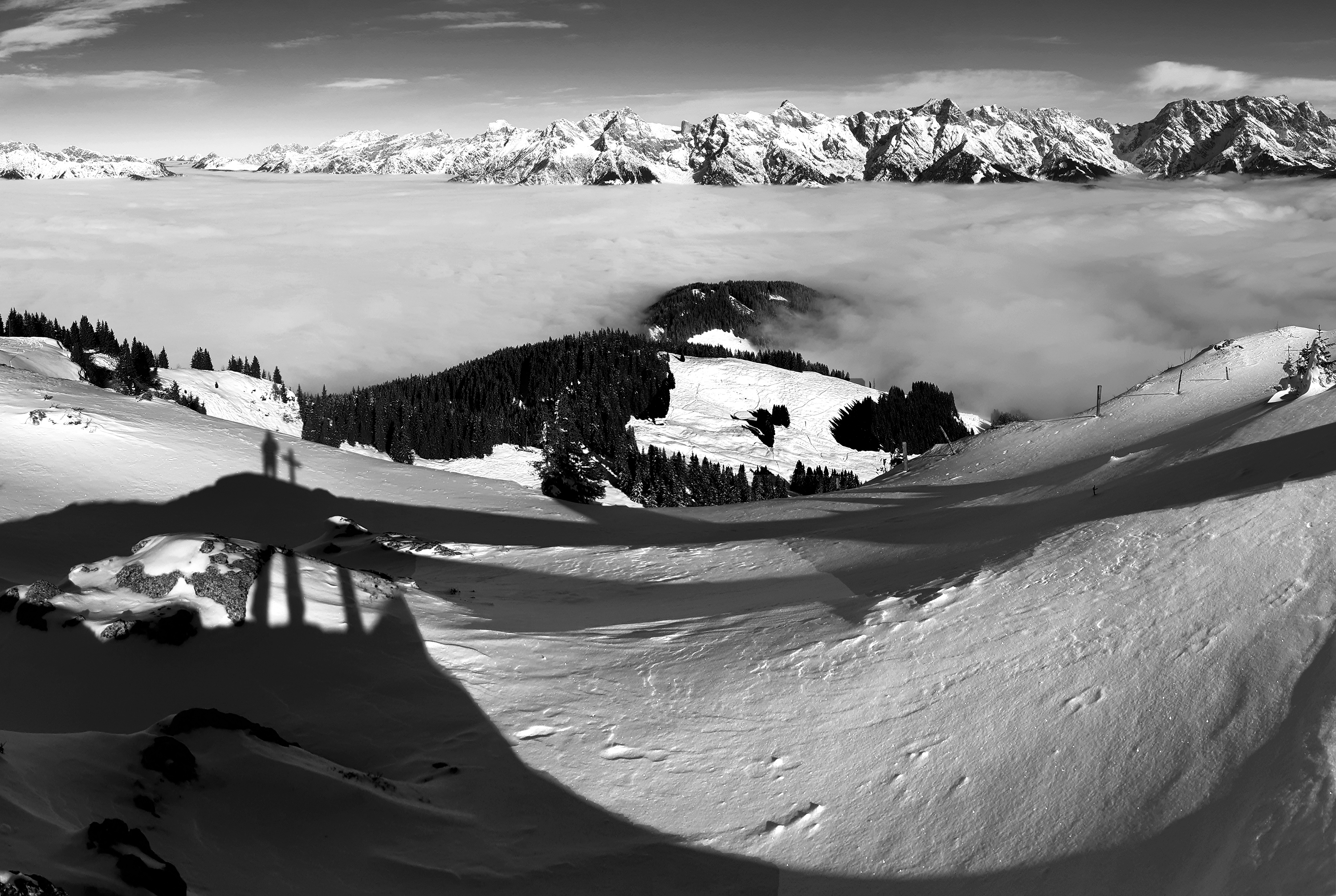 Reifglitzernder Pulverschnee zum Brunnkopf, und Meerblick über's Nebelmeer...