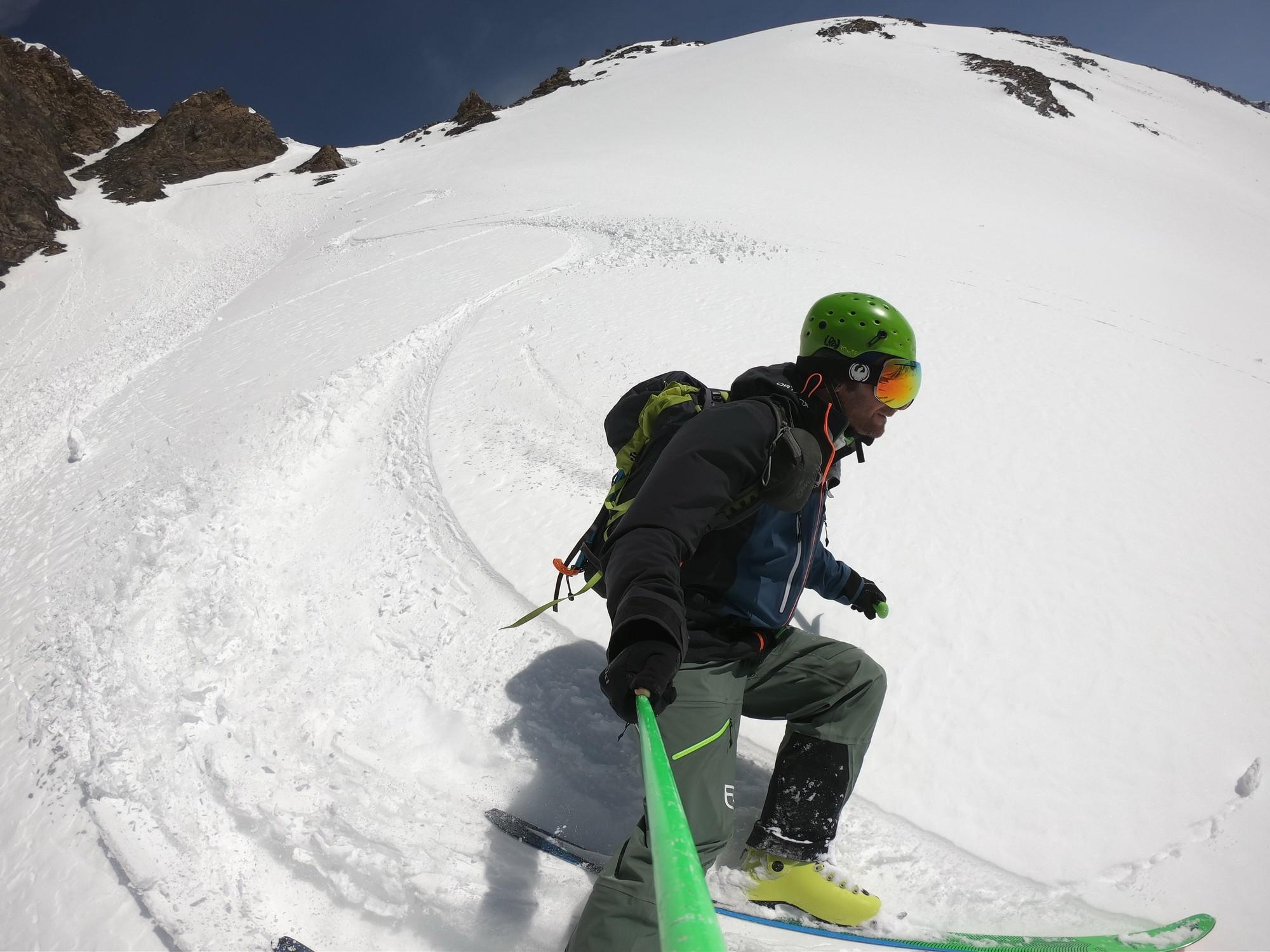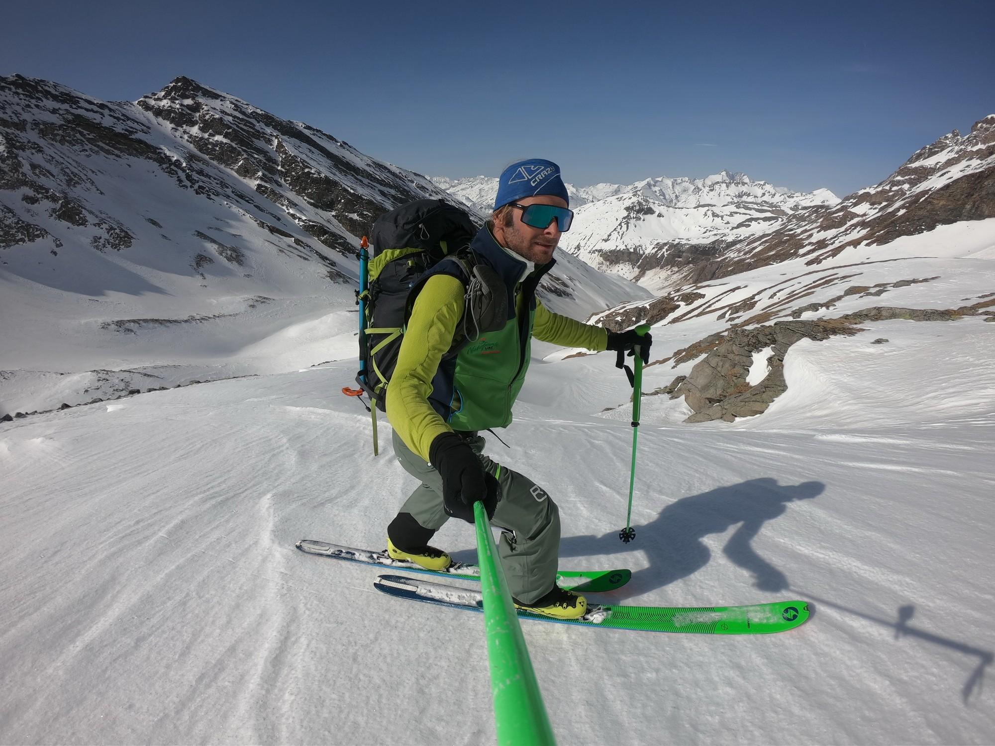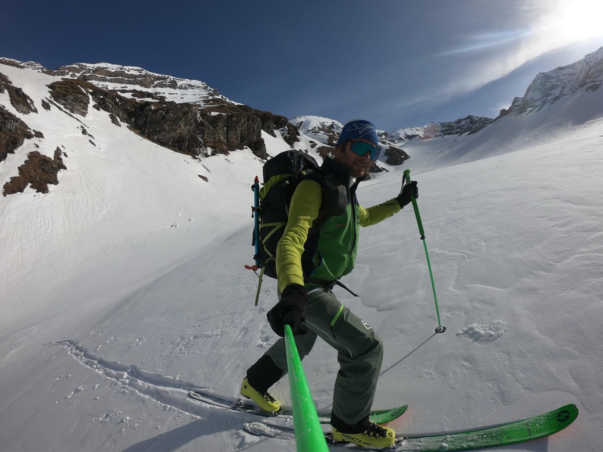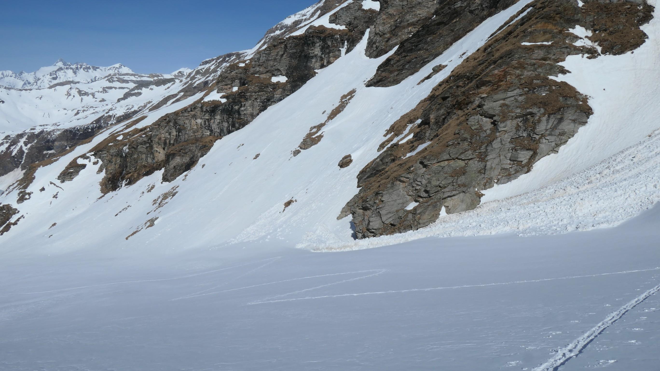 Die Abfahrt war dann wirklich genial, aber Bilder sagen da eh mehr als 1000 Worte. Lawinentechnisch konnte man ausser einigen alte Nassschneelawinen nicht viel erkennen. Natürlich war auch die Sonneneinstrahlung ein Thema und aus sicher Entfernung konnte ich dann nach der Abfahrt noch ein paar Entladungen aus Felsdurchsetztem Gelände beobachten.