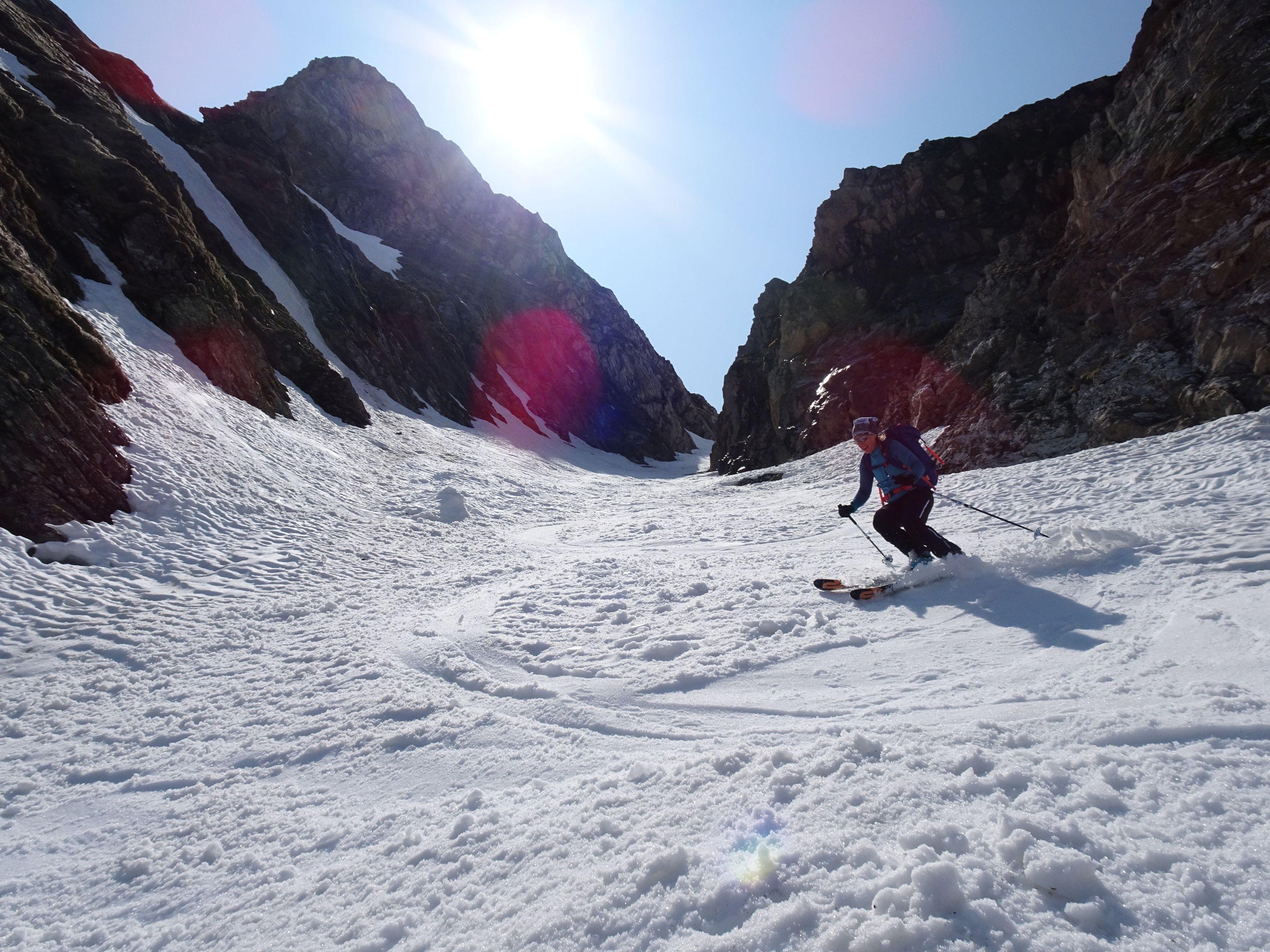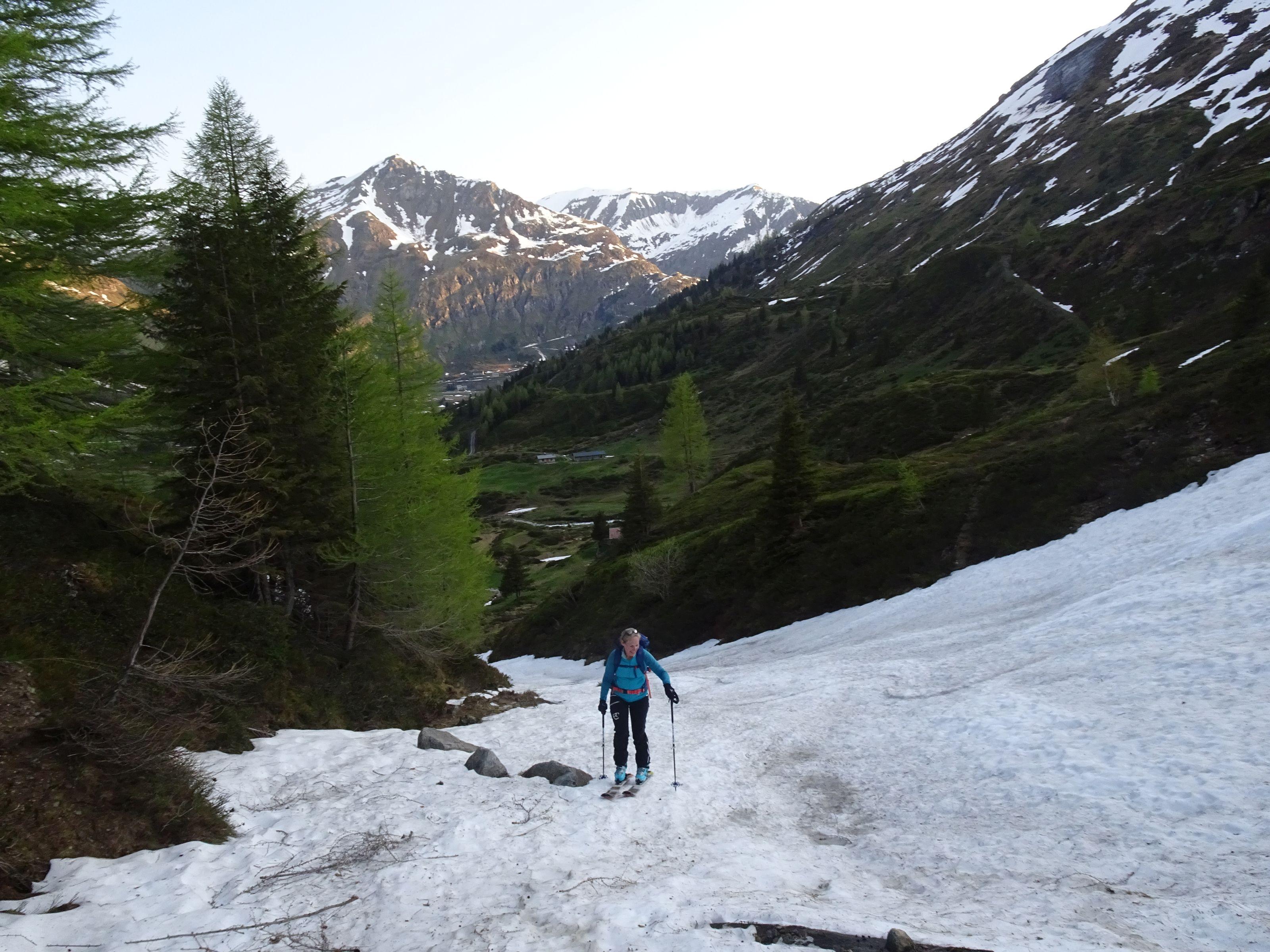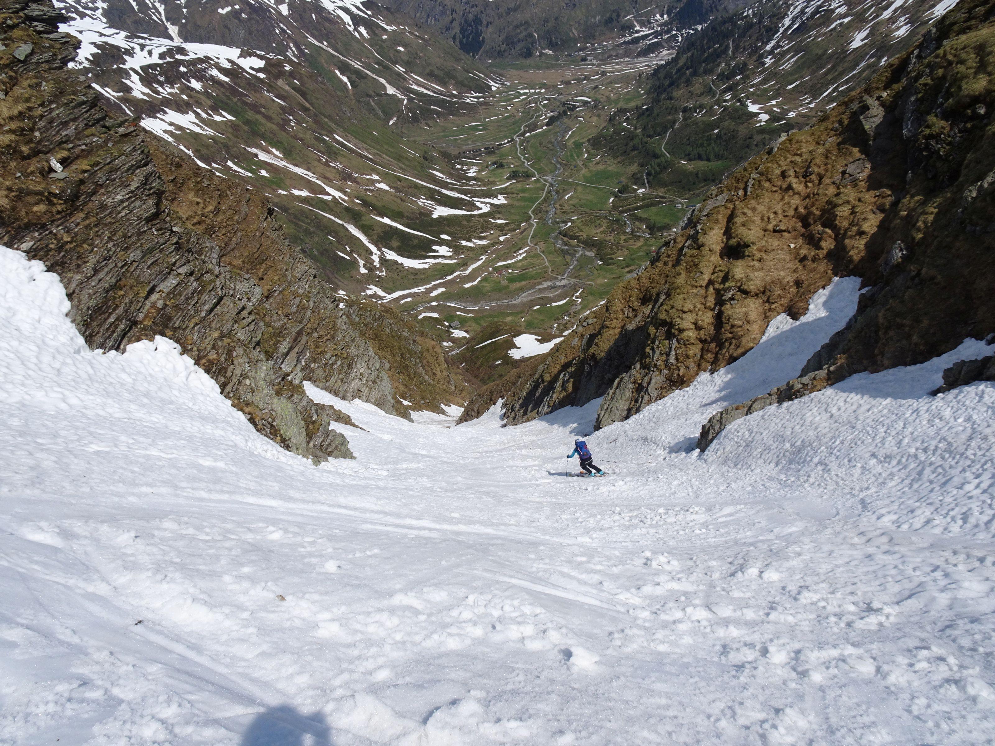 Start um 5 30 bei 5° im Talschluß/ Alm, nun noch 10 Min. zum Schnee u Ski anschnallen. Schneefläche leicht angefeuchtet, steile Passage griffig. Ab der Scharte leichter Wind, Harschdeckel, ein müheloser Aufstieg, es waren keine Harscheisen notwendig. Am Gipfel angenehme Temperatur, prächtige Kulisse. Querung zur Wallnerrinne sehr tief! Rinne schmiert gut, wie immer liegen im letzten Teil Steine. Insgesamt liegt noch sehr viel Schnee. Die Geisel ist im Juni immer ein lohnedes Ziel, ohne großen Aufwand und geht noch länger. Ein Hacken ist das Fahrverbot und der Fußmarsch zurück.