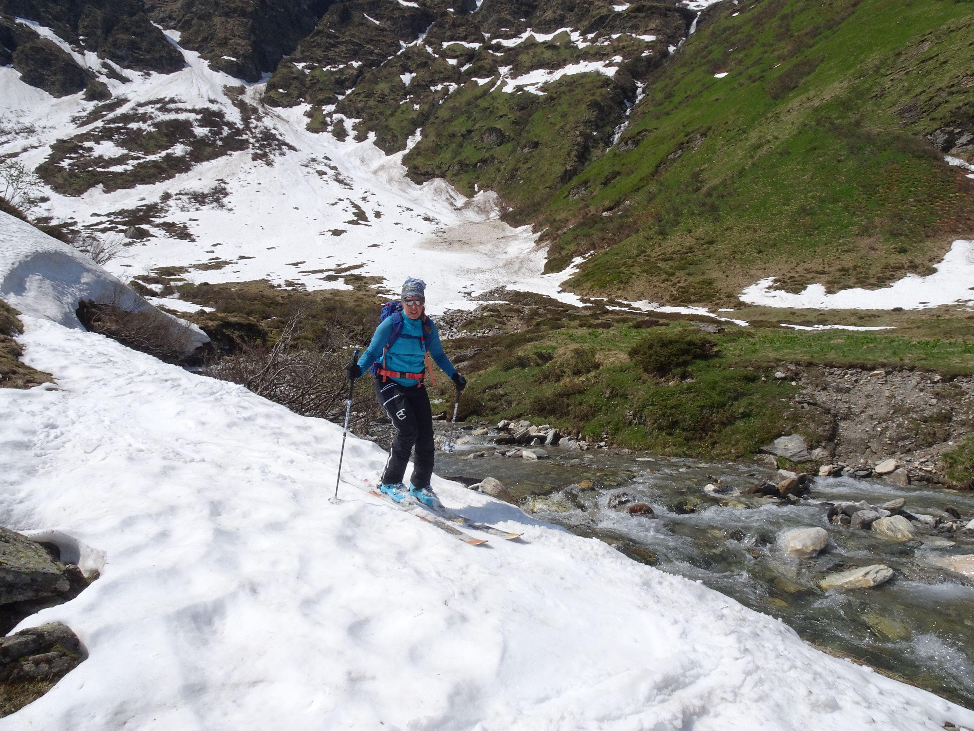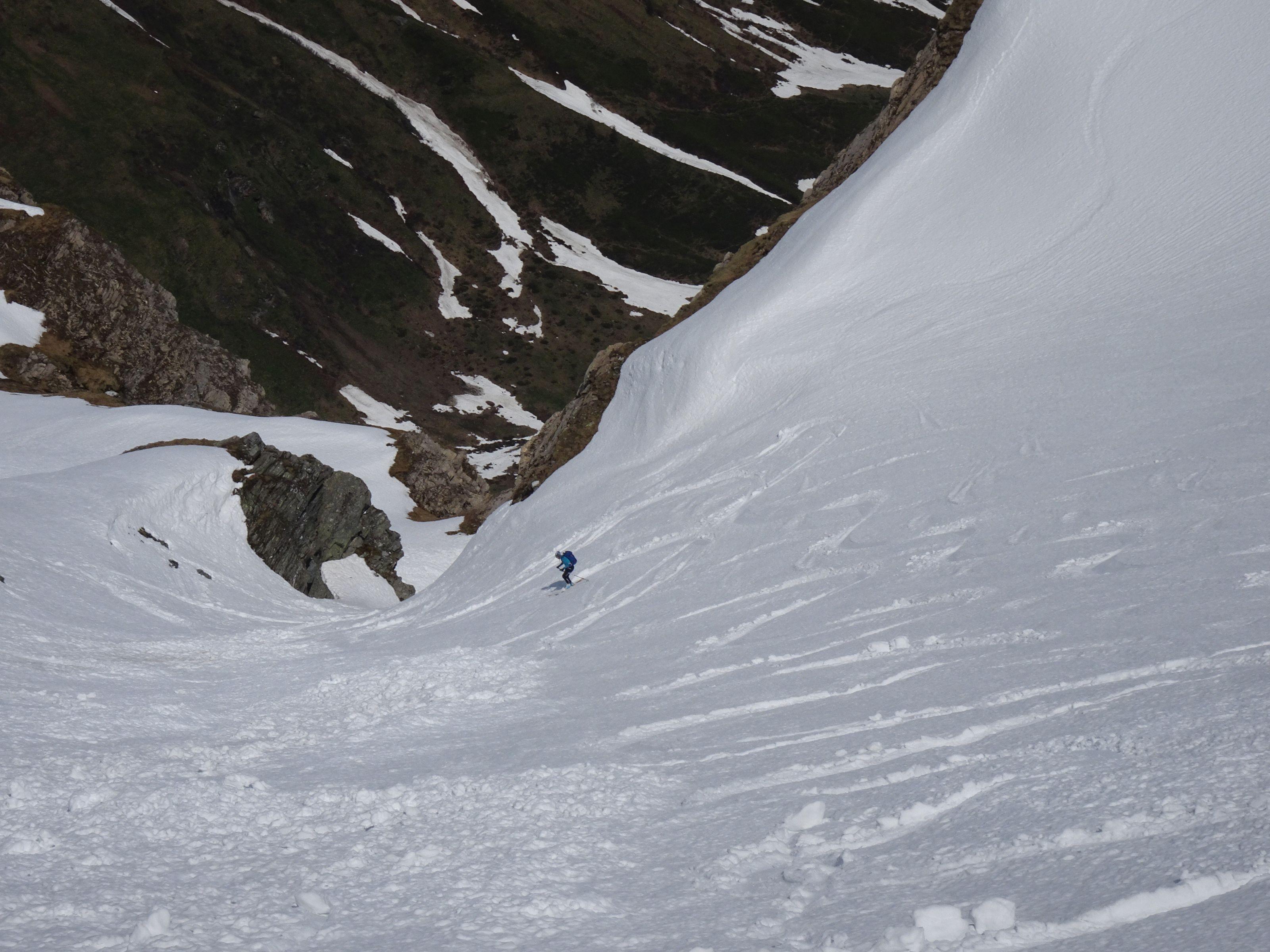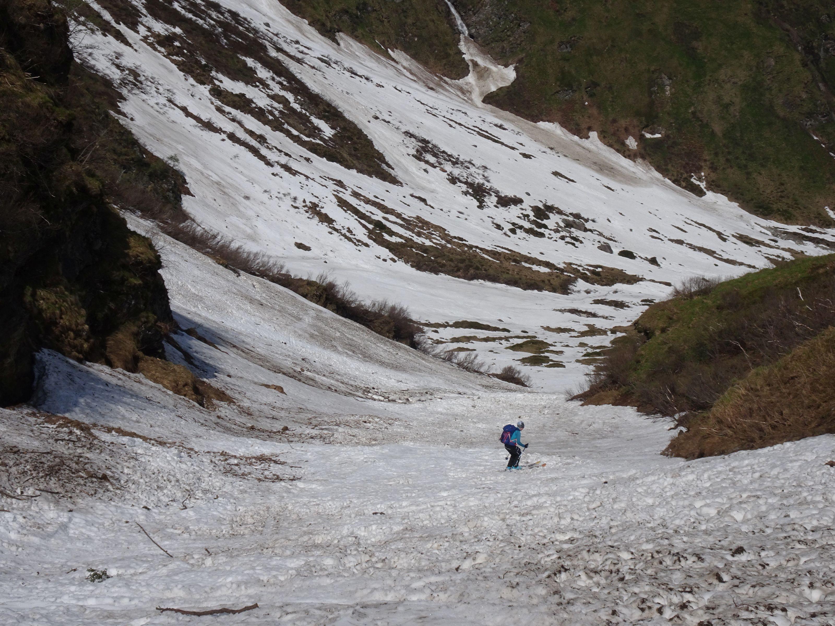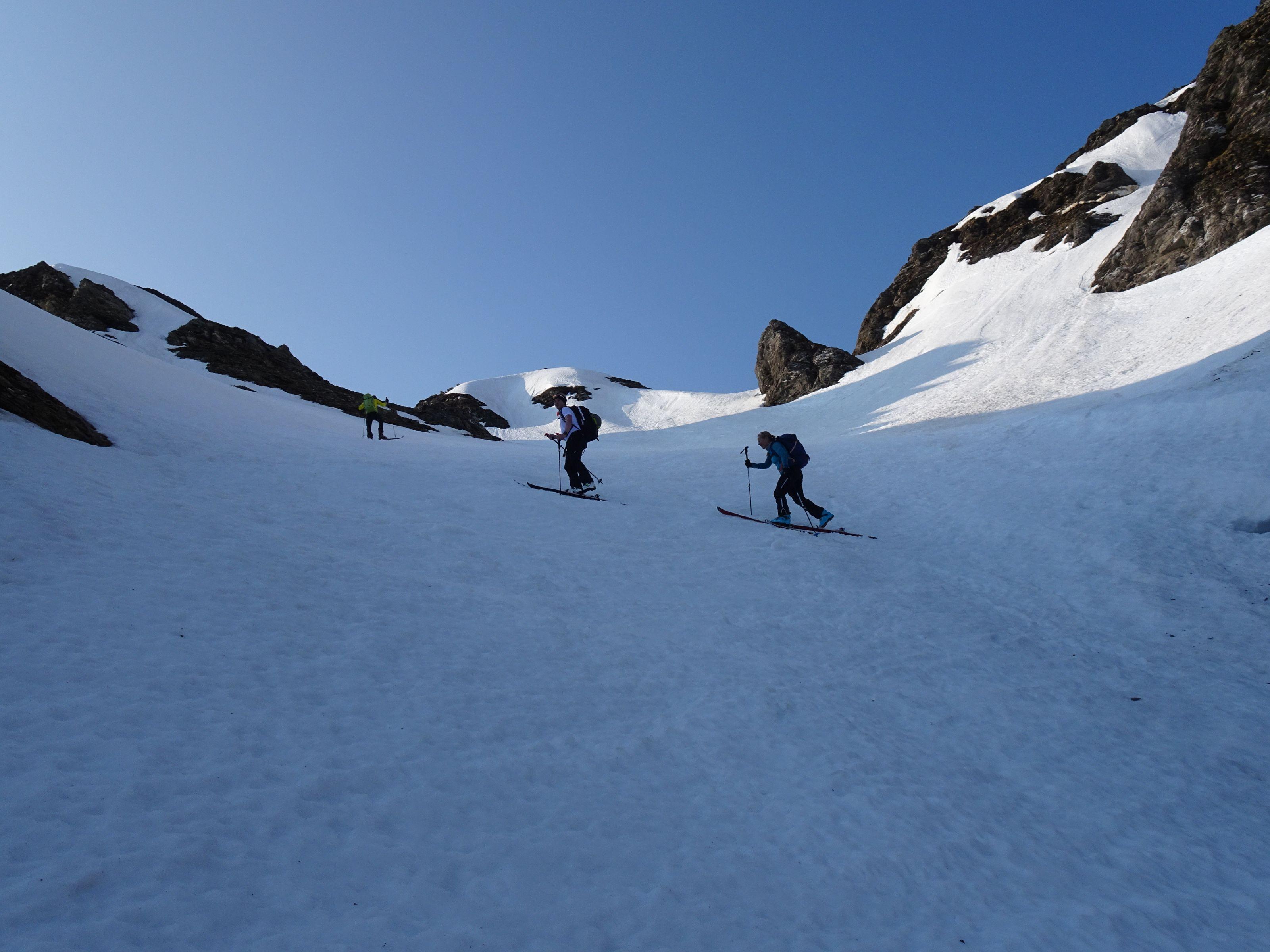 Start um 5 30 bei 5° im Talschluß/ Alm, nun noch 10 Min. zum Schnee u Ski anschnallen. Schneefläche leicht angefeuchtet, steile Passage griffig. Ab der Scharte leichter Wind, Harschdeckel, ein müheloser Aufstieg, es waren keine Harscheisen notwendig. Am Gipfel angenehme Temperatur, prächtige Kulisse. Querung zur Wallnerrinne sehr tief! Rinne schmiert gut, wie immer liegen im letzten Teil Steine. Insgesamt liegt noch sehr viel Schnee. Die Geisel ist im Juni immer ein lohnedes Ziel, ohne großen Aufwand und geht noch länger. Ein Hacken ist das Fahrverbot und der Fußmarsch zurück.