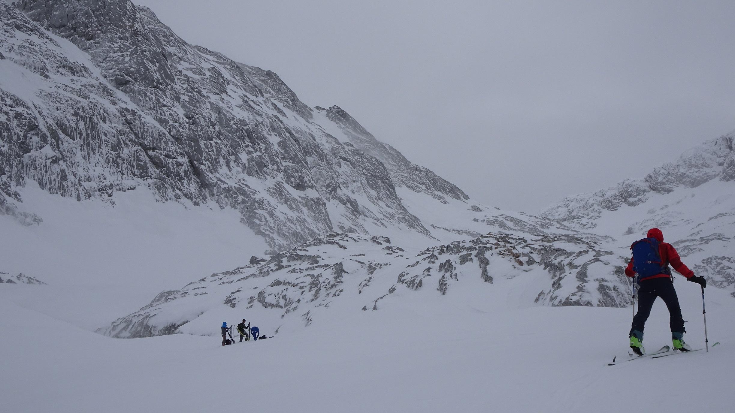 Vom Parkplatz an liegt genügend Schnee, die Ski können abgesehen von der kurzen Wandquerung stets an den Füßen bleiben. Schnee selbst am Anfang noch recht nass, wird aber oberhalb von 1500m zu festem Pulver. Bereits ab 2000m kleine Verfrachtungen, vor allem in den steileren Passagen unterhalb der Göllscharte (dort schon relativ groß).