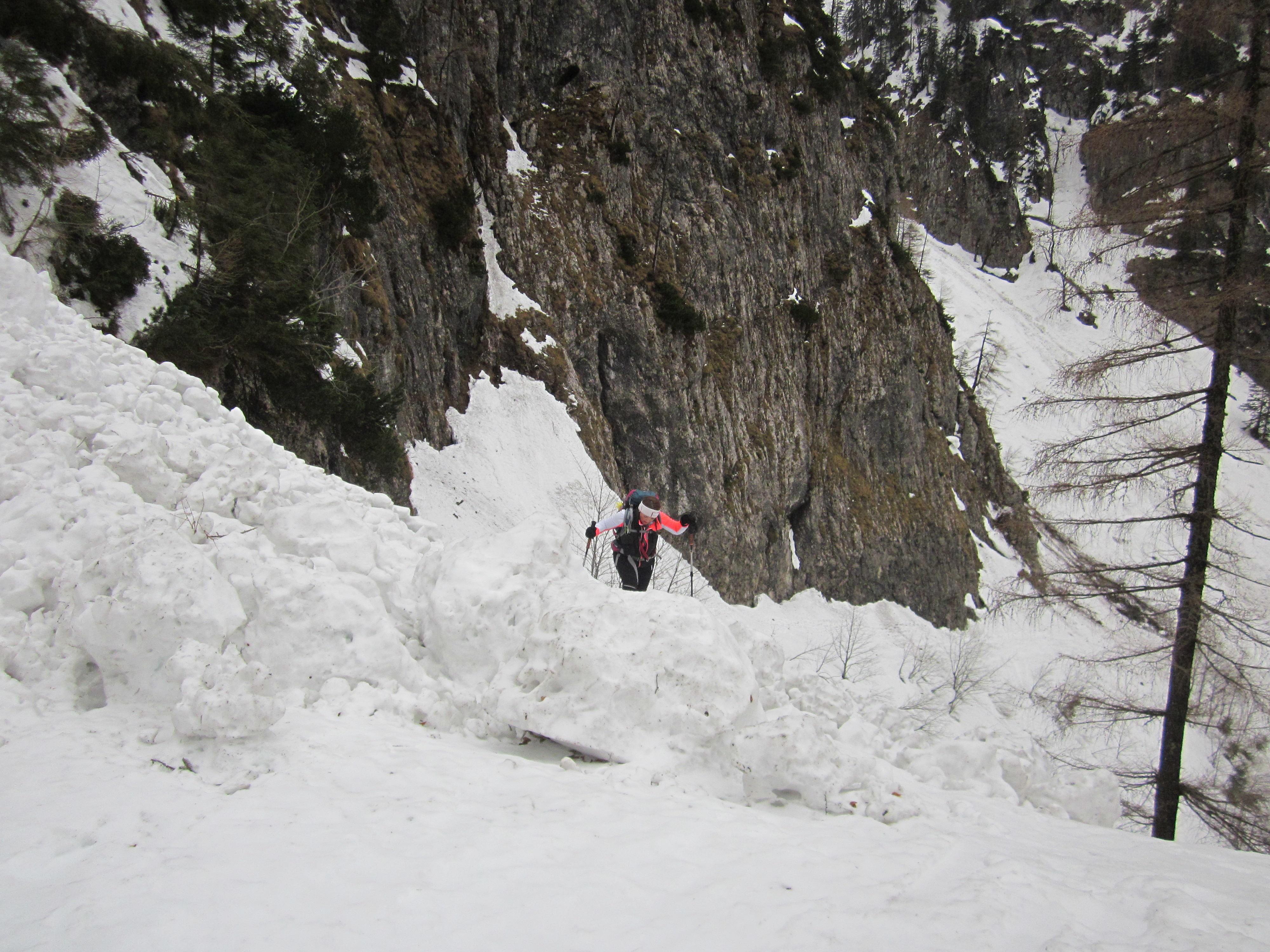 Seitlich sind noch große Schneemengen im Steilgelände vorhanden. D. h. Vorsicht die nächsten (warmen) Tage!
