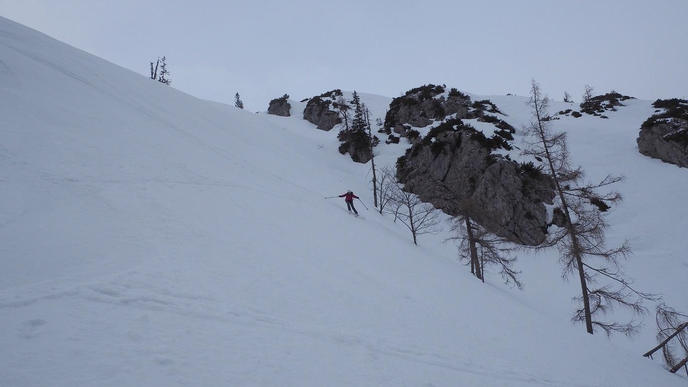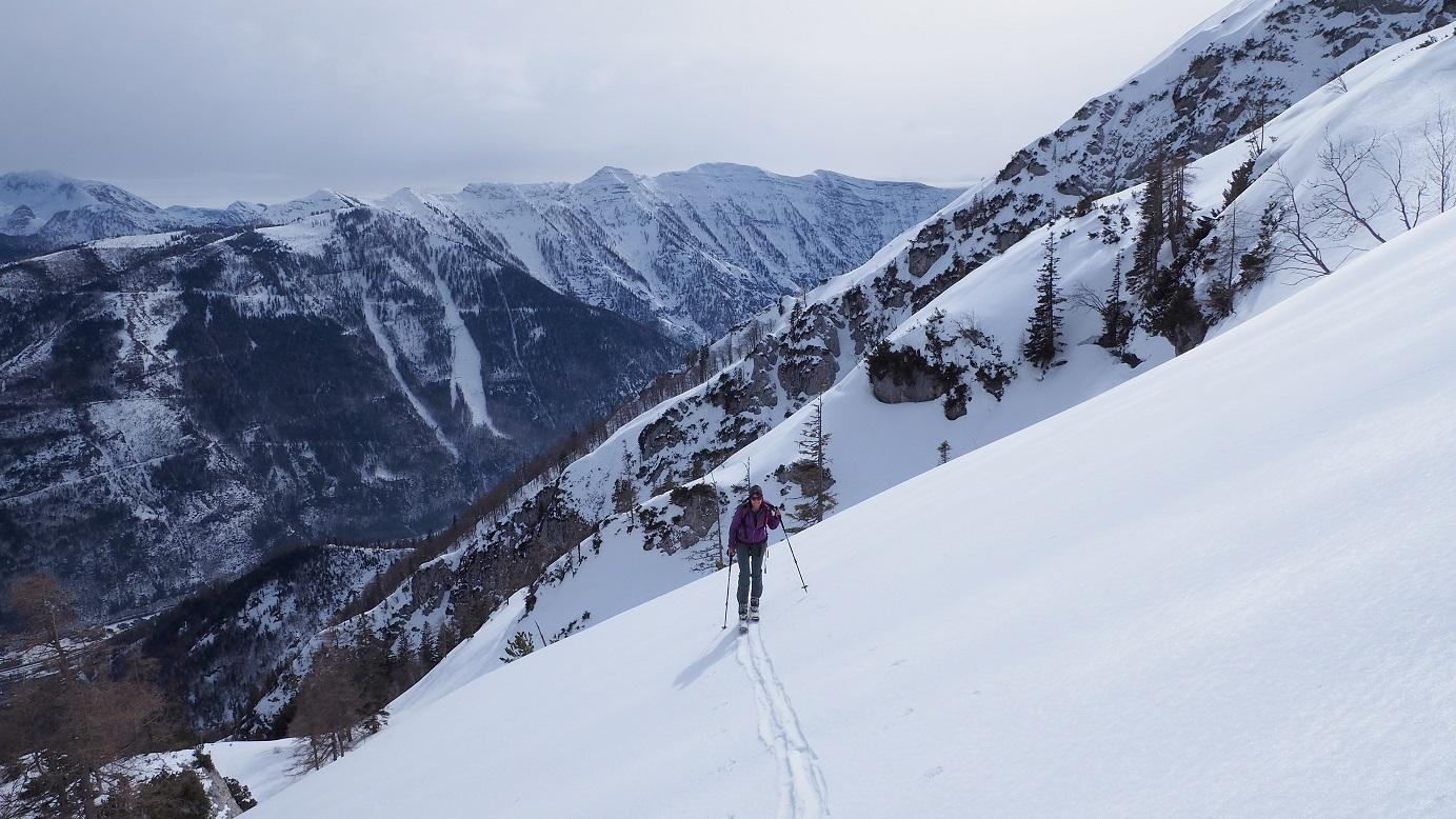 Das Wetter sollte passen, auch der viele Schnee dieses Jahr. So fahren wir nach Ebensee mit dem ungewöhnlichen Skitourenziel Erlakogel. Als wir den Berg sehen trifft uns fast der Schlag, kaum bis gar kein Schnee. Also umdisponieren und von Steinkogl rauf aufs Feuerkogelplateu. Eine weise Entscheidung - eine grandiose Tour mit gewaltigen Steilhängen jenseits der 50° und bester Firn von oben bis unten, zudem völlig einsam.