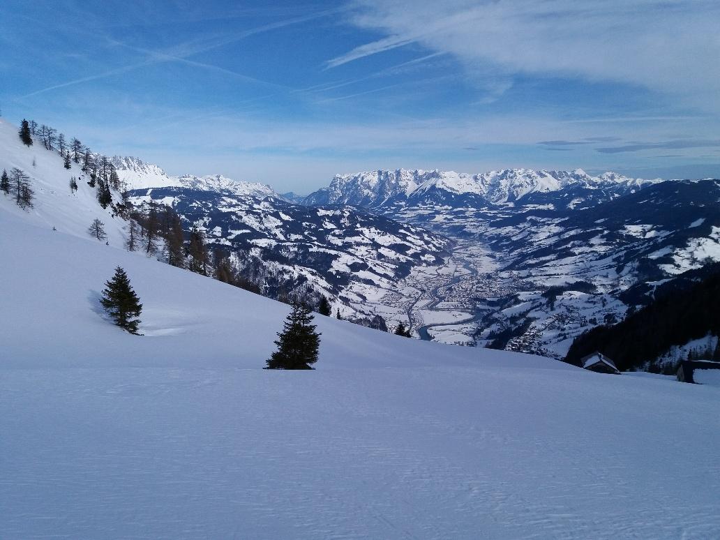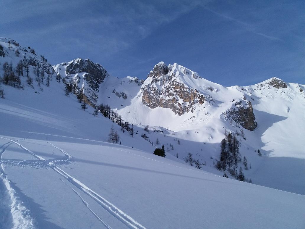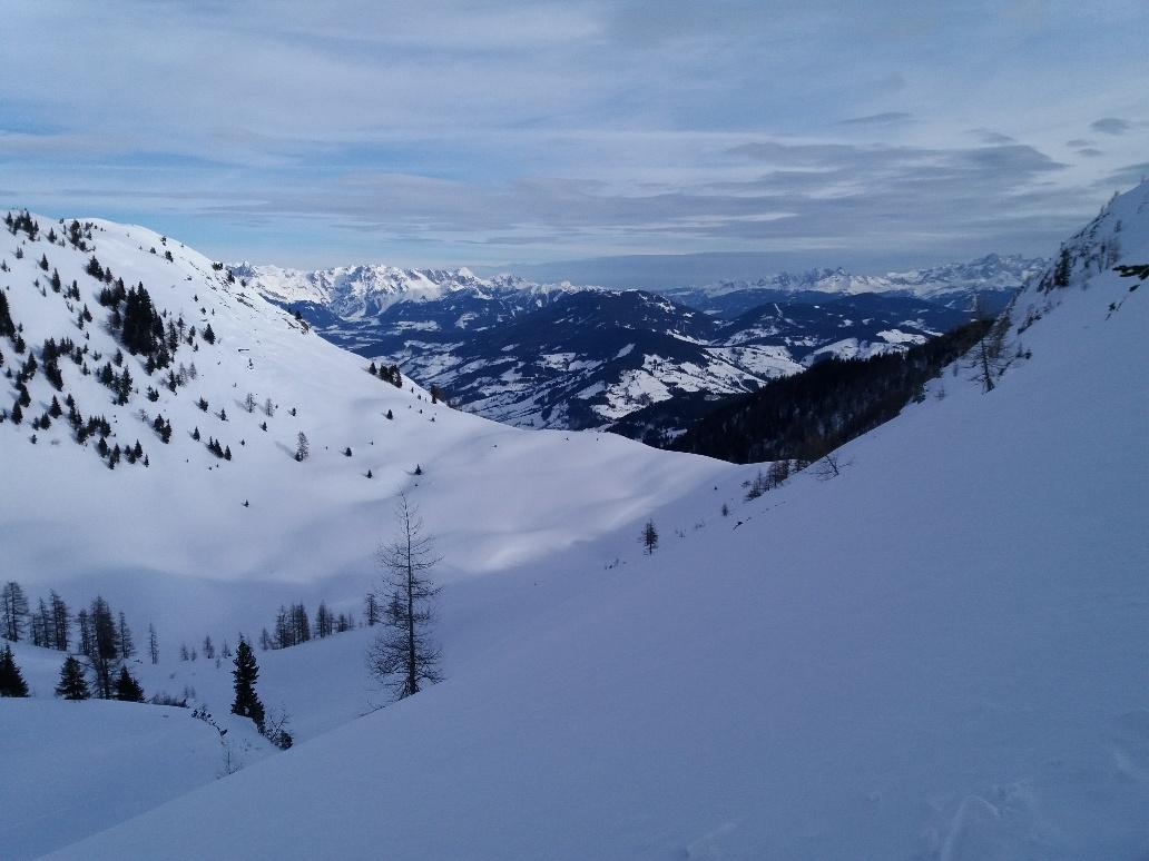Vom Parkplatz Himmelsknoten/Holzlehen in Großarl, Ortsteil Schied durchs Nigltal auf den Schober. Die zu rechter Seite südseitig ausgerichteten Hänge sind großteils entladen. Im oberen Bereich kommt Wind auf und es kündigt sich die Wetterveränderung an. Der Schnee war nahezu im ganzen Kar perfekt zu fahren, herrlicher Pulver sogar über die Tennalm hinunter bis nach St. Johann auf 800 Meter noch Rauhreifraschelpulver.