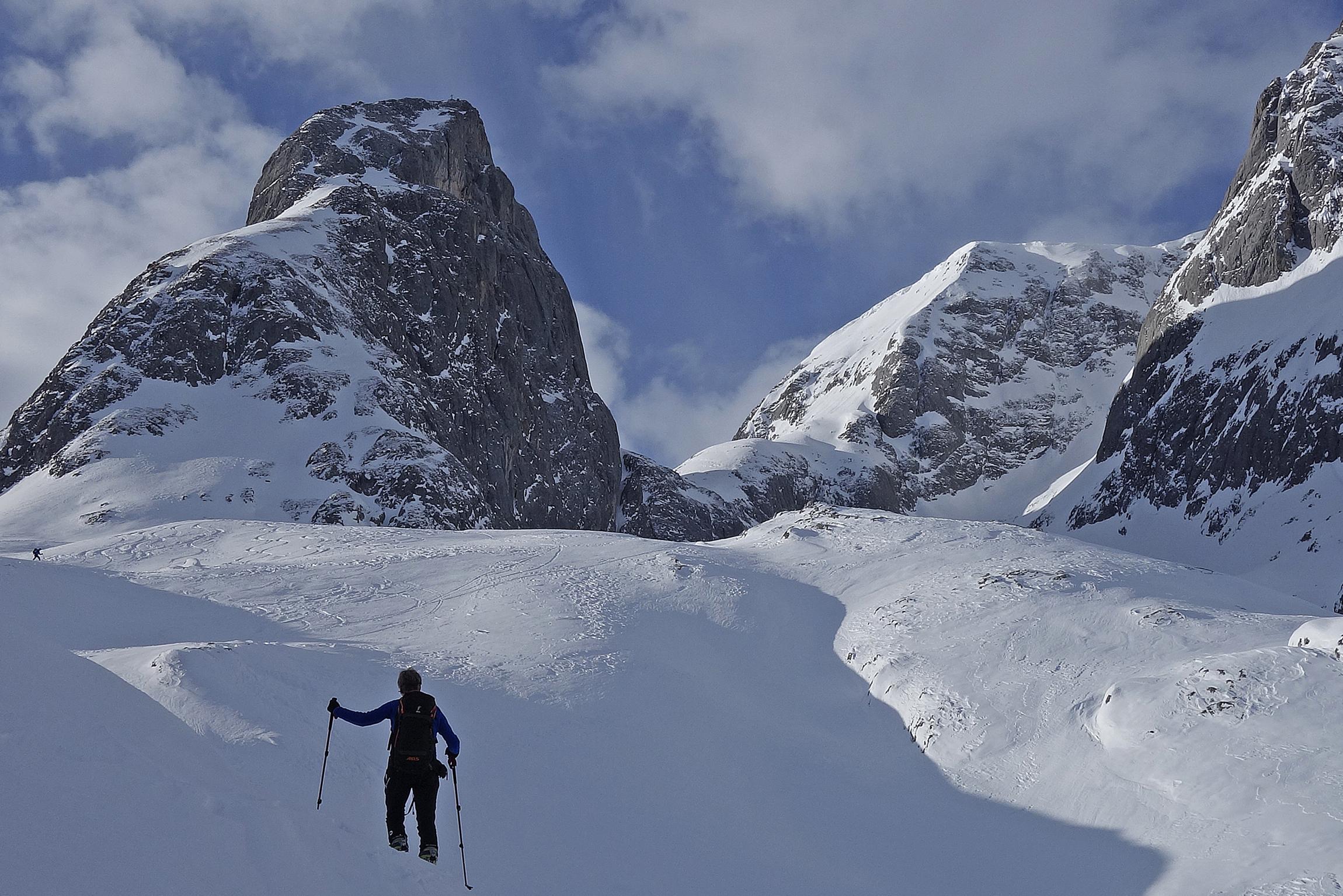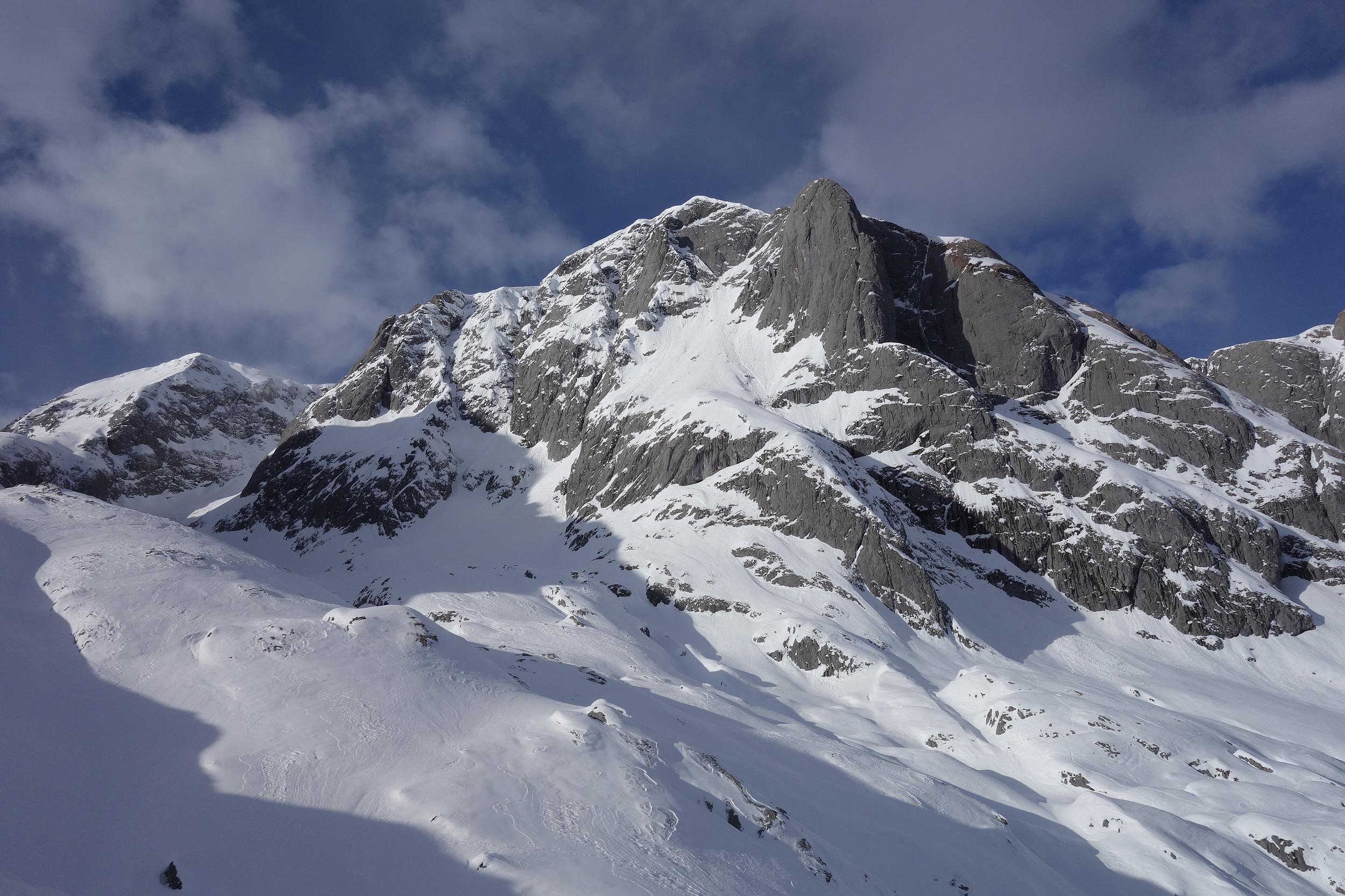 Heute bis zum Wandfuß der Torsäule. Das Wetter recht gemischt, Sonne und Wolken wechseln ständig, kalter Wind empfängt uns im Ochsenkar, der Schnee bunt gemischt, Bruchharsch an den Südseiten, Pulverschnee in absolut schattigen und windgeschützen Hängen, sonst über weite Strecken Windharsch. Die Schneeklamm, an der Nordseiter der Mandlwände ,bekannt als feine Pulverschneetour, hat sich total entladen, über gefrorenen, mächtigen Lawinenkegel ist das Queren ins Ochsenkar äußerst unbequem. Vom ursprünglichen Ziel Eiskarl haben wir abgelassen, das schattige, windgepresste Kar konnte uns nicht locken, sind der Sonne treu geblieben.