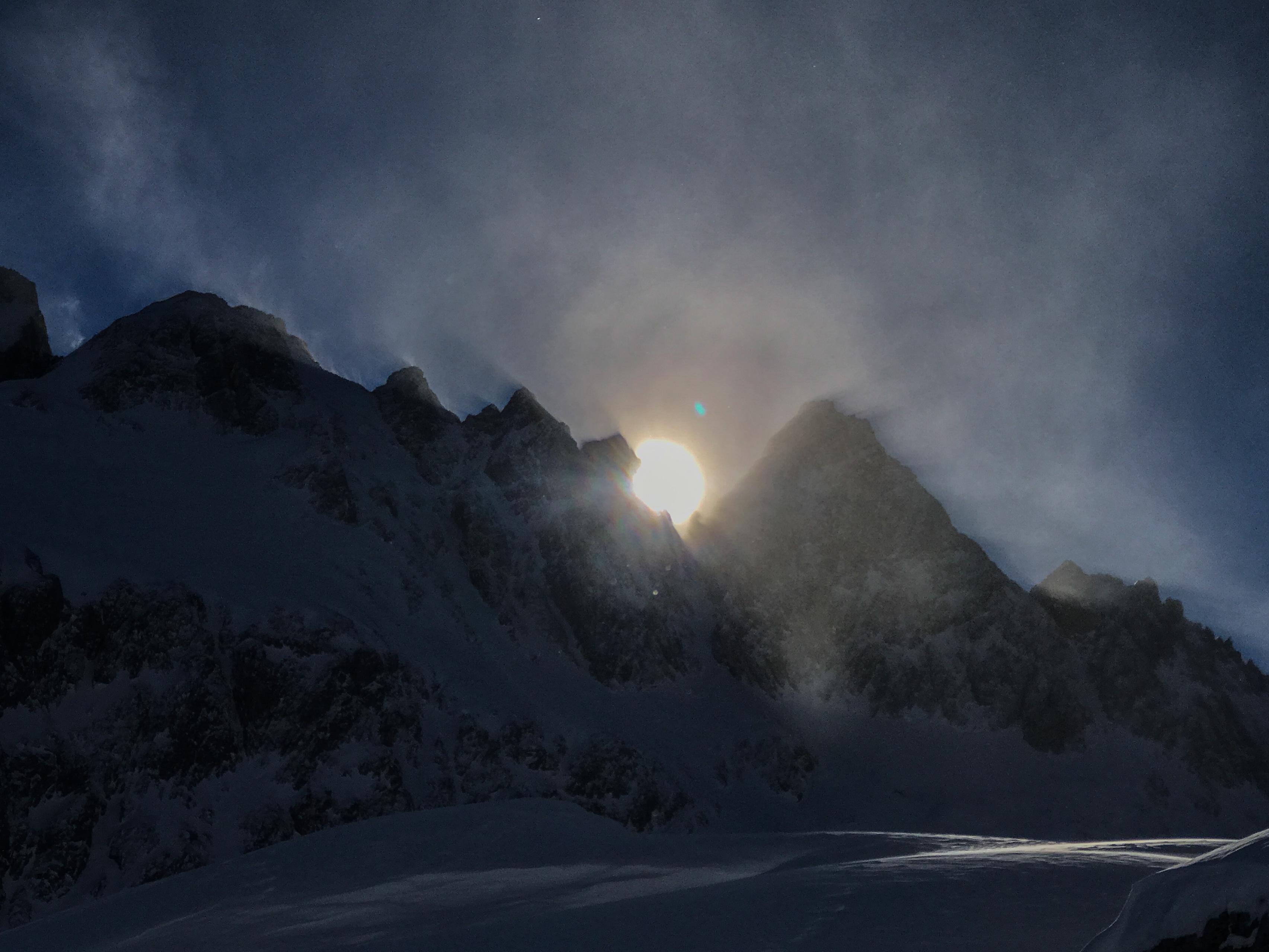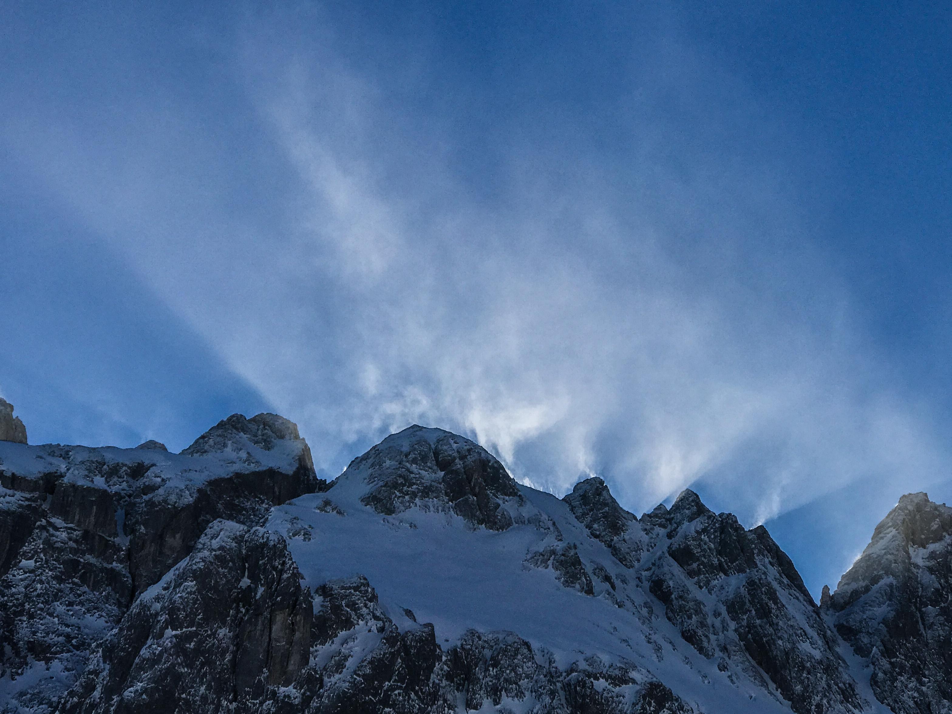zweitens der Wind langsam wirklich unangenehm wurde und aufgrund der Schneefahnen über den Gipfeln auch keine Besserung zu erwarten war