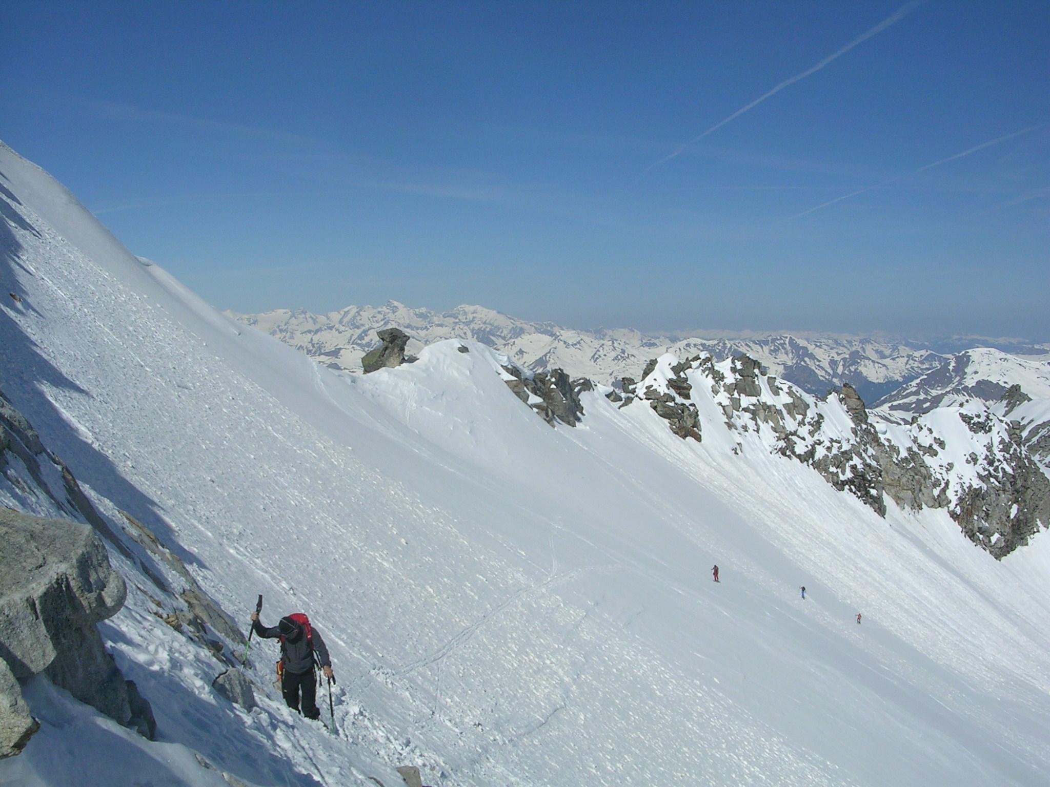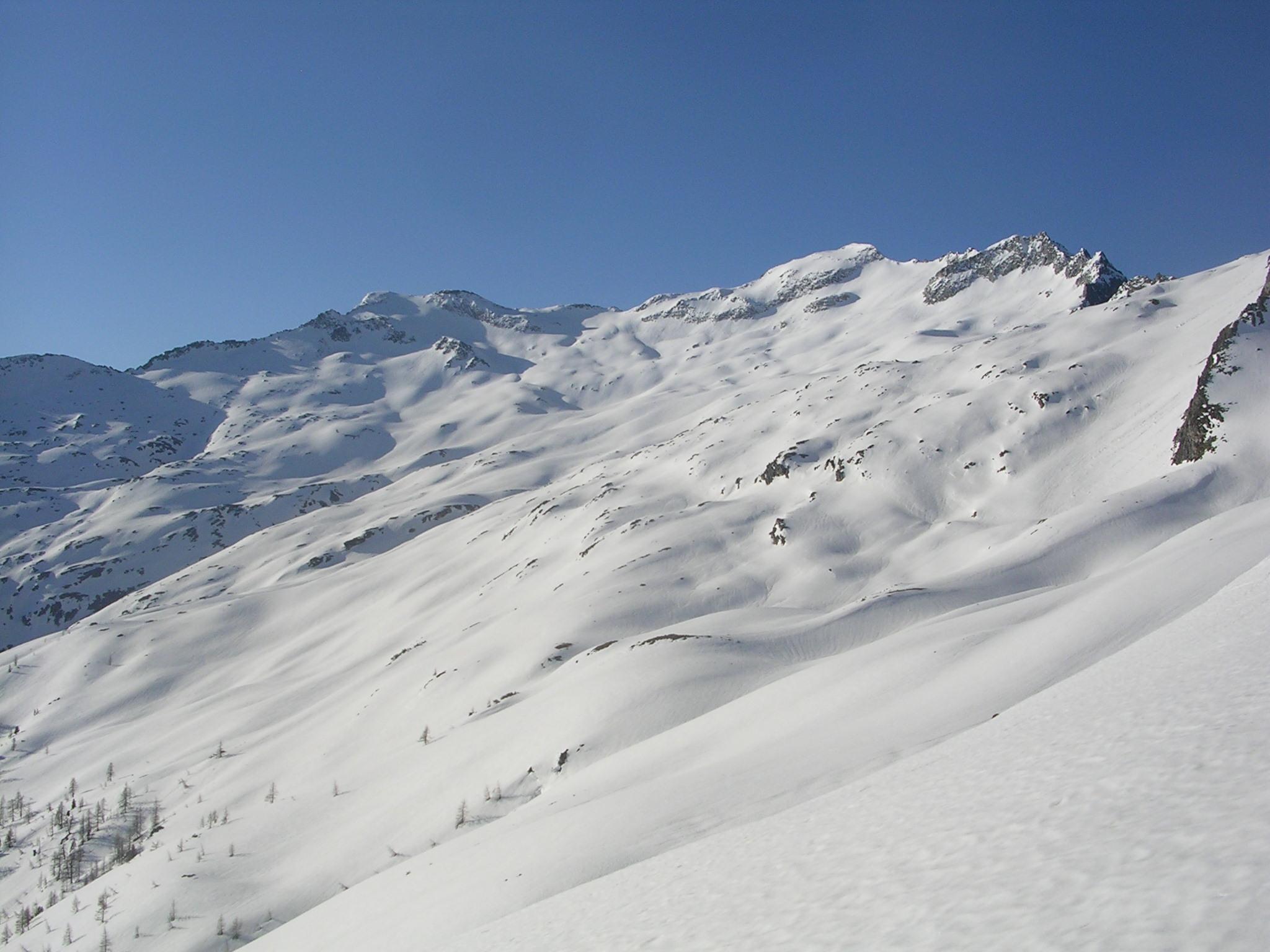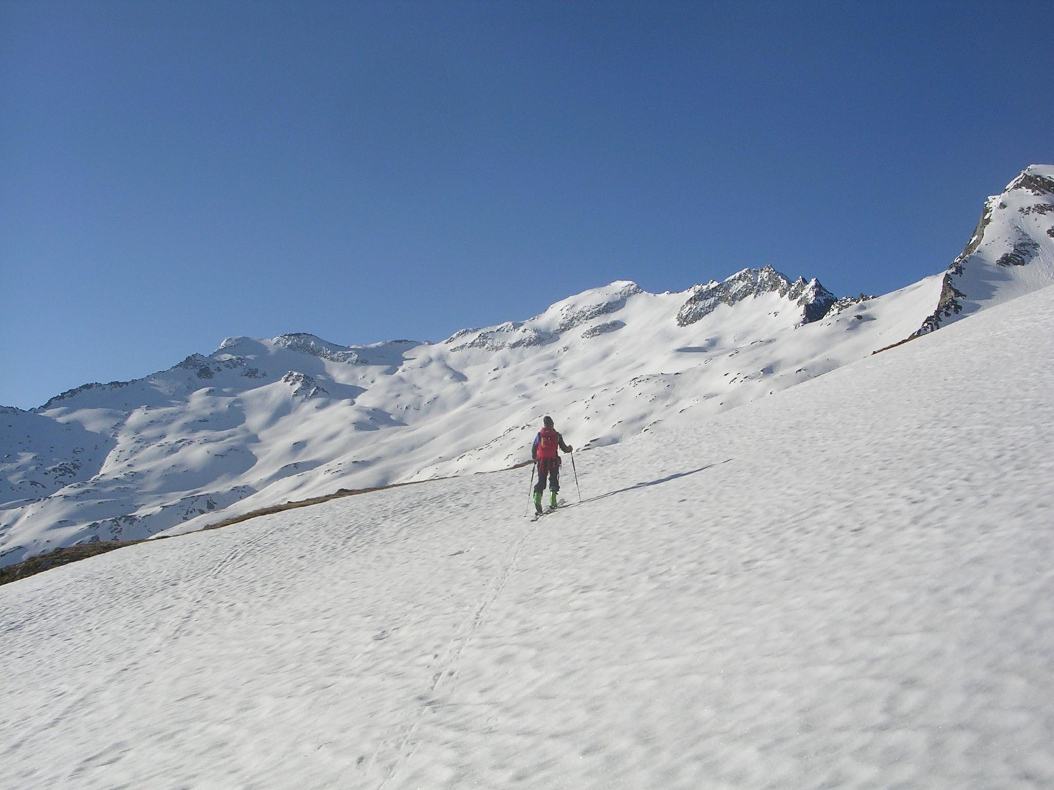 Vom Talwirt auf die Modereggalm, brauchbarer Schnee beginnt erst kurz vor der Alm. Vorher viel Dreck und morsche Schneereste. Ab der Alm viel Schnee und perfekte Verhältnisse, abgesehen von einer kurzen Zwischenabfahrt während der langen Querung, die in der Früh schon relativ instabil wirkte.