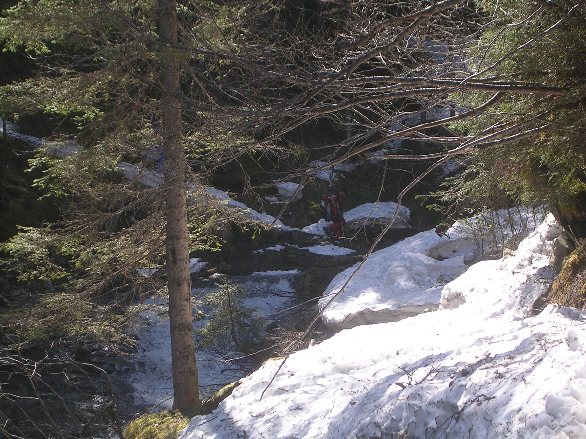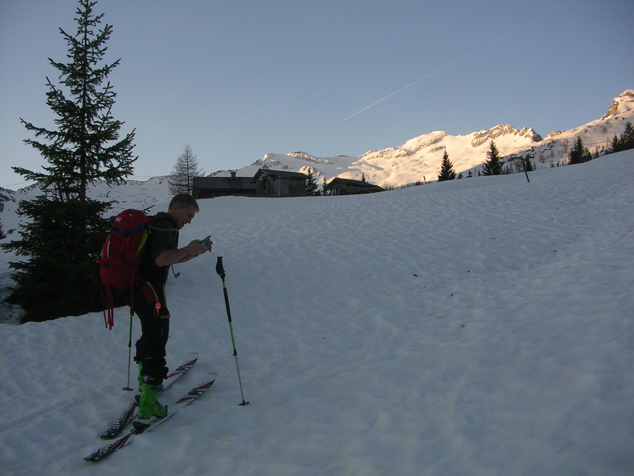 Da wir nicht am späteren Vormittag an den Osthängen vorbei zurück zur Modereggalm wollten, sind wir direkt abgefahren, ohne GPS-Unterstützung wäre es aber schwierig gewesen, den Fußweg ins Tal zu finden. Der Schnee reichte gerade noch bis zum Anfang des verfallenden Weges, am Ende aber schon mit tiefen Löchern.