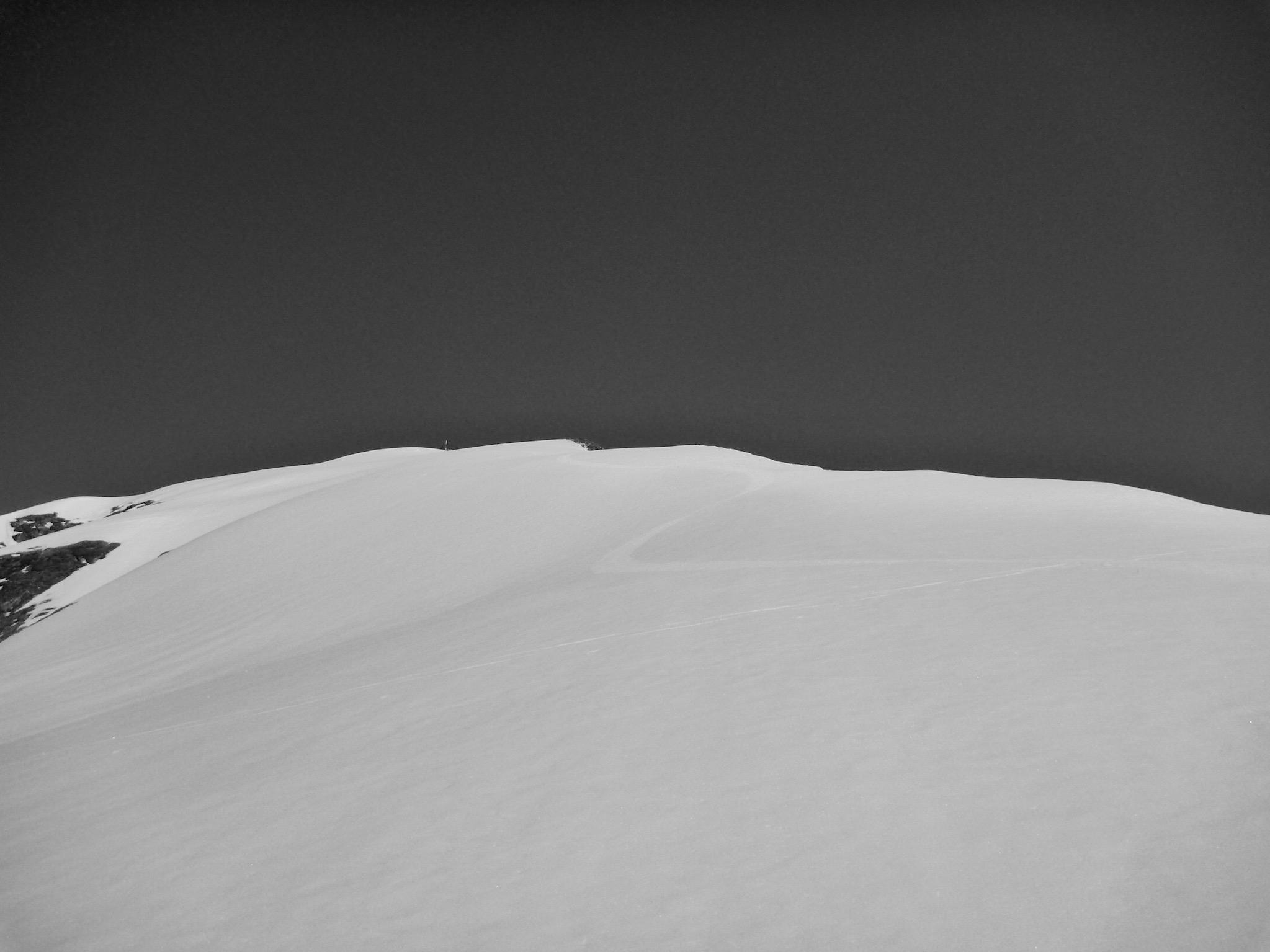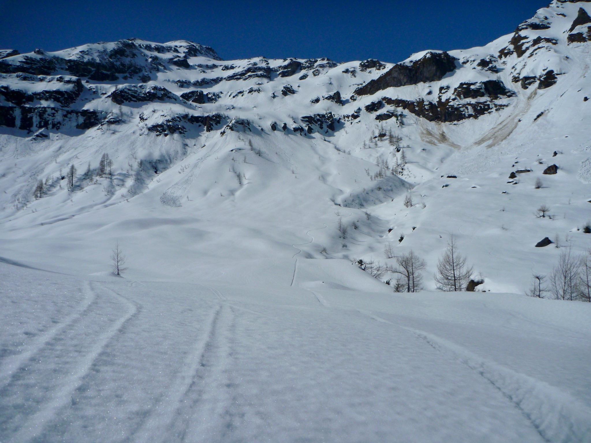 Verhältnisse: morgendlicher Harschdeckel, ab 10:00 Firn bzw. Sulz unter 1800m; Steigeisen braucht man trotzdem nicht, denn wenn man abschnallt, steht man hüft- bis schultertief im Schnee :-(