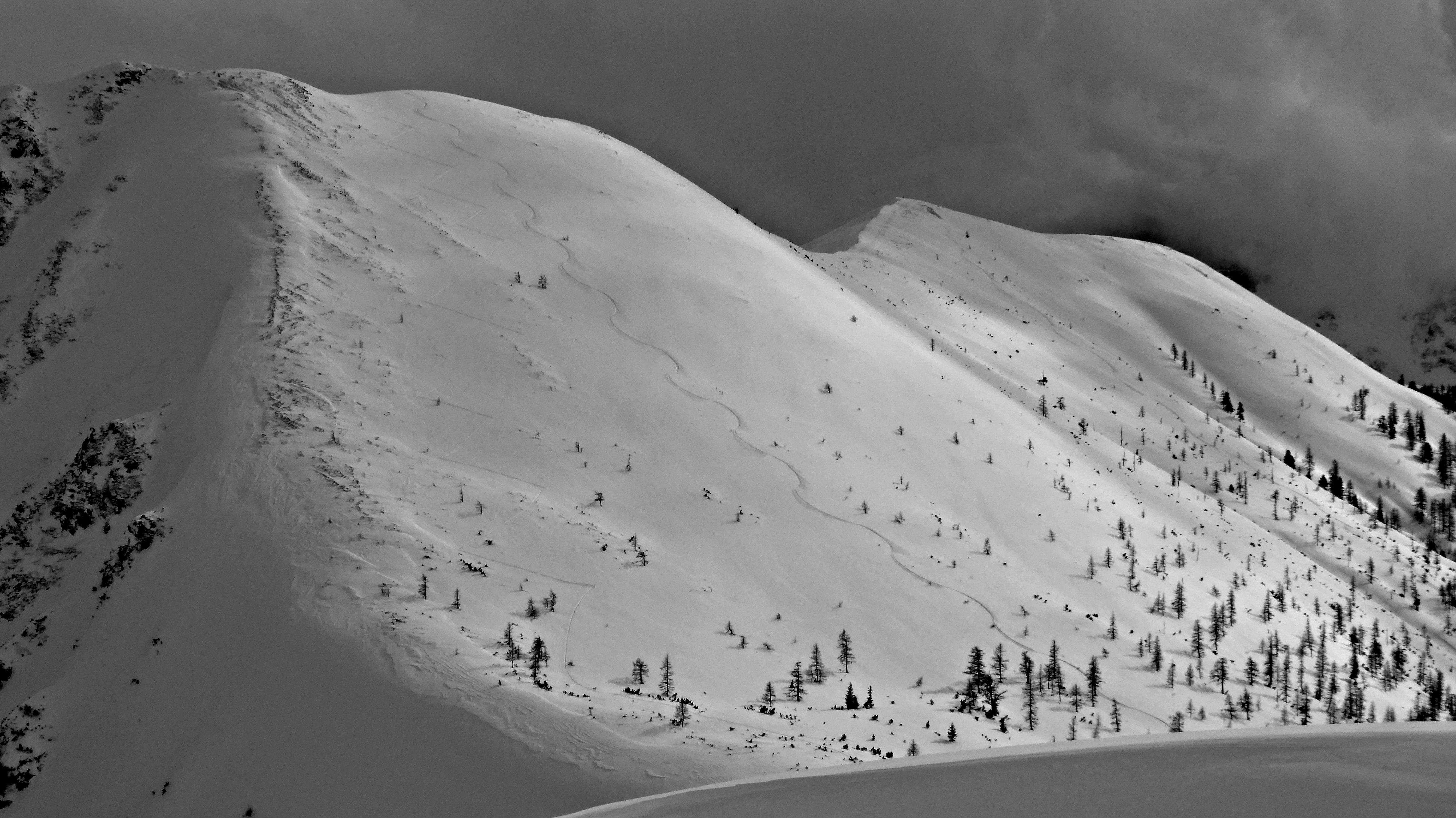 ca. 10 cm Neuschnee, der sich allerdings im Lauf des Tages auf den Sonnseiten schon wieder verabschiedet hat...auf den Schattseiten oberhalb ca. 1.500 m auch nachmittags noch pulvrig. Eigentlich hätte ich ja 20 cm bestellt gehabt...so war erhöhte Vorsicht vor überschneiten Lawinenknollen und sonstigen "sharks" angesagt.