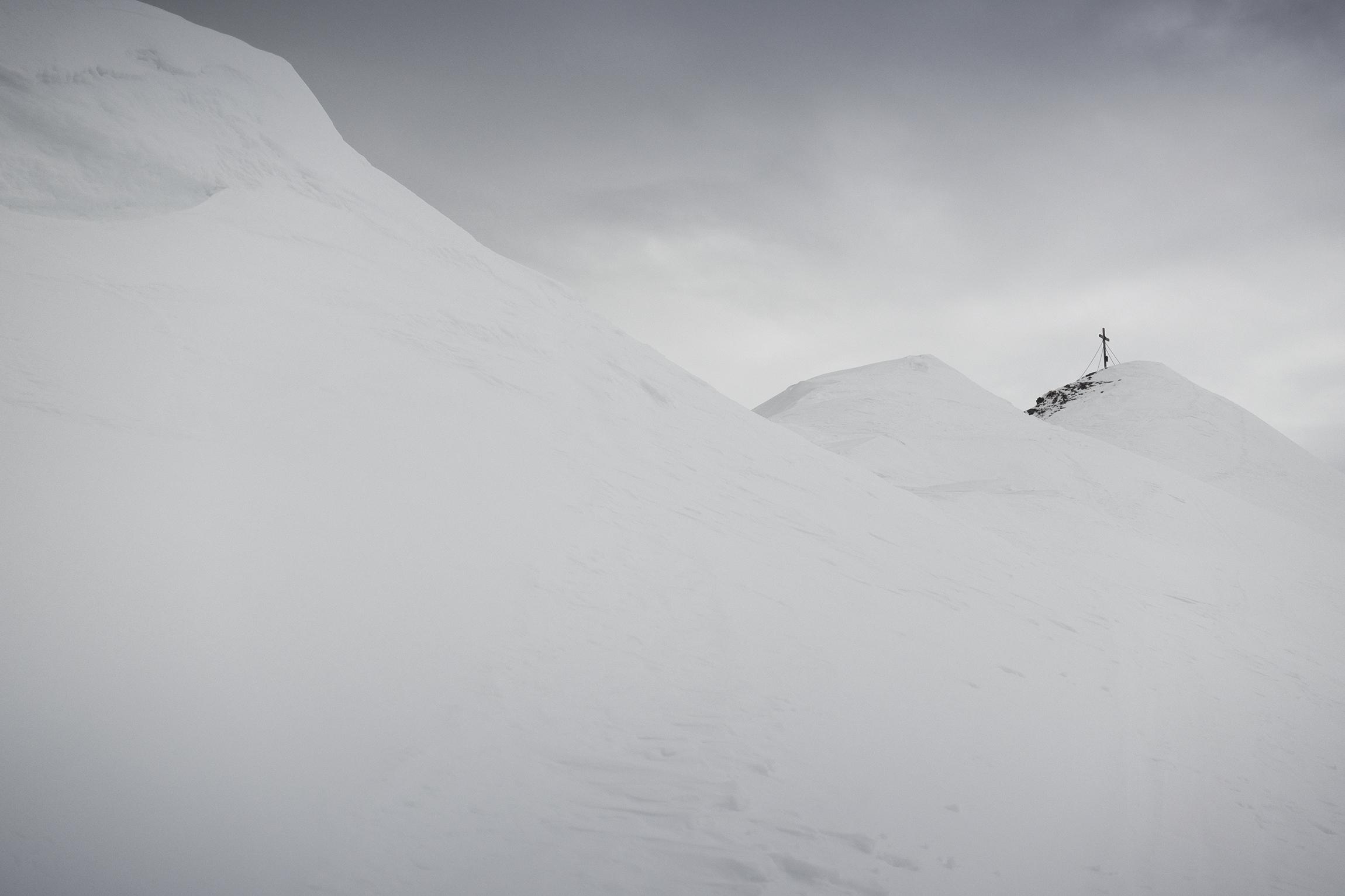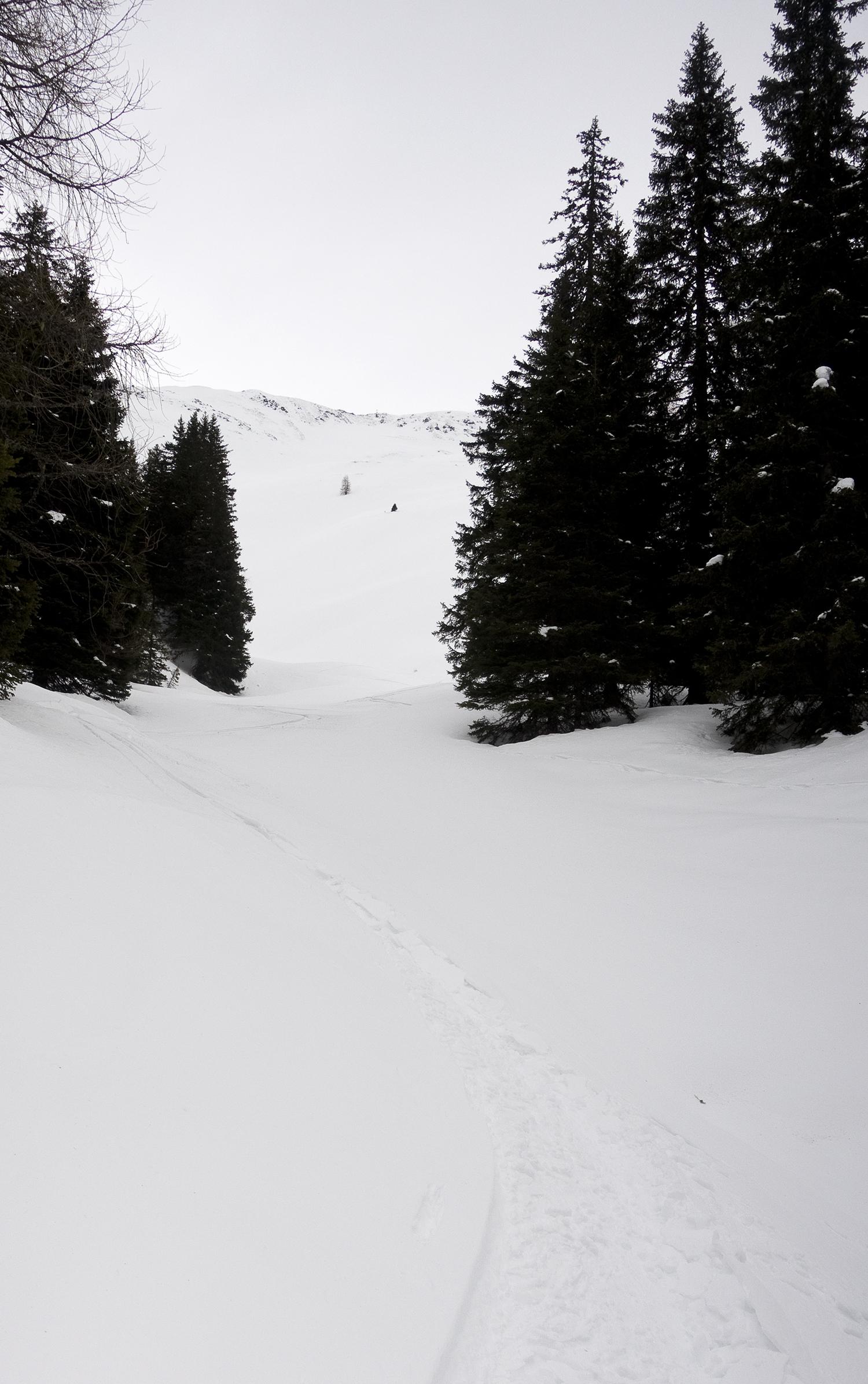 Die Kälte ist vorbei. Unter 1600m Höhe ist der Pulverschnee feucht geworden. Darüber ist es zum großen Teil windgepresst mit wenigen weichen gut fahrbaren Abschnitten. Insgesamt liegt noch richtig viel Schnee, auch ganz oben am Gratrücken.