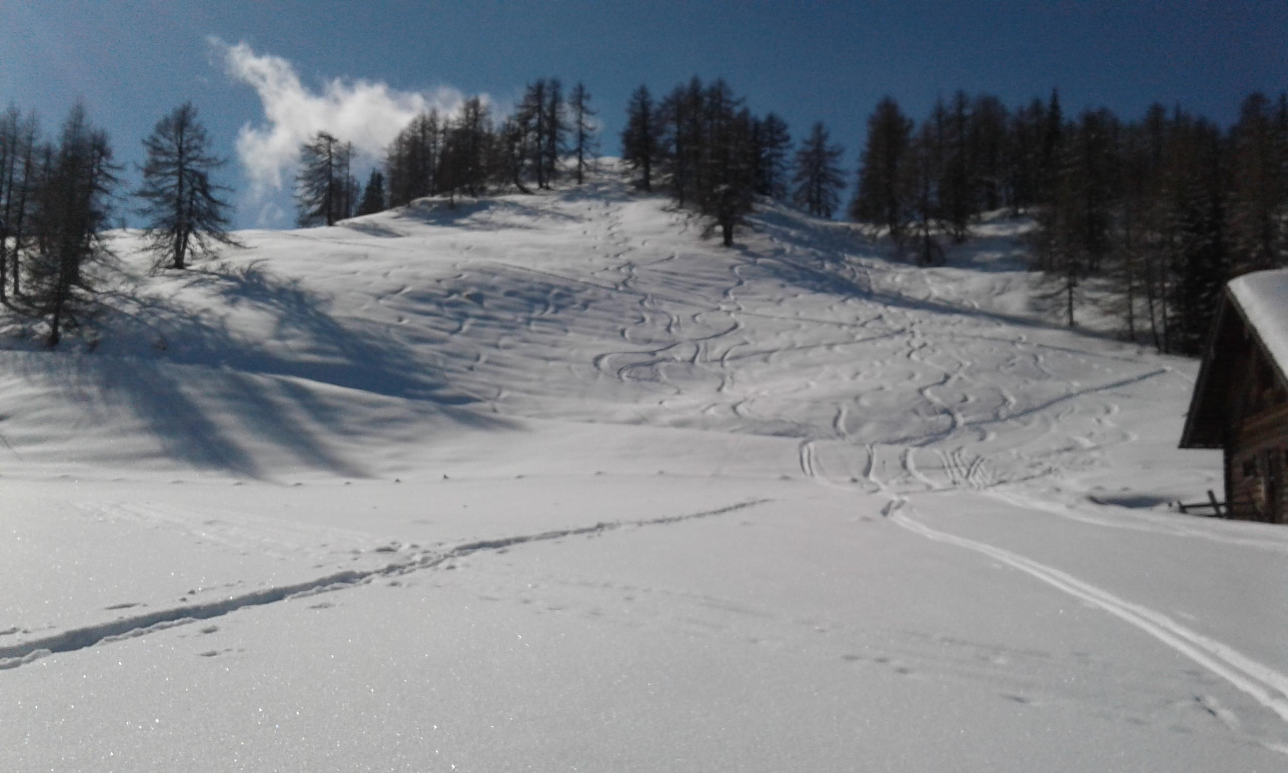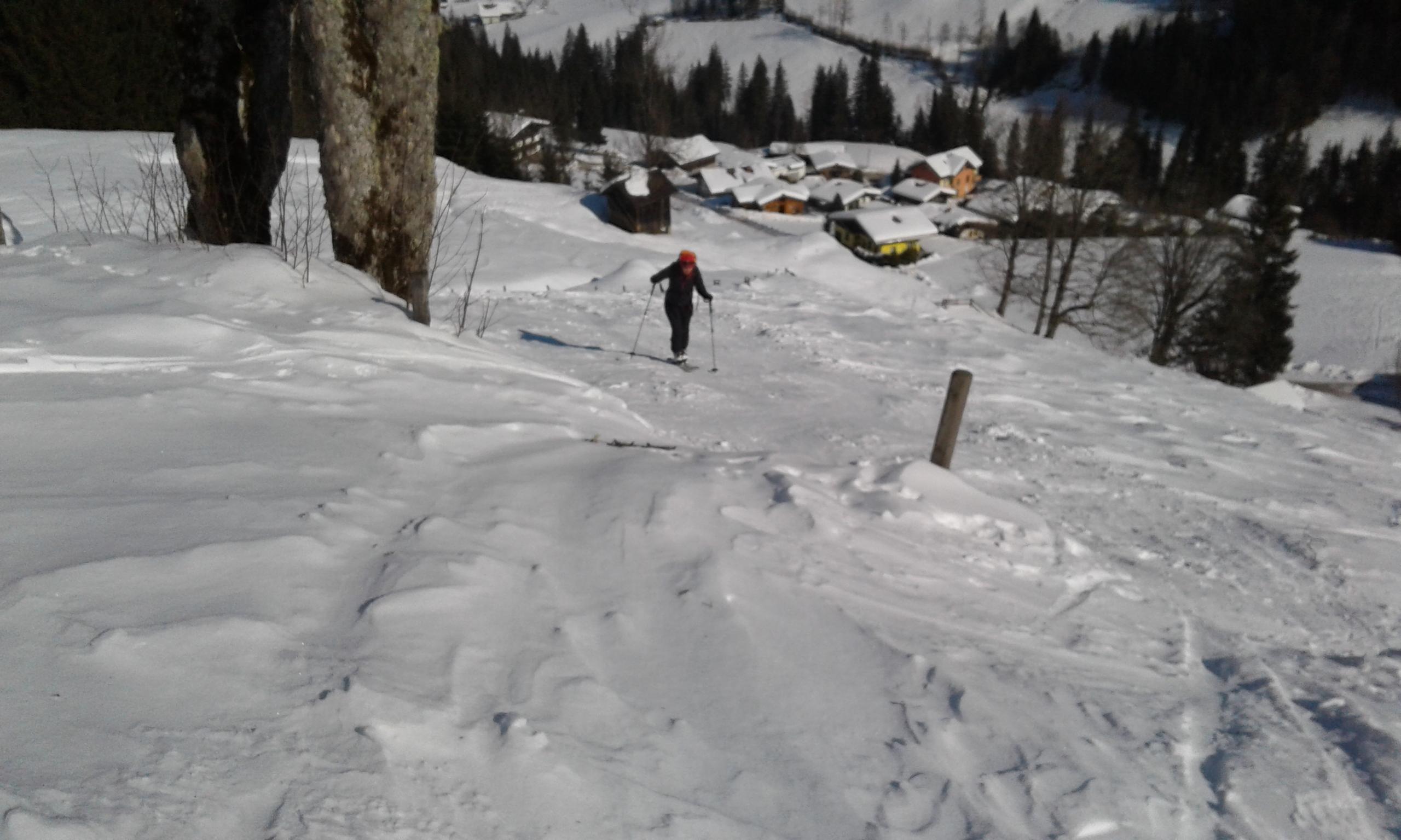 Bei der Abfahrt spüren wir jedoch die herannahende Kaltfront. Ab Sattelbauer verspurte Hänge mit alten angefrorenen Abfahrtsspuren. Vorsichtige Spurwahl von Vorteil.