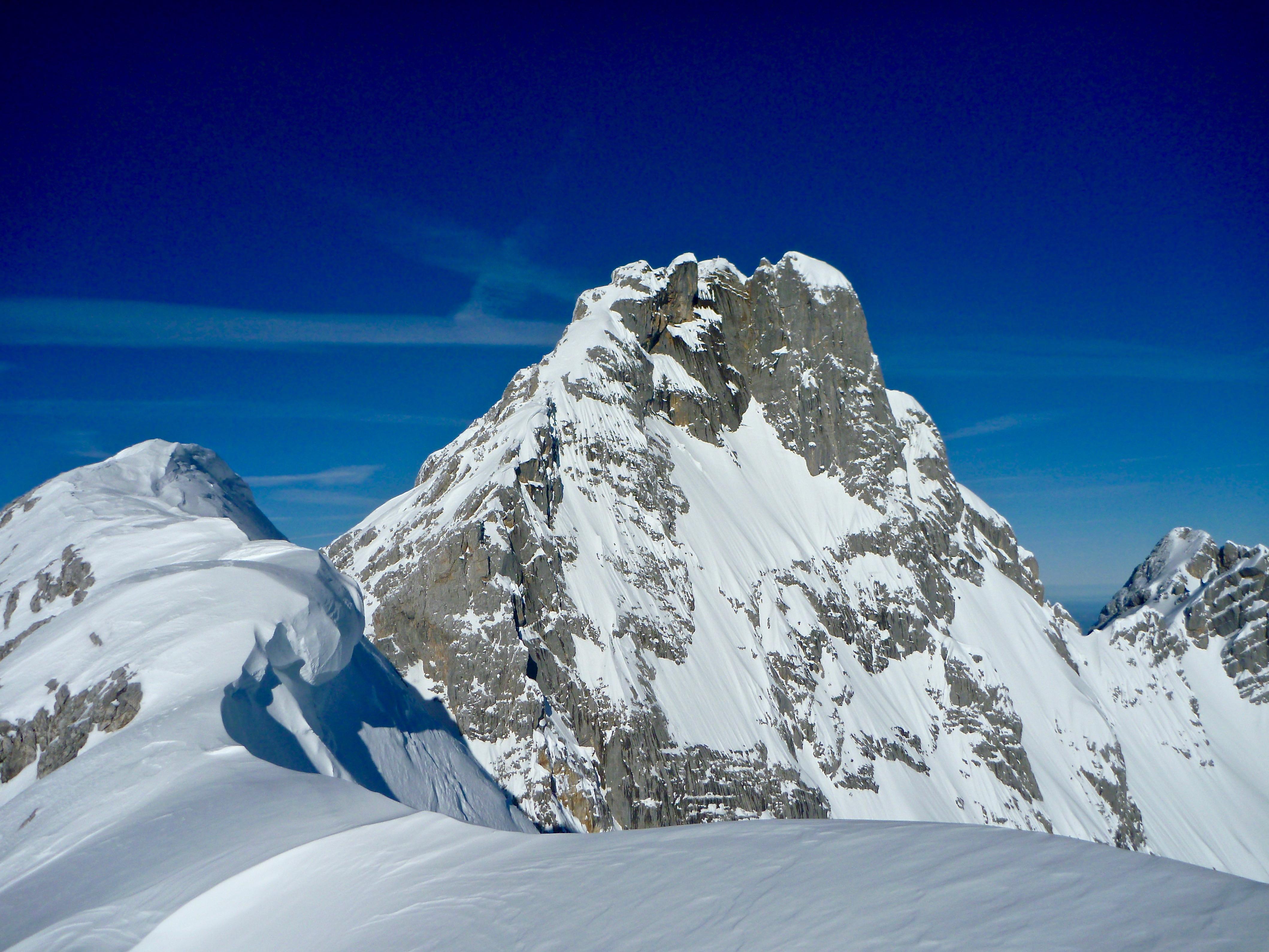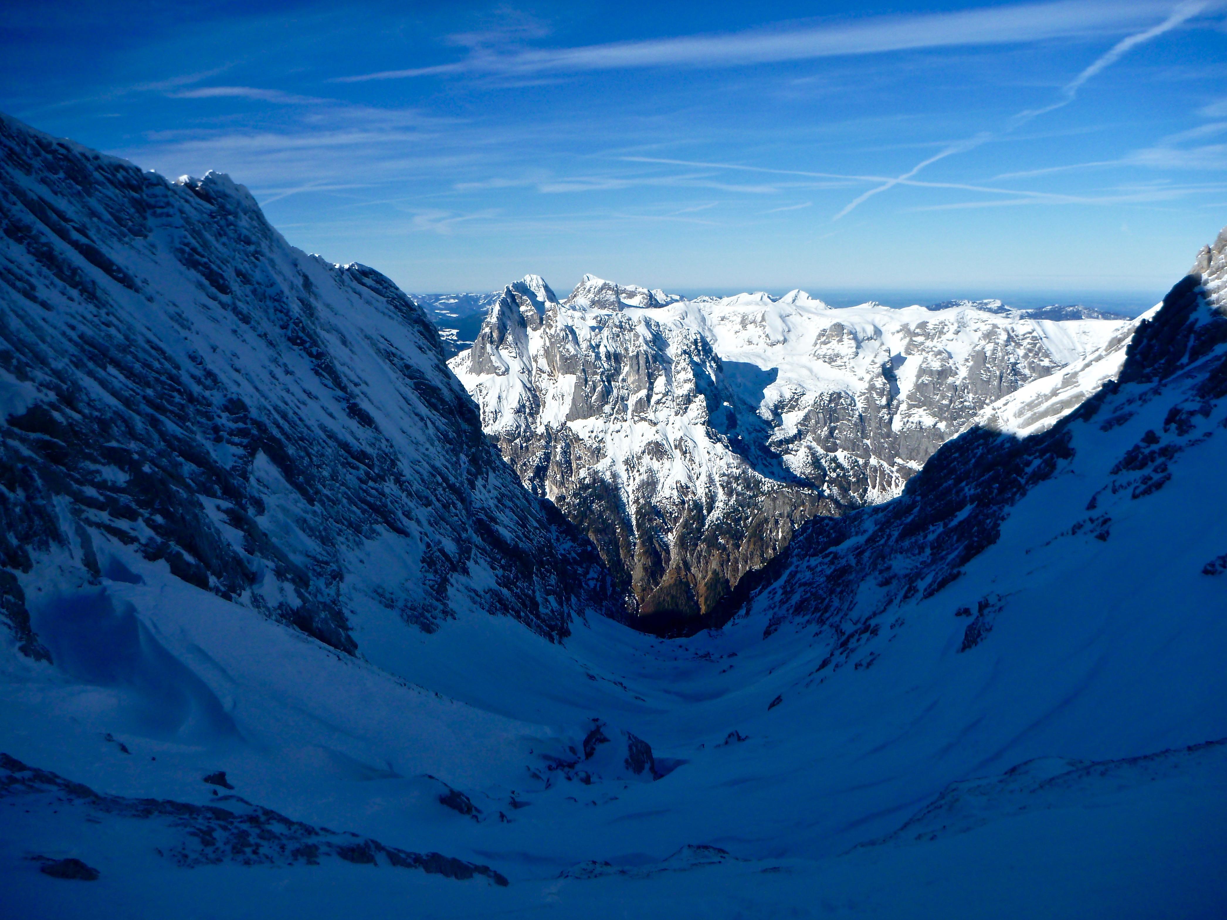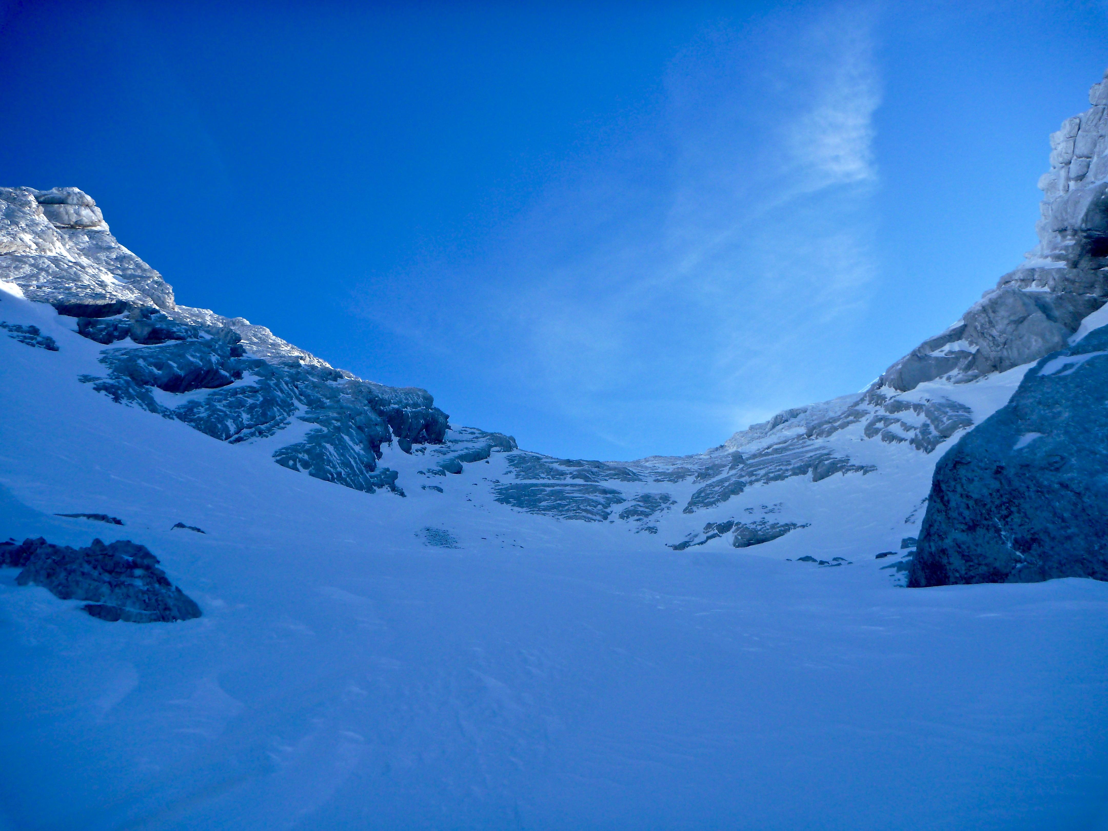 Schneeverhältnisse: Tragen bis auf fast 1400m, Abfahrt so recht und schlecht bis auf ca. 1000-1100m machbar auf kompakten Bruchharschband, im lichten Wald Regenharsch, einigermaßen erträglich, ab ca. 1900m Regeneis, kurz unterhalb Steilstufe Presspulver, Steilstufe glatt und fast aper, Gipfelhang ausgeblasen mit Presspulver, summa summarum: mühsamst