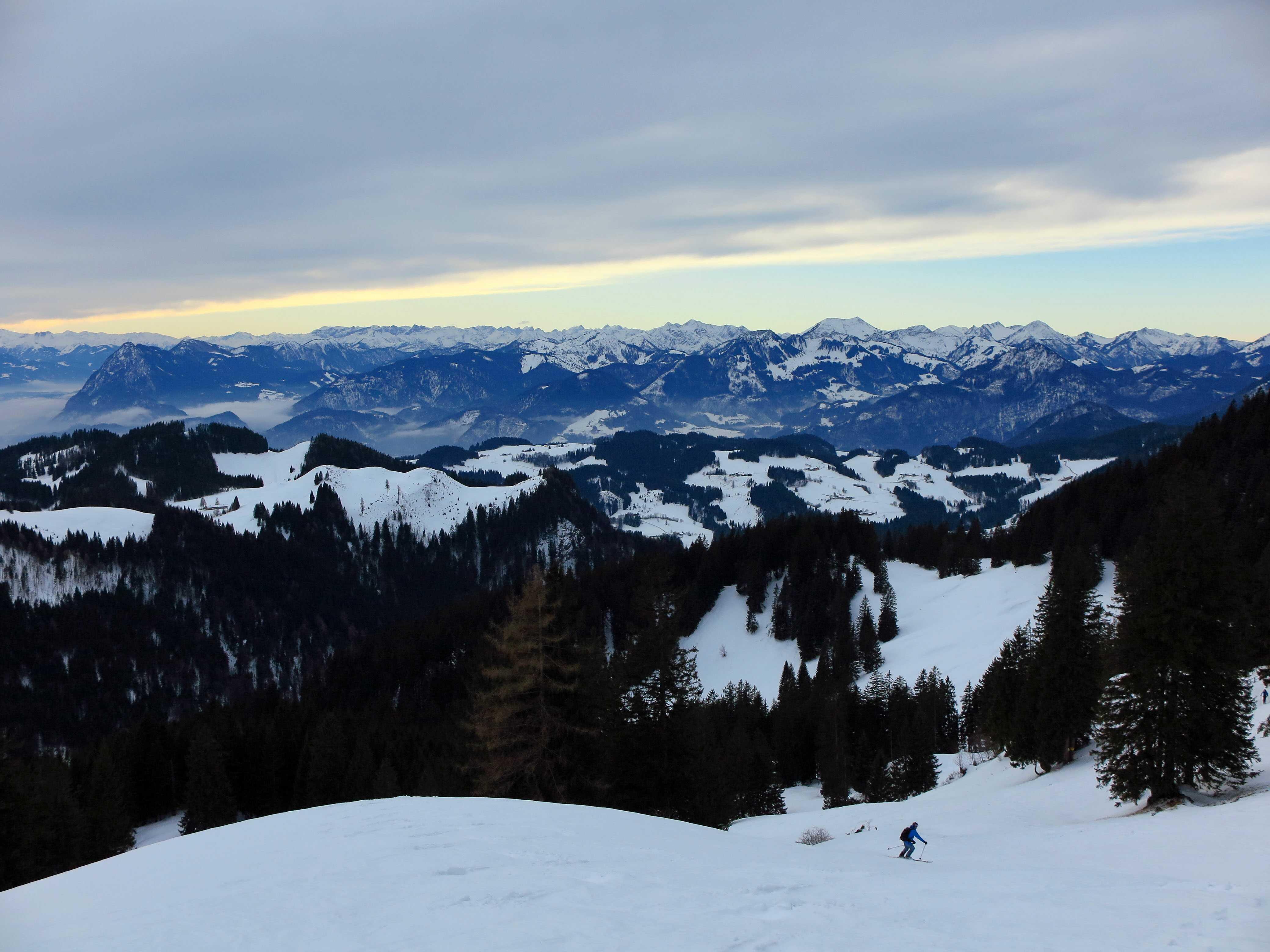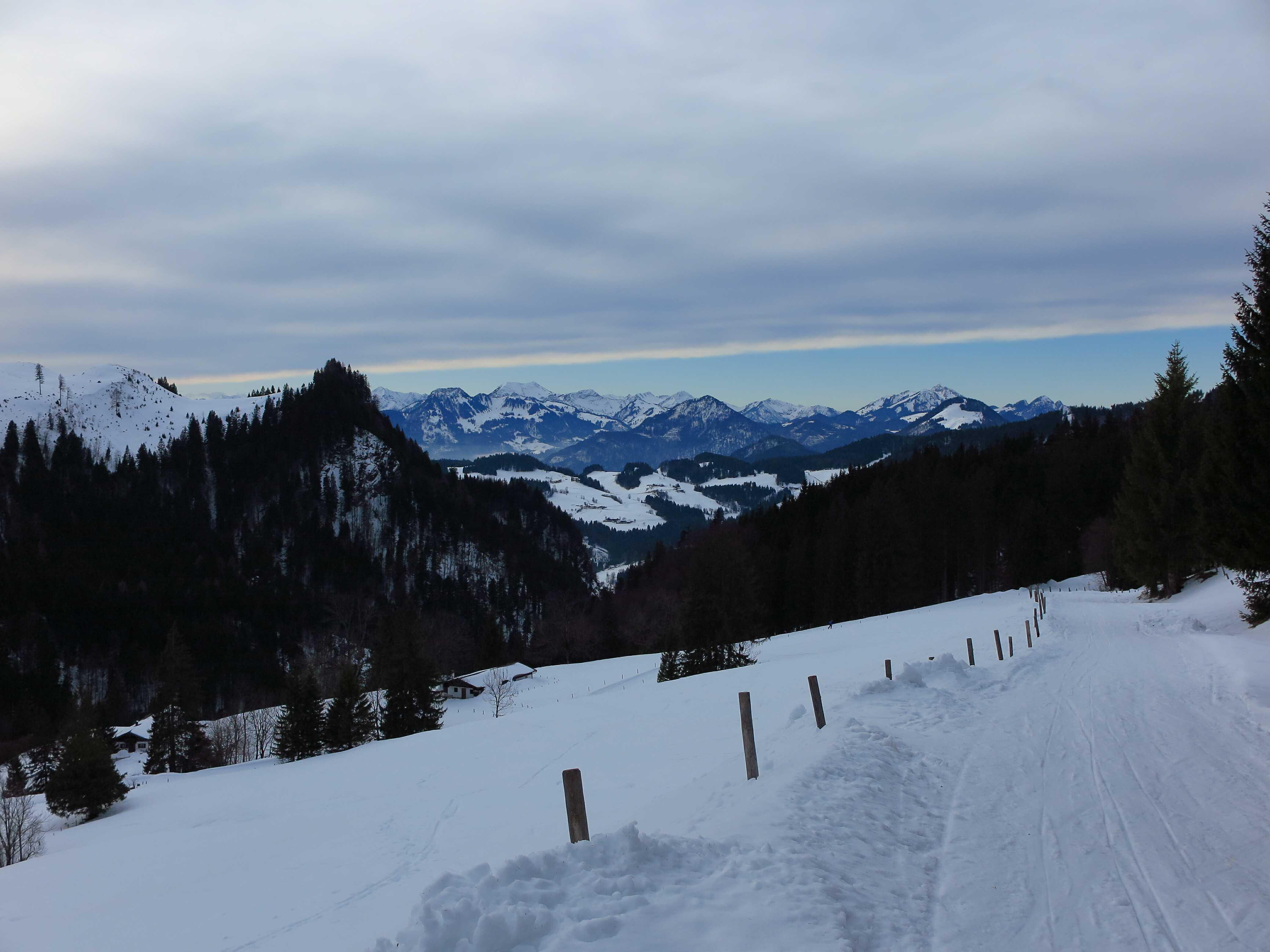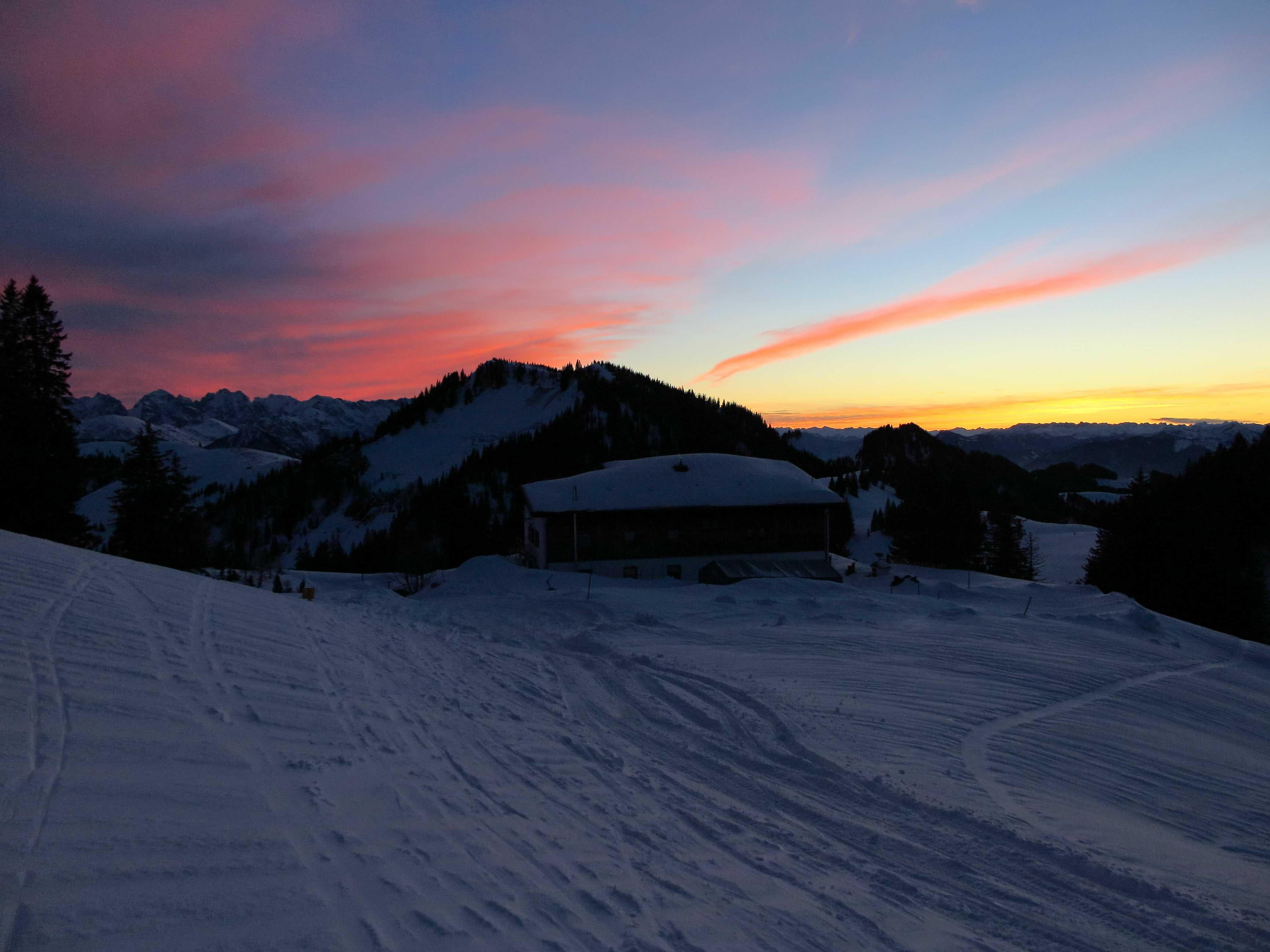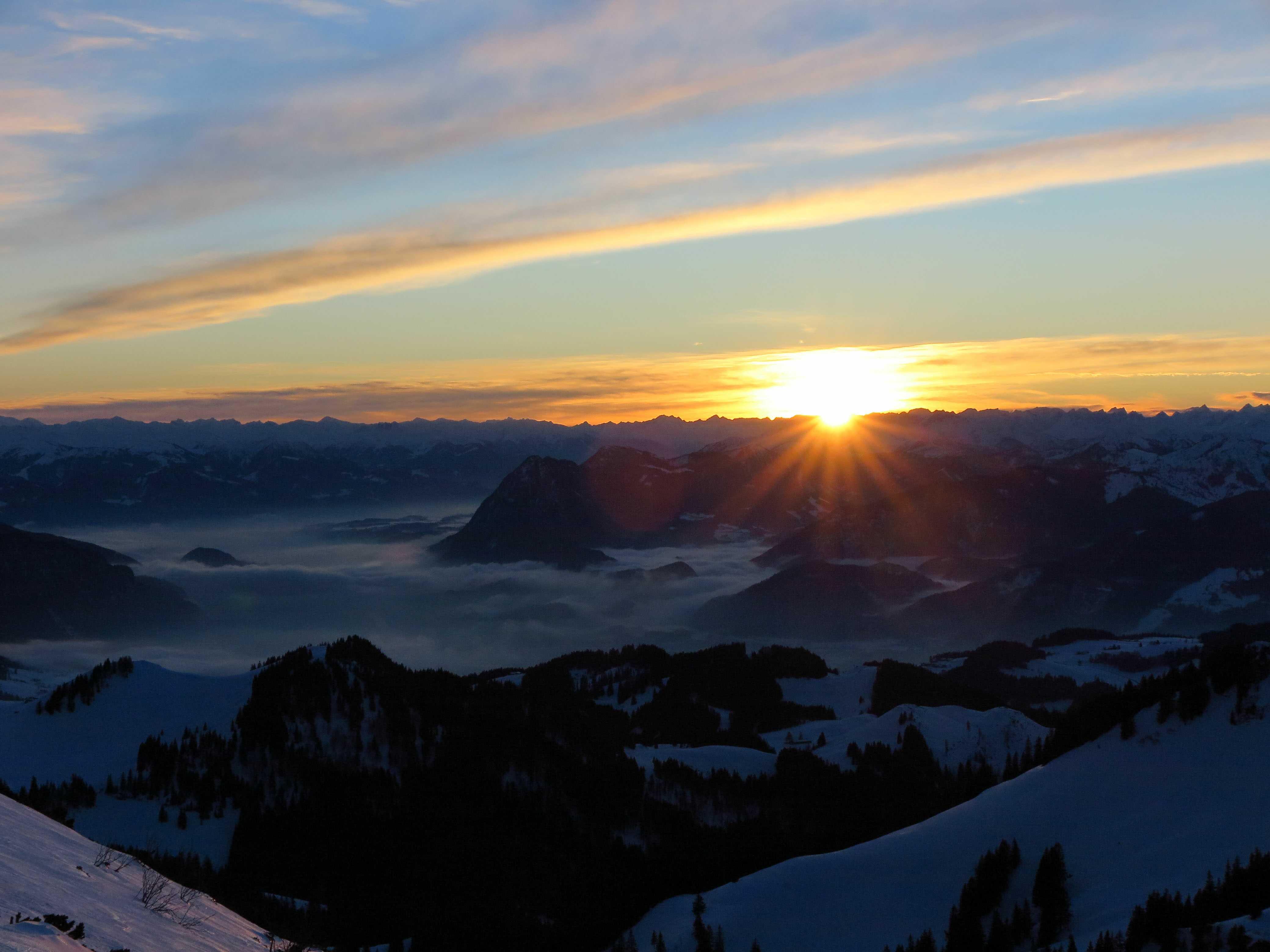 Nachmittagstour am Neujahr von Sachrang (735) über die Talalm, Schreckalm, Sulzingalm und Oberkaseralm zum Geigelstein (1808). Abfahrt über Priener Hütte (1411) und Rodelbahn.