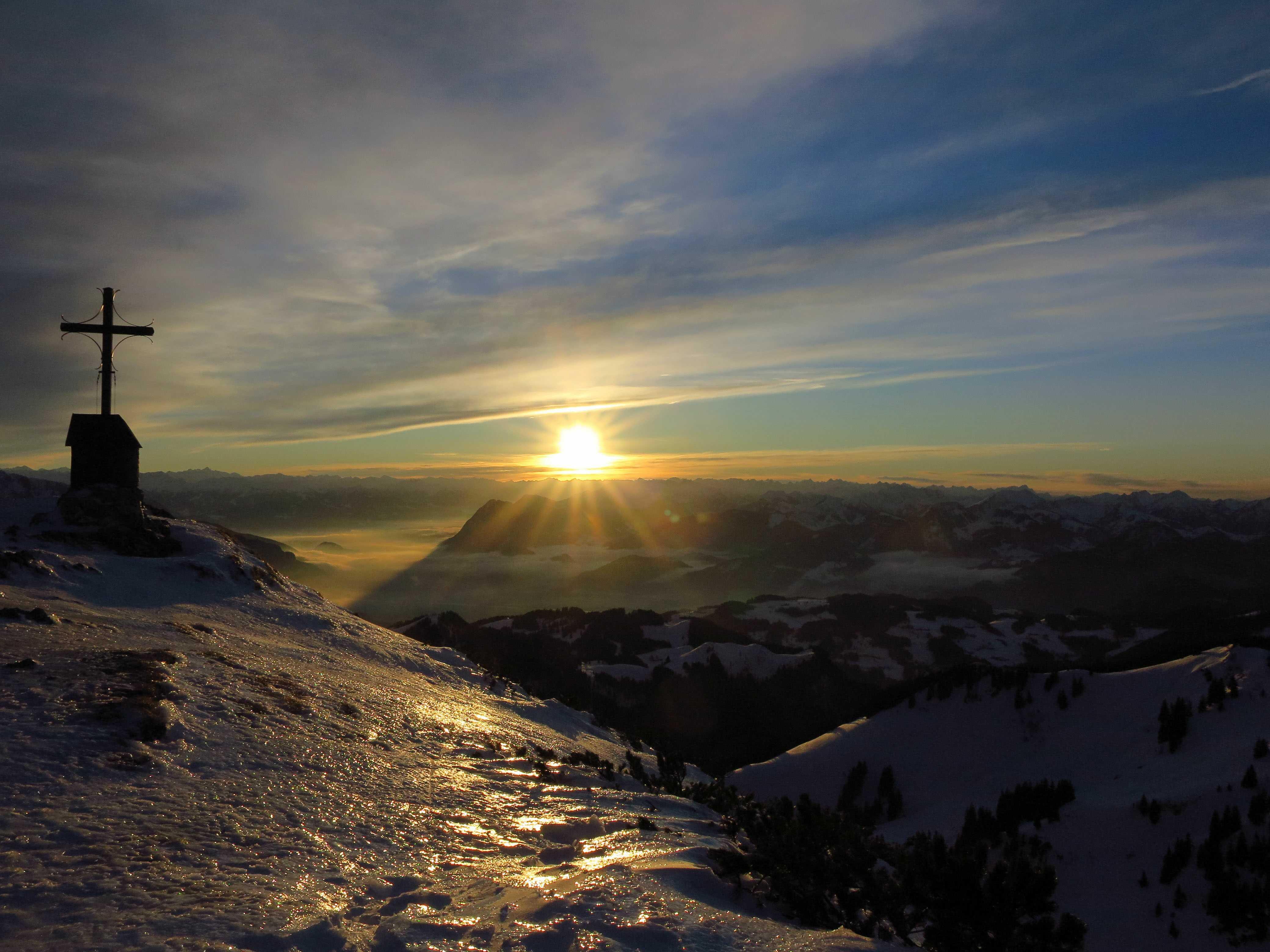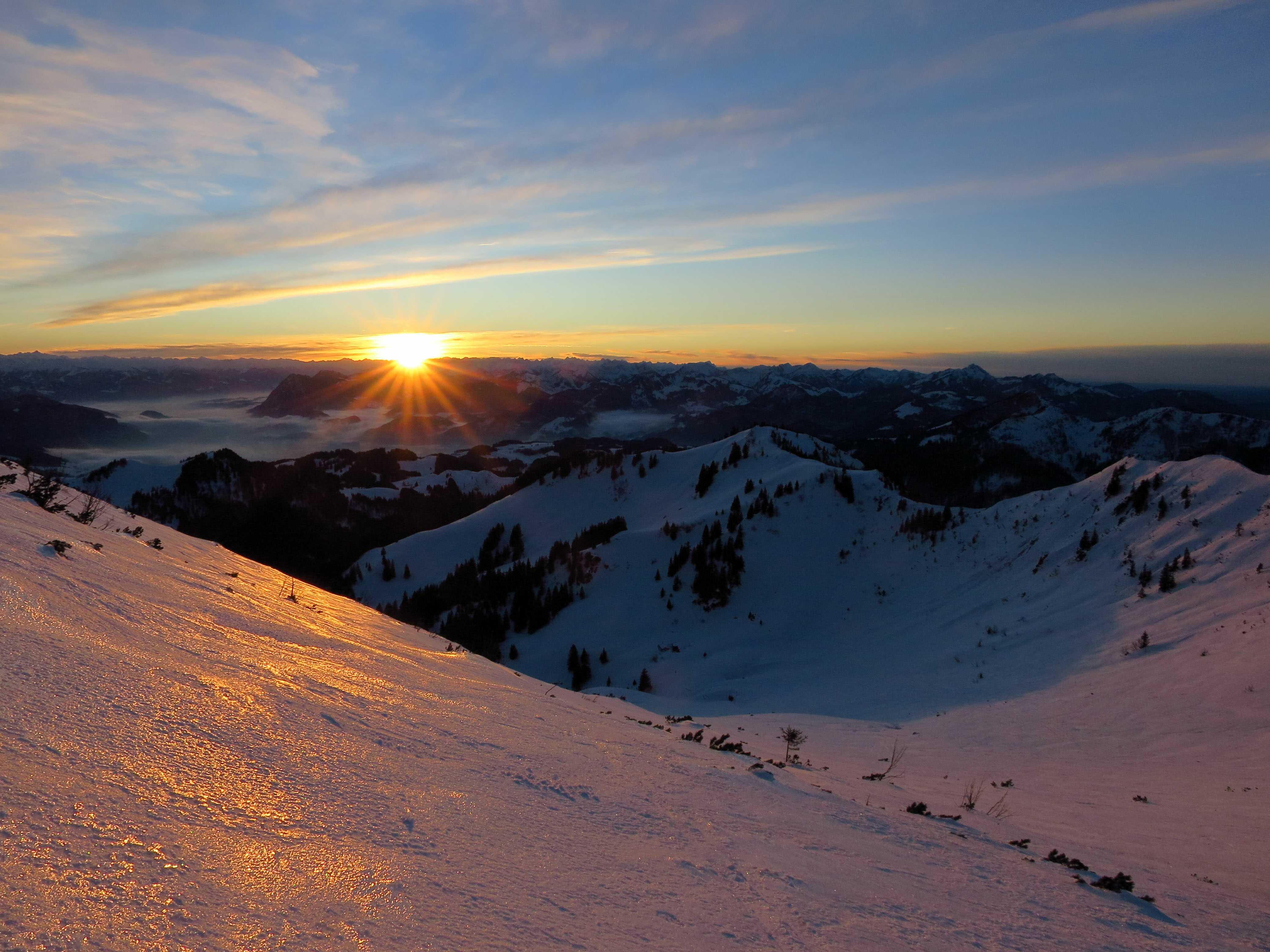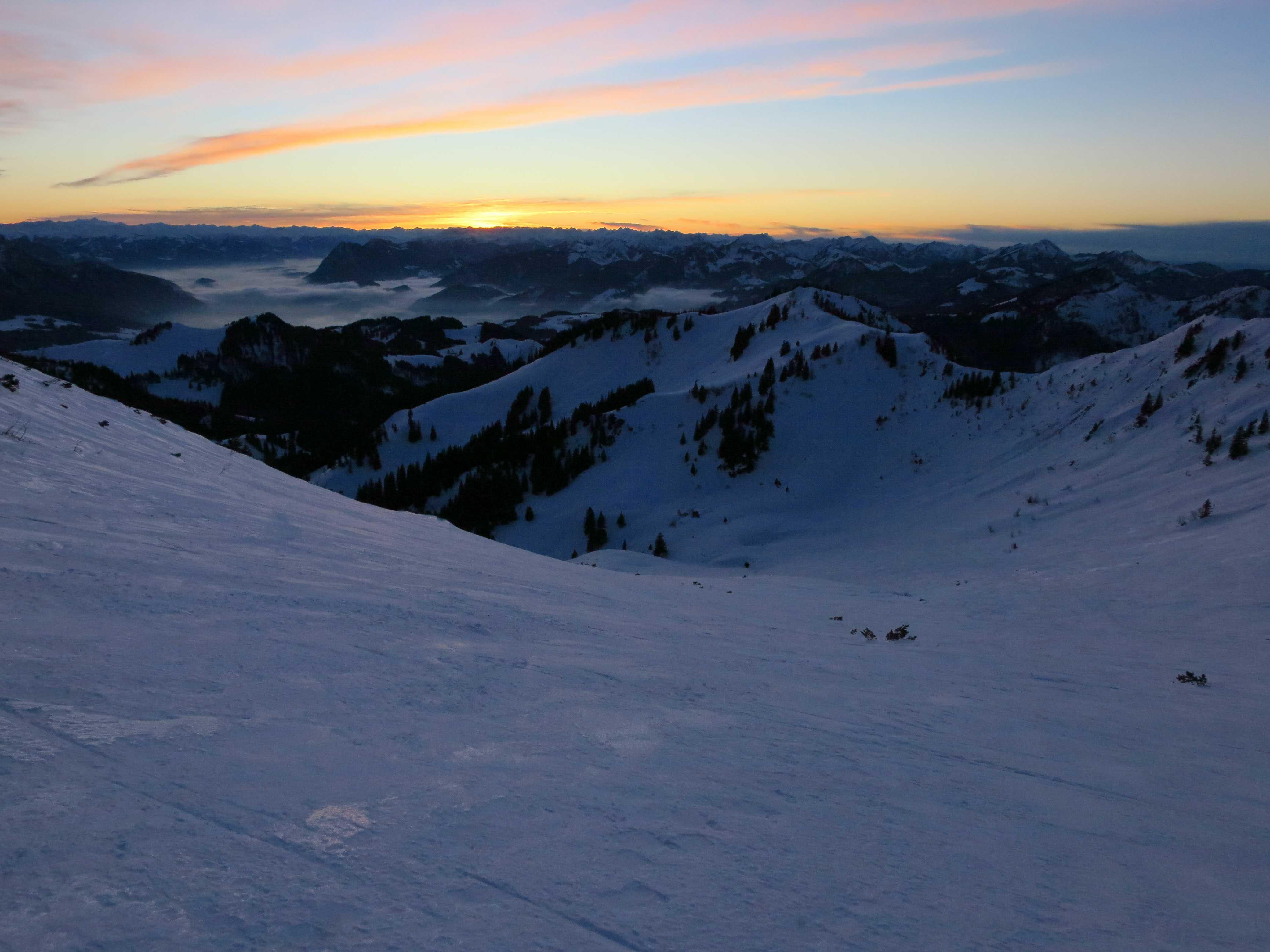 Wetter: Anfangs bedeckt, im Laufe des Nachmittags von Westen Bewölkungsrückgang. Oben kein Wind, ab ca. 1100m gefroren. Schöner Sonnenuntergang am Gipfel.