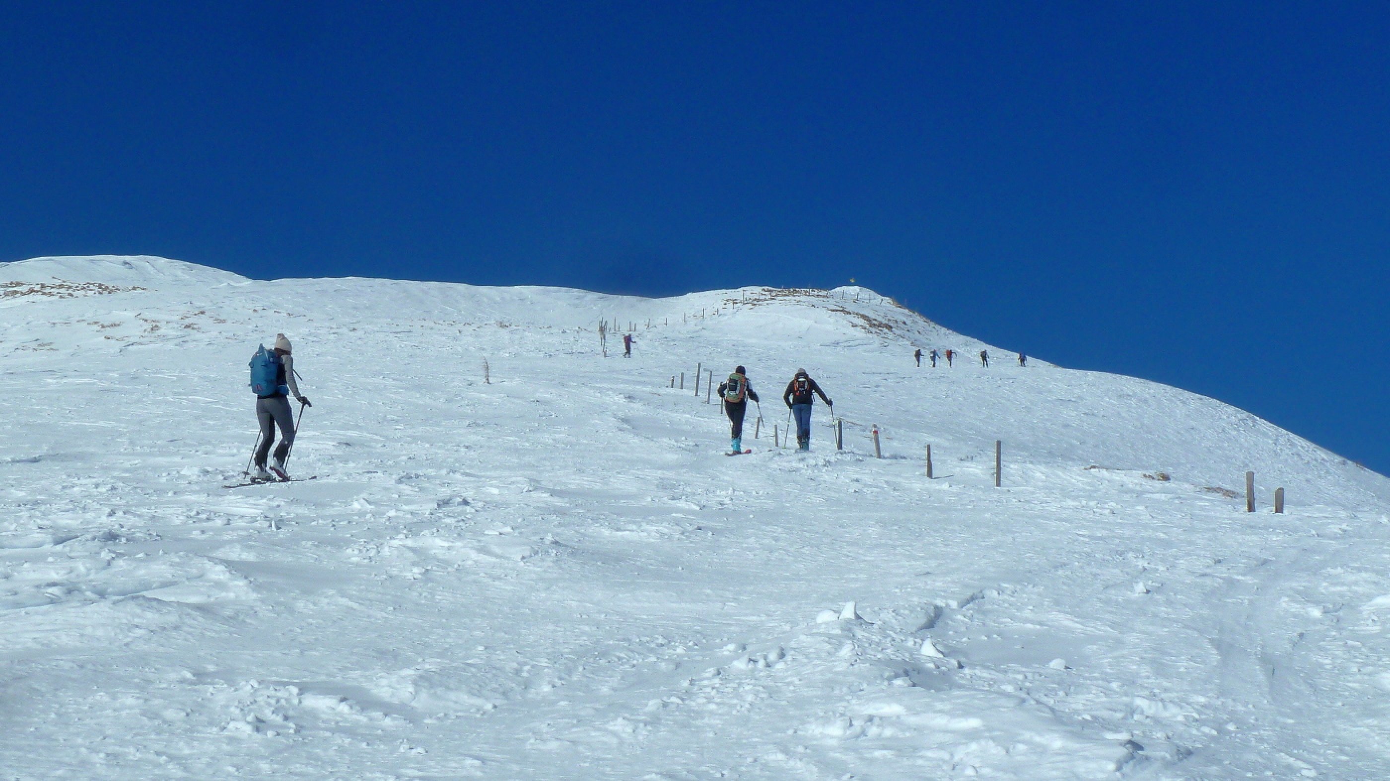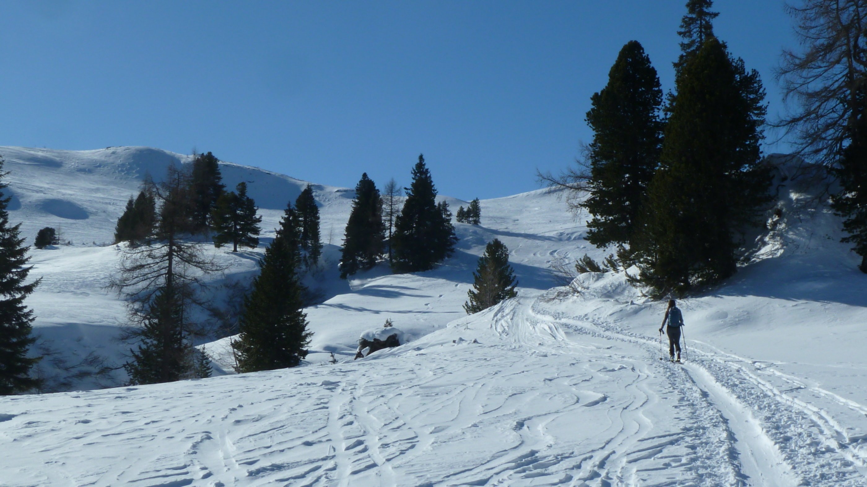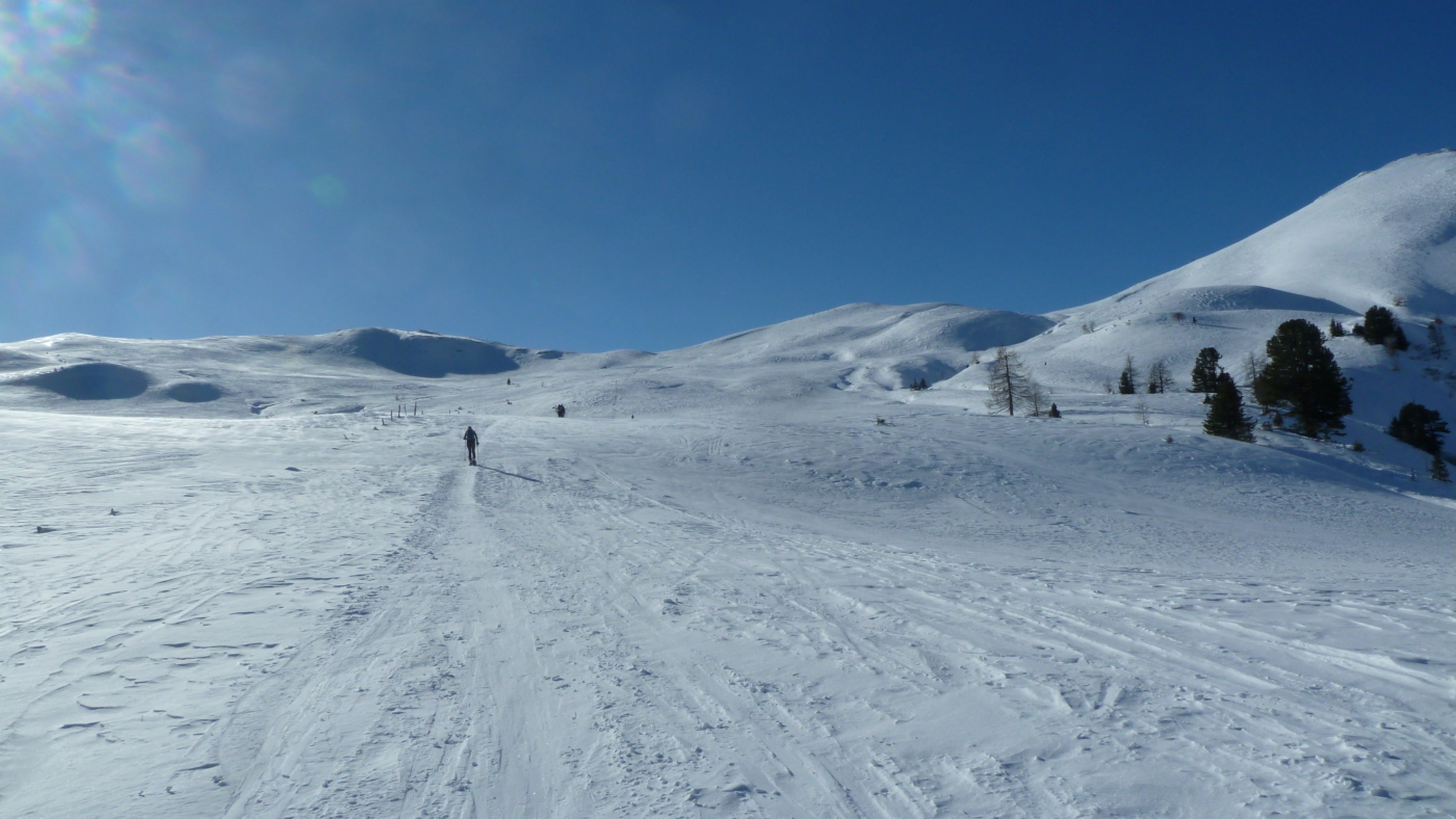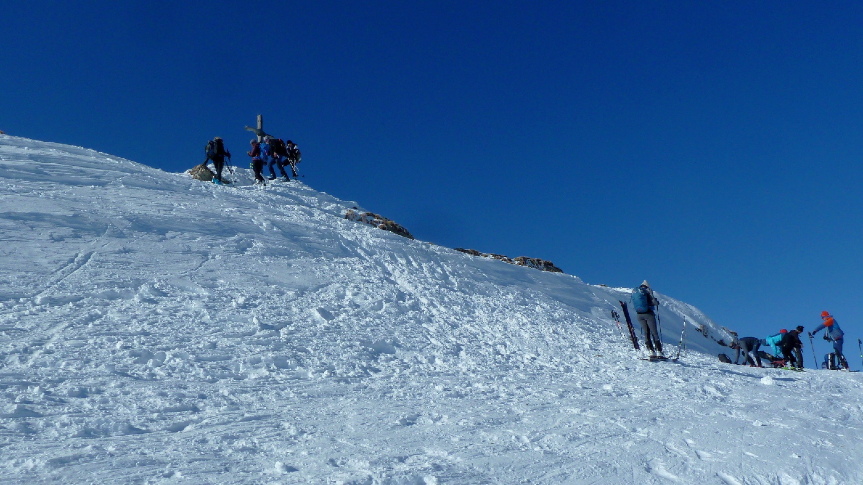 Reichlich Schnee vom Parkplatz bis zum Gipfel, die trockene Kälte seit dem Schneefall hat ihn schön pulvrig erhalten. Die Aufstiegsspur ist in perfekten Zustand, im freien Gelände hat sich ein solider Windharschdeckel gebildet, der immer wieder von Triebschnee überlagert wird. Unbeschwert locker ist der Abfahrtsgenuss daher nicht. Zur Lawinensituation gibt es bei Stufe 1 und 2 nicht viel zu sagen.