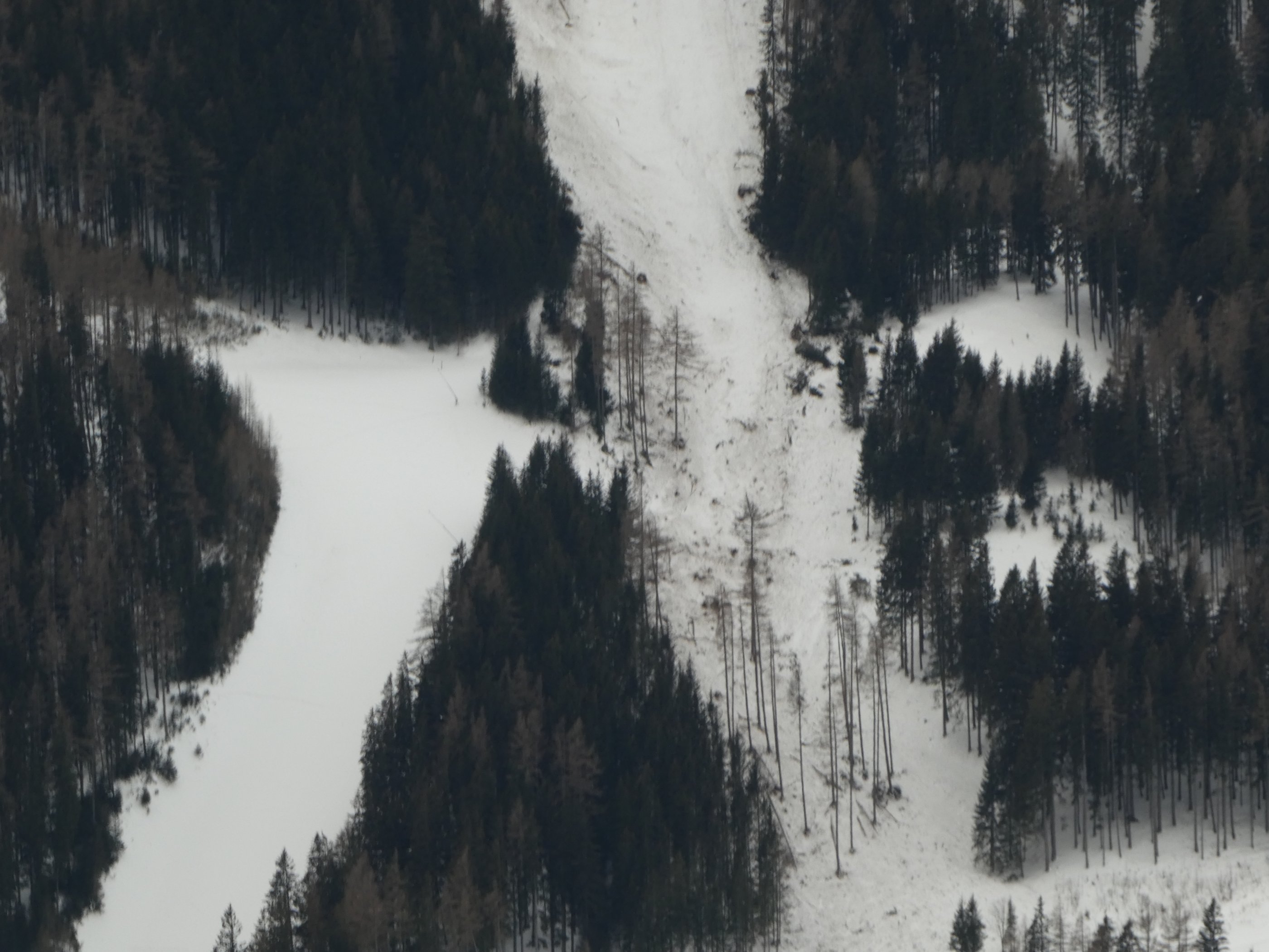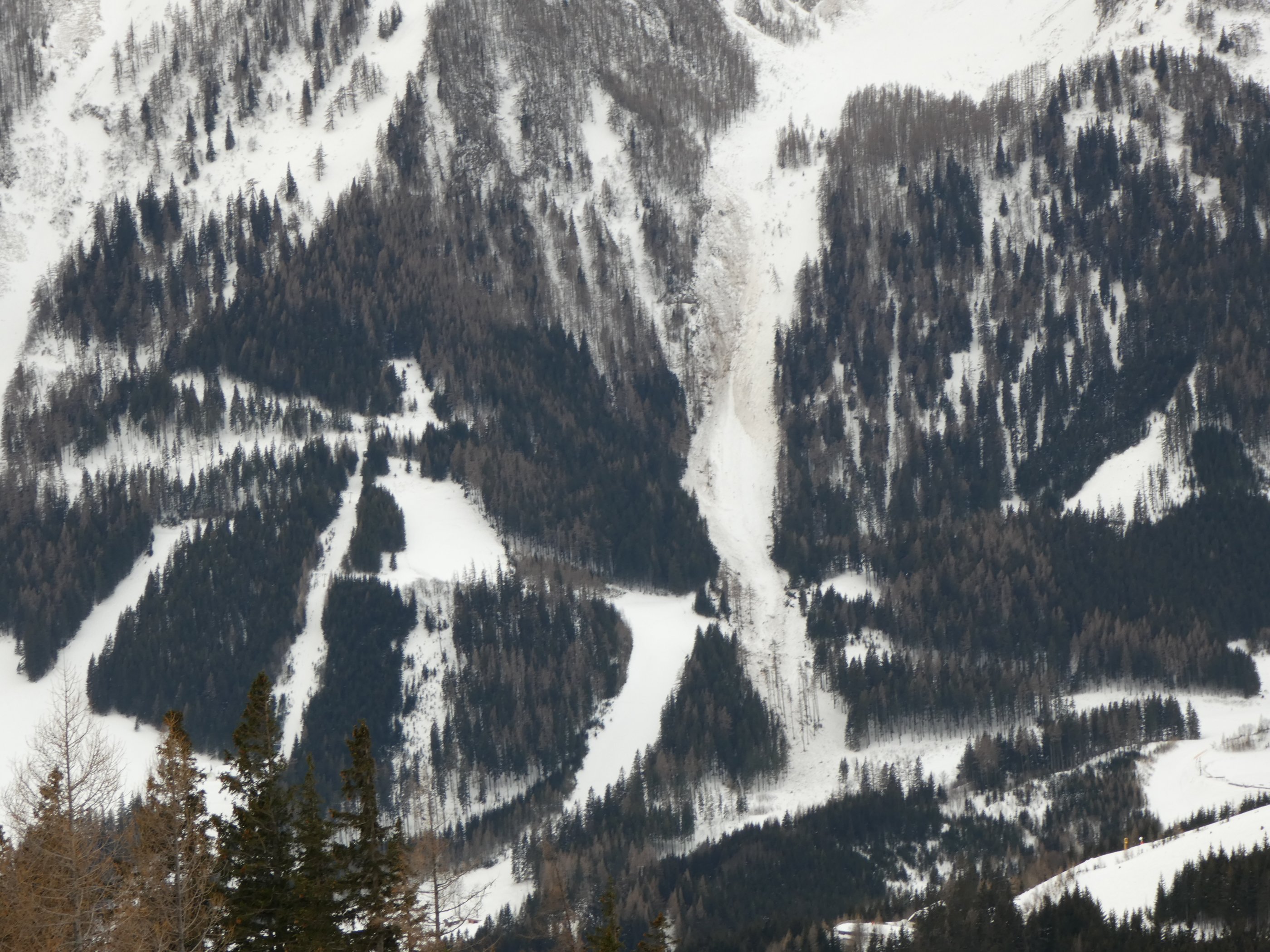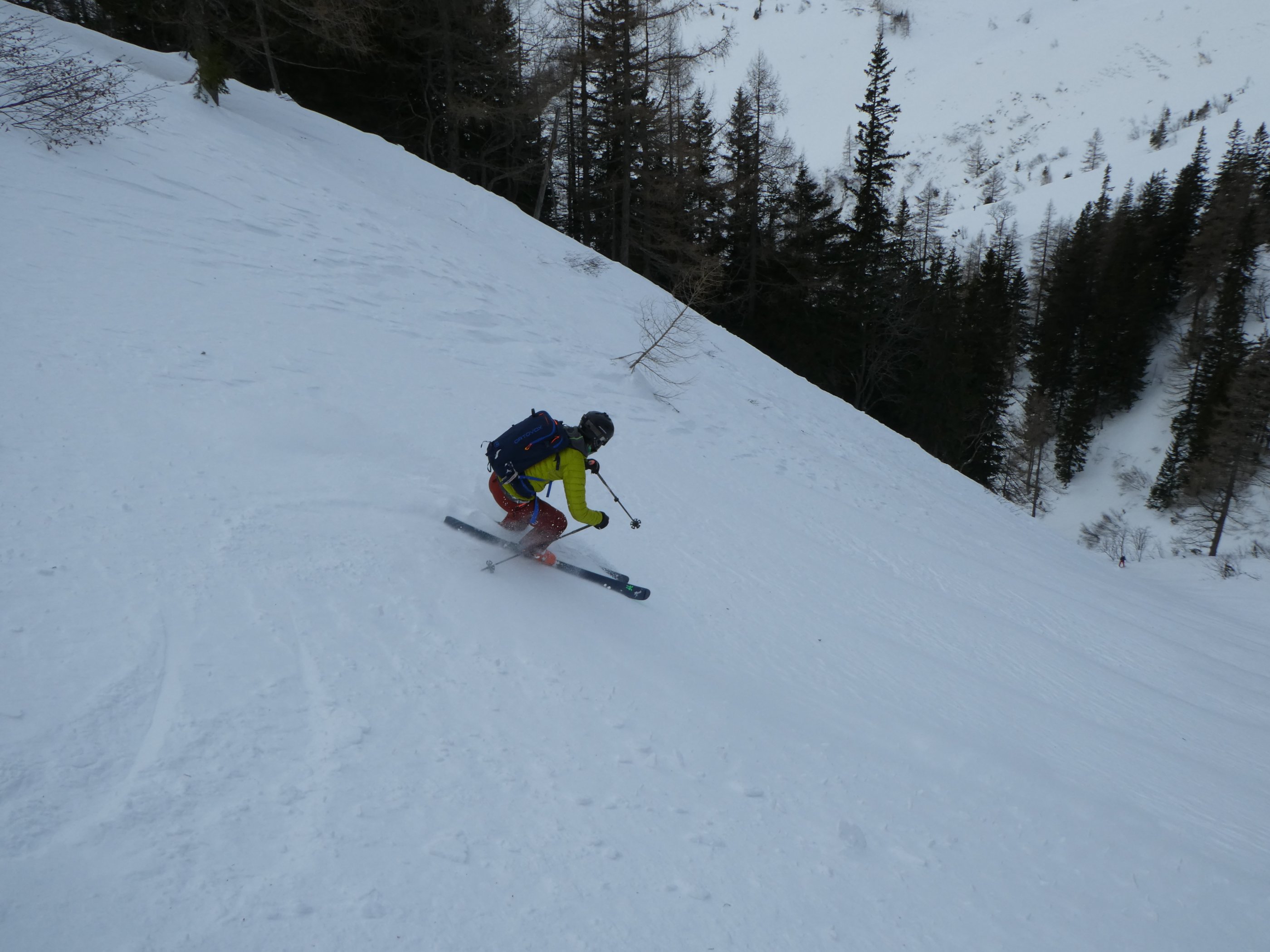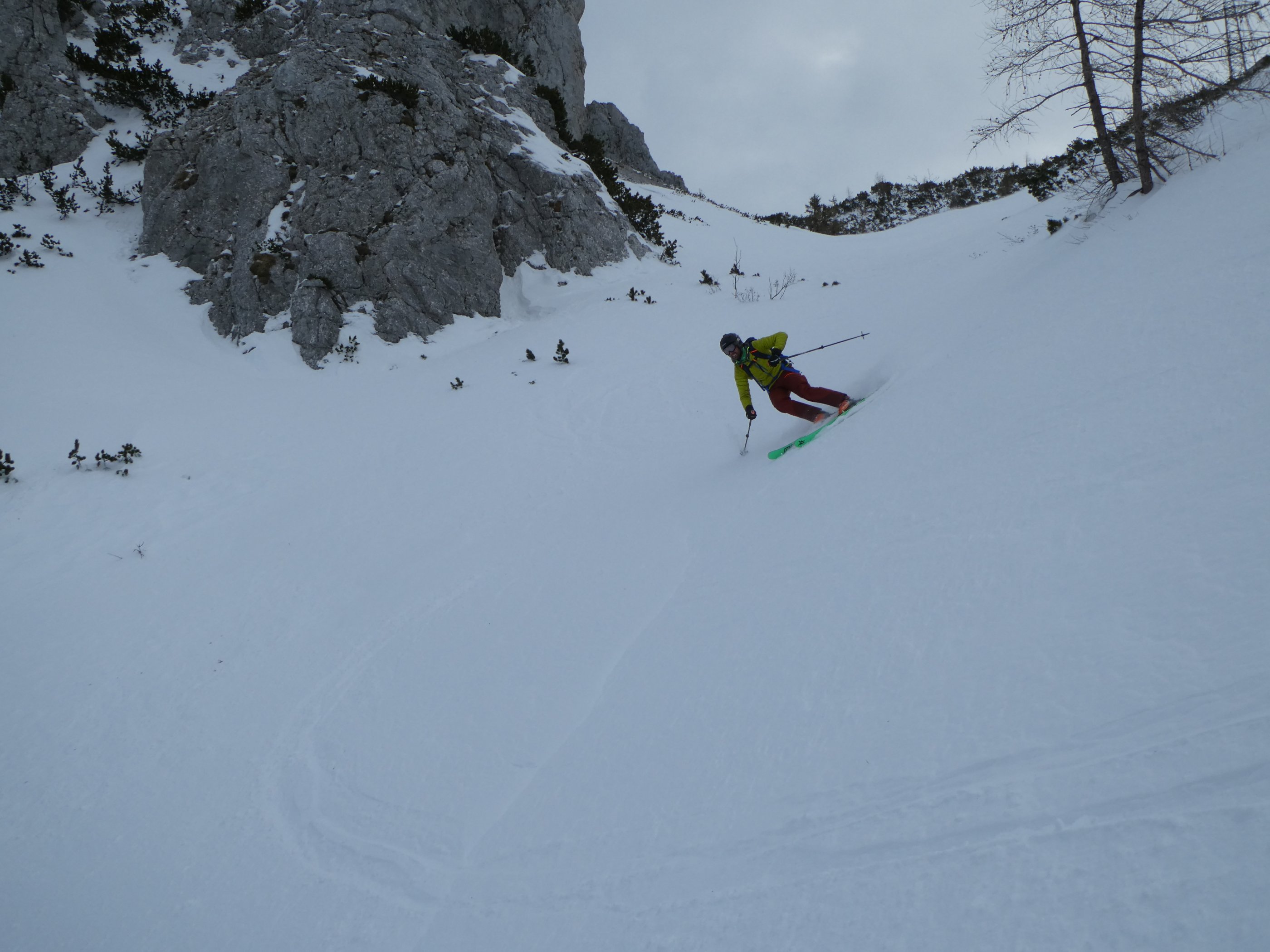 Mix aus tragendem Windharschdeckel und Windgangeln am Wildfeld; ganz oben alles abgeblasen. Trenchtlingrinne sehr kompakt und gut fahrbar; mächtige Lawinenaktivität in der Gegend: eine große Staublawine von der Griesmauer bis in den Handlgraben und vis a vis aus dem Laugensack/Lahngang eine große Lawine, die über die Piste vom Weidtallift drüber gegangen ist.