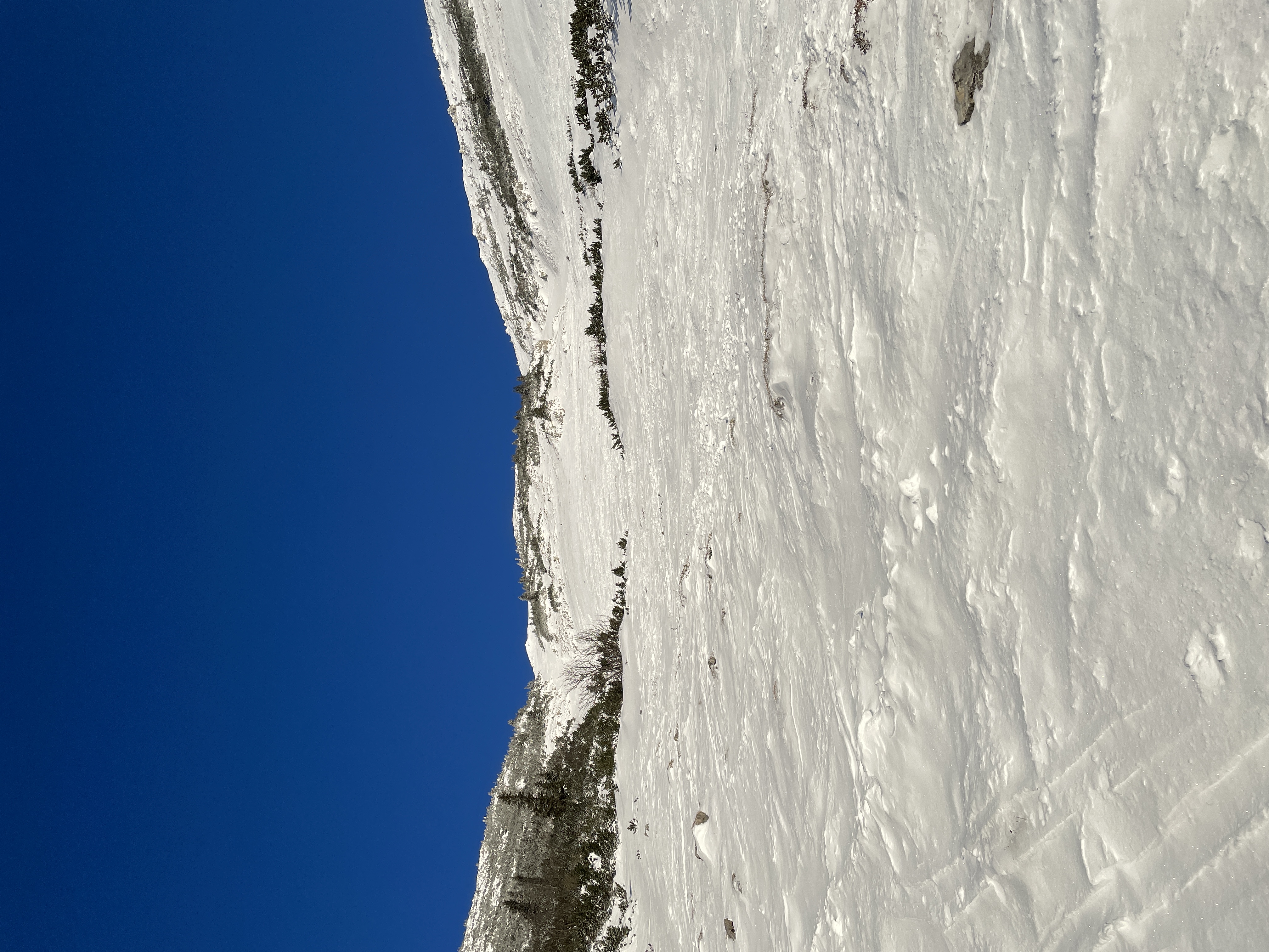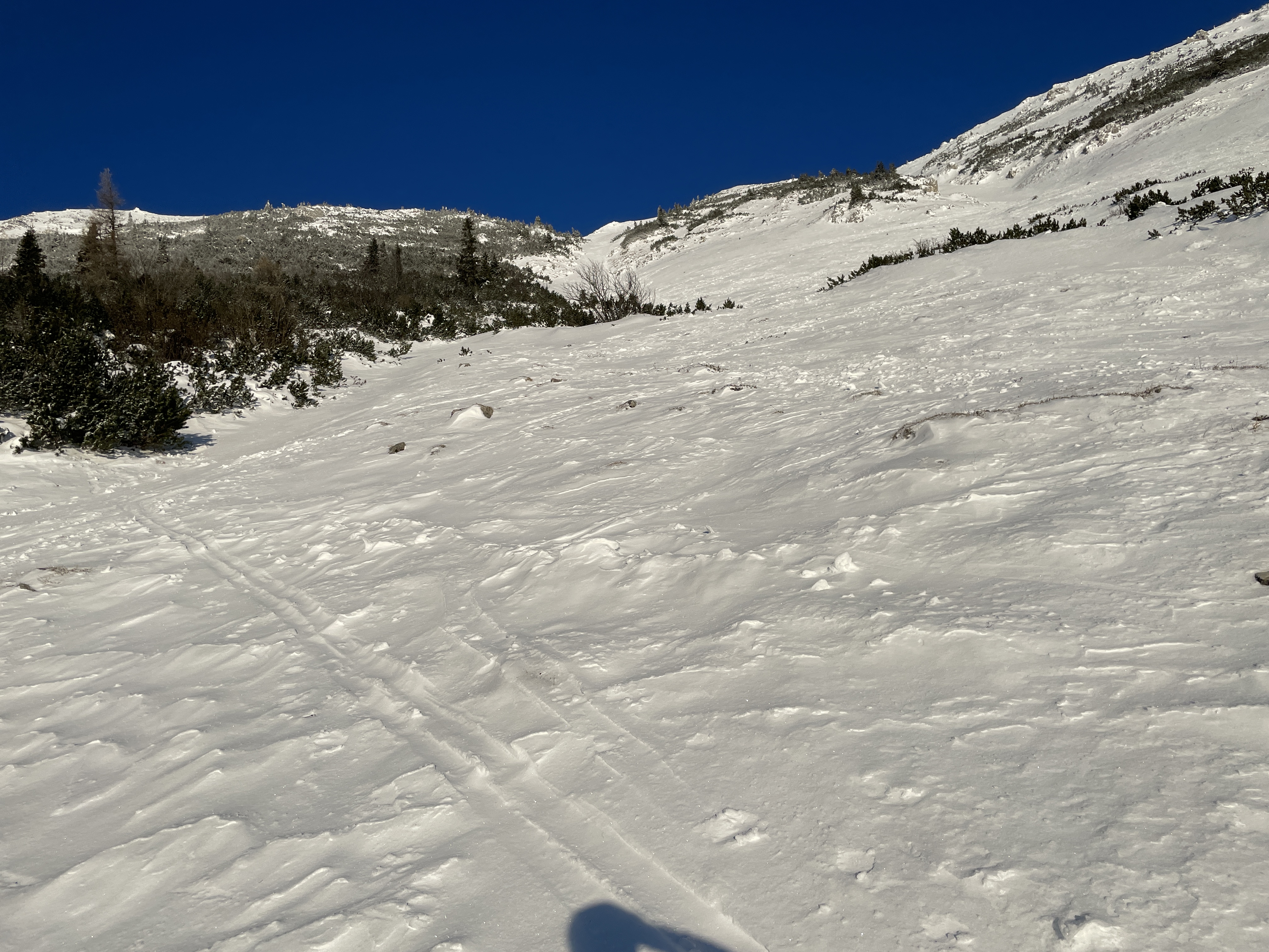 In der Schallerrinne in der Abfahrt ein wenig Triebschnee, was das Abfahrtsvergnügen ein wenig verbessert hart.
