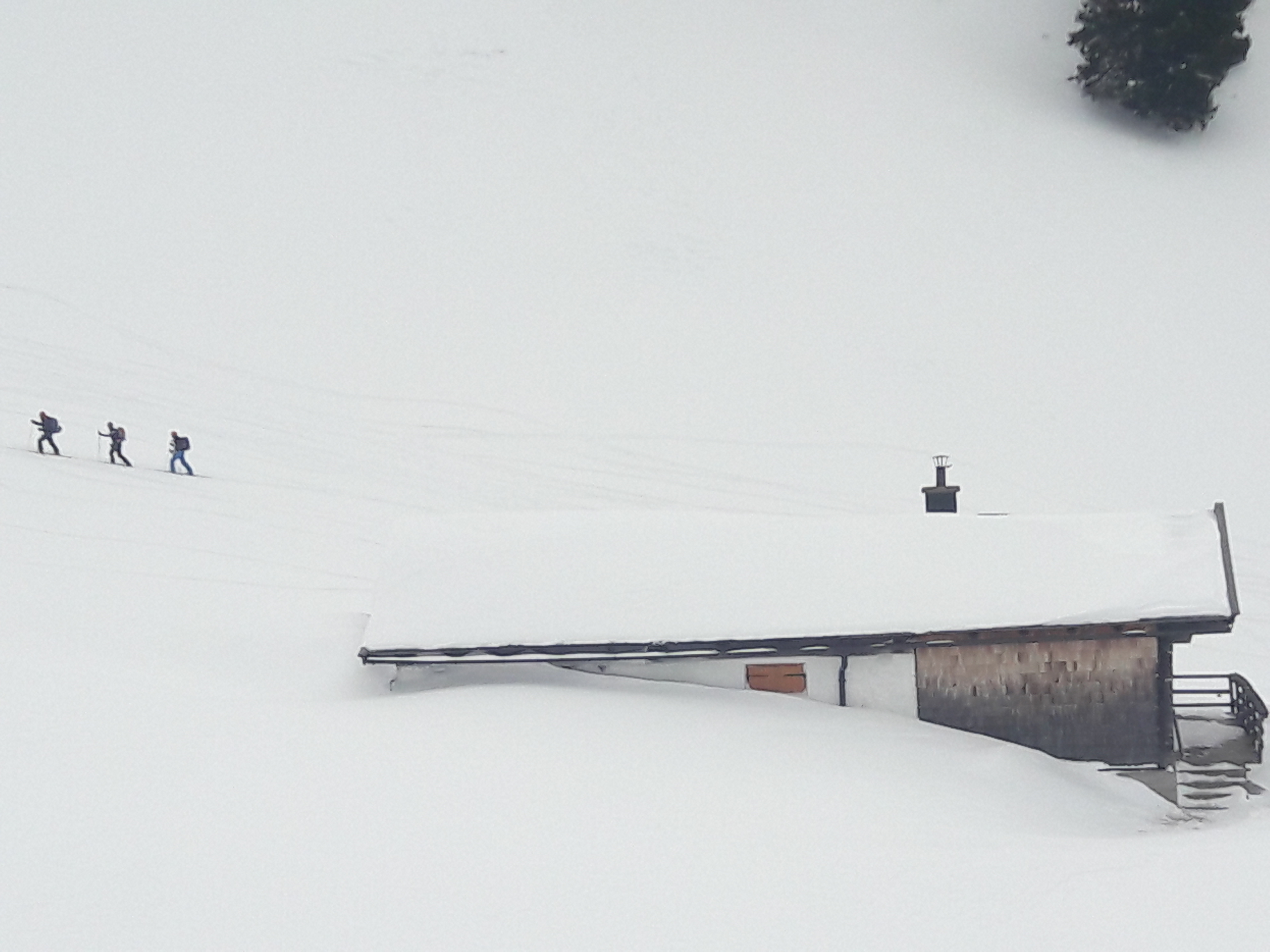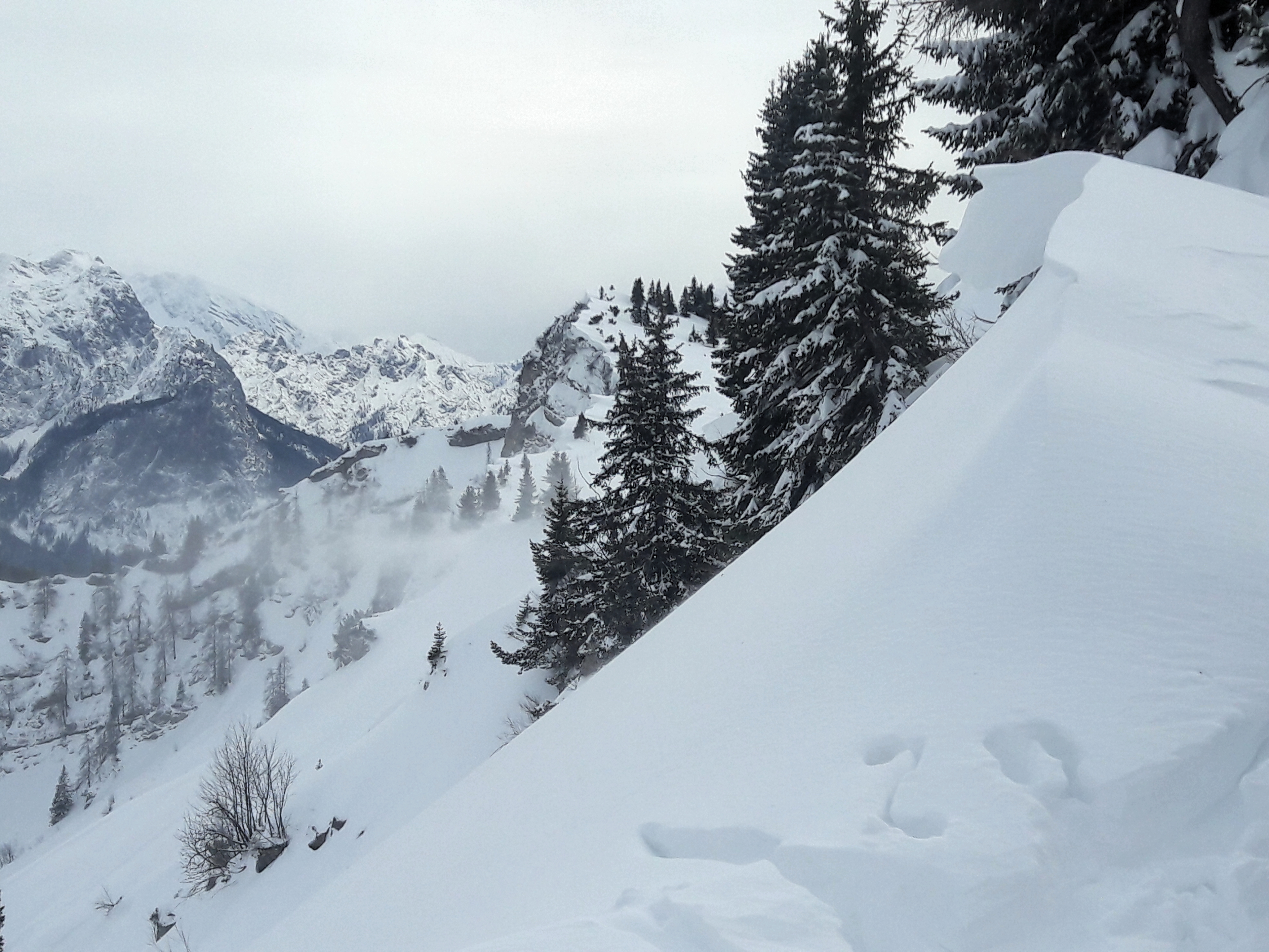 In den Hirnwindungen ist noch der tödliche Lawinenabgang unterhalb der Hocheisspitze vom Dienstag gespeichert. Das Watzmannkar muß noch warten. Heute defensiv, die Neuschneemengen sind erheblich und der Wind war auch wieder beteiligt. Unbeschwertes Austoben zwischen SoHo und PK mit neuen Waldvarianten. Wind: kräftiger Düsenantrieb aus S/SE in Verfrachtungsstärke ab der Waldgrenze. Schnee: 20-40 cm Pulver, stellenweise Triebschnee. Wetter: wolkenbedeckt, -1°C am PP Heutalbauer um 10 Uhr, ab 14 Uhr sonnige Phase. Motto: Wir brauchen mehr von den Tagen, die nicht nach Gründen fragen, wenn wir uns im Pulver versenken ohne Sorgen, als gäbs kein morgen 😊