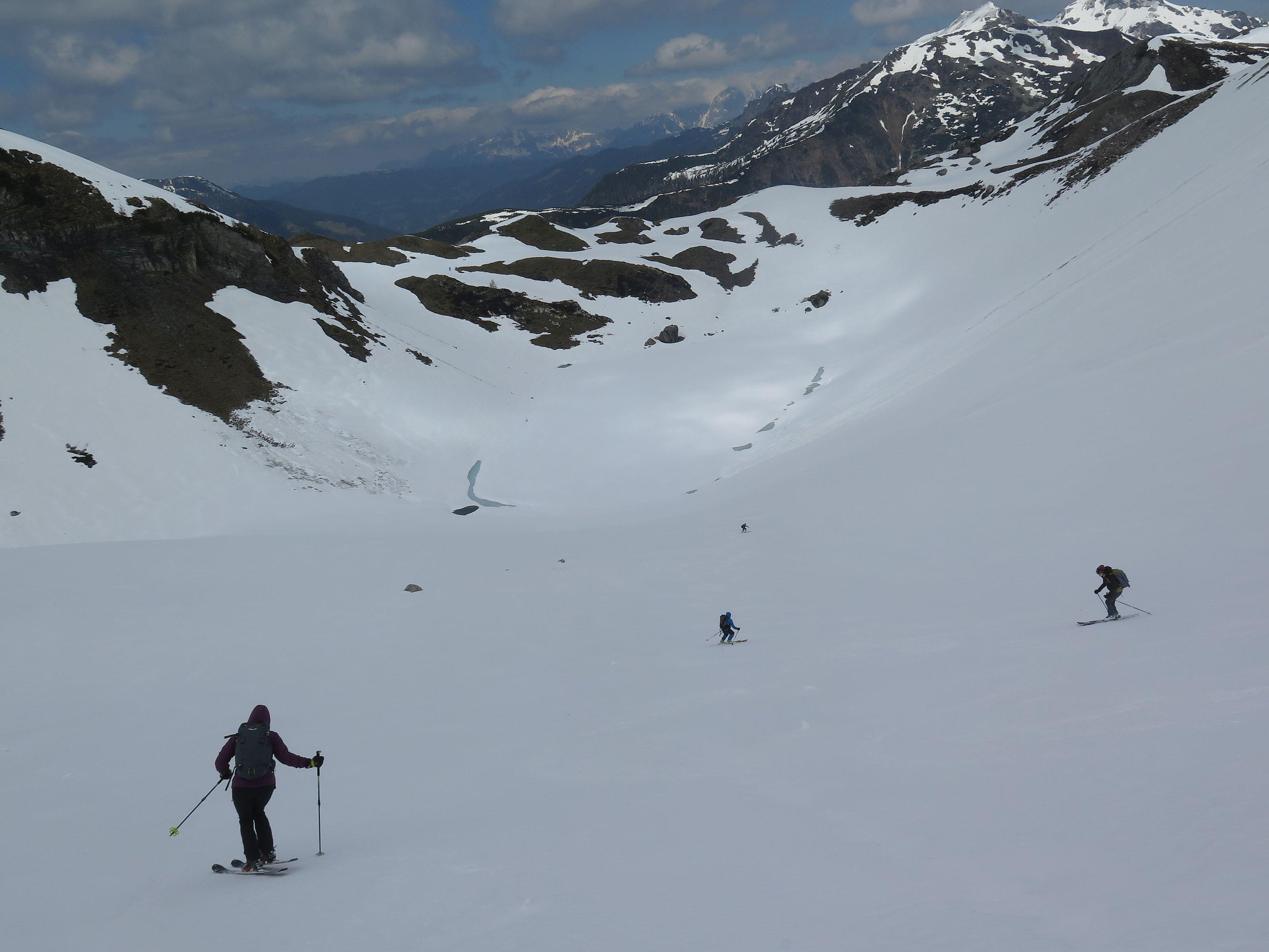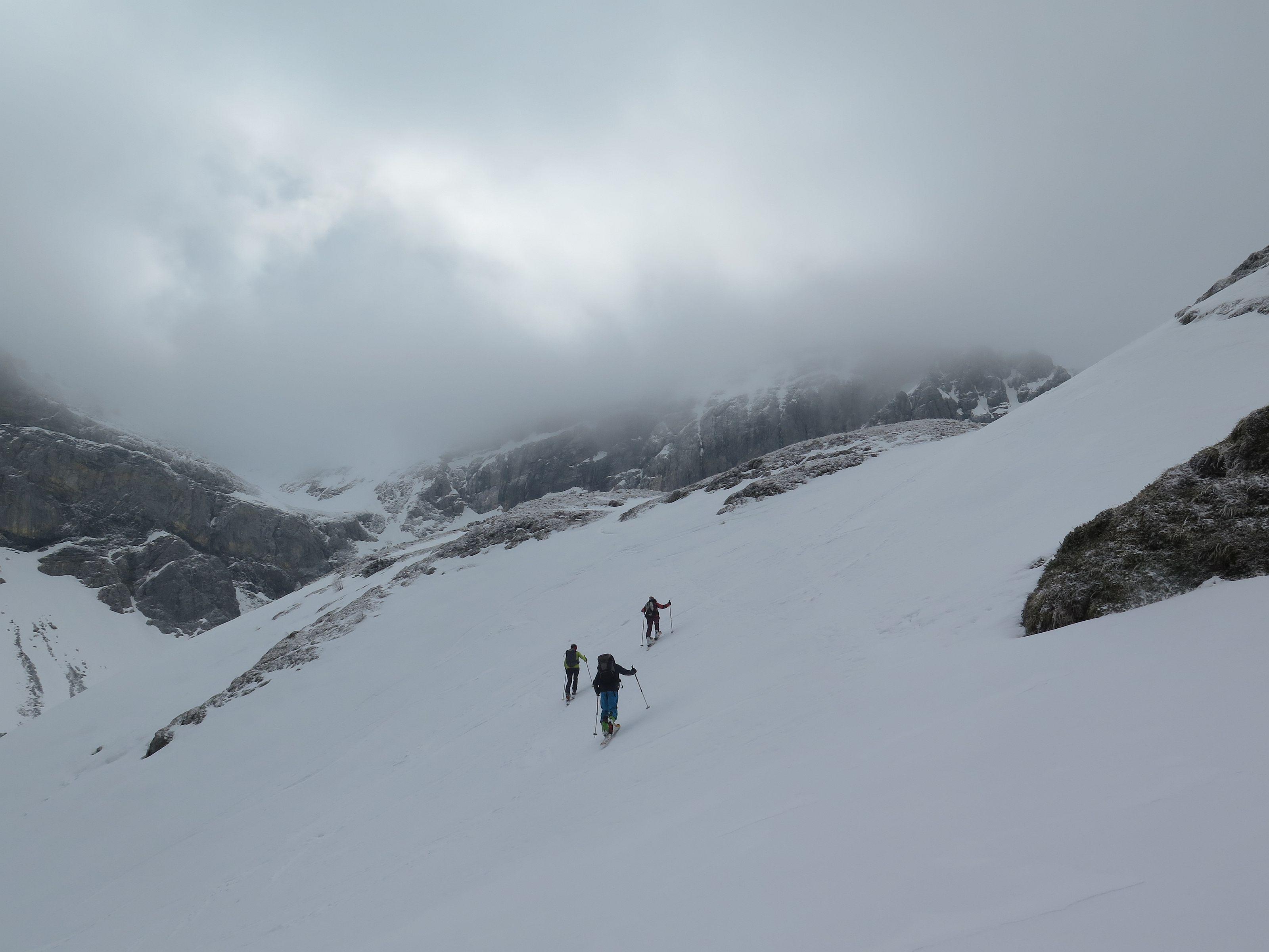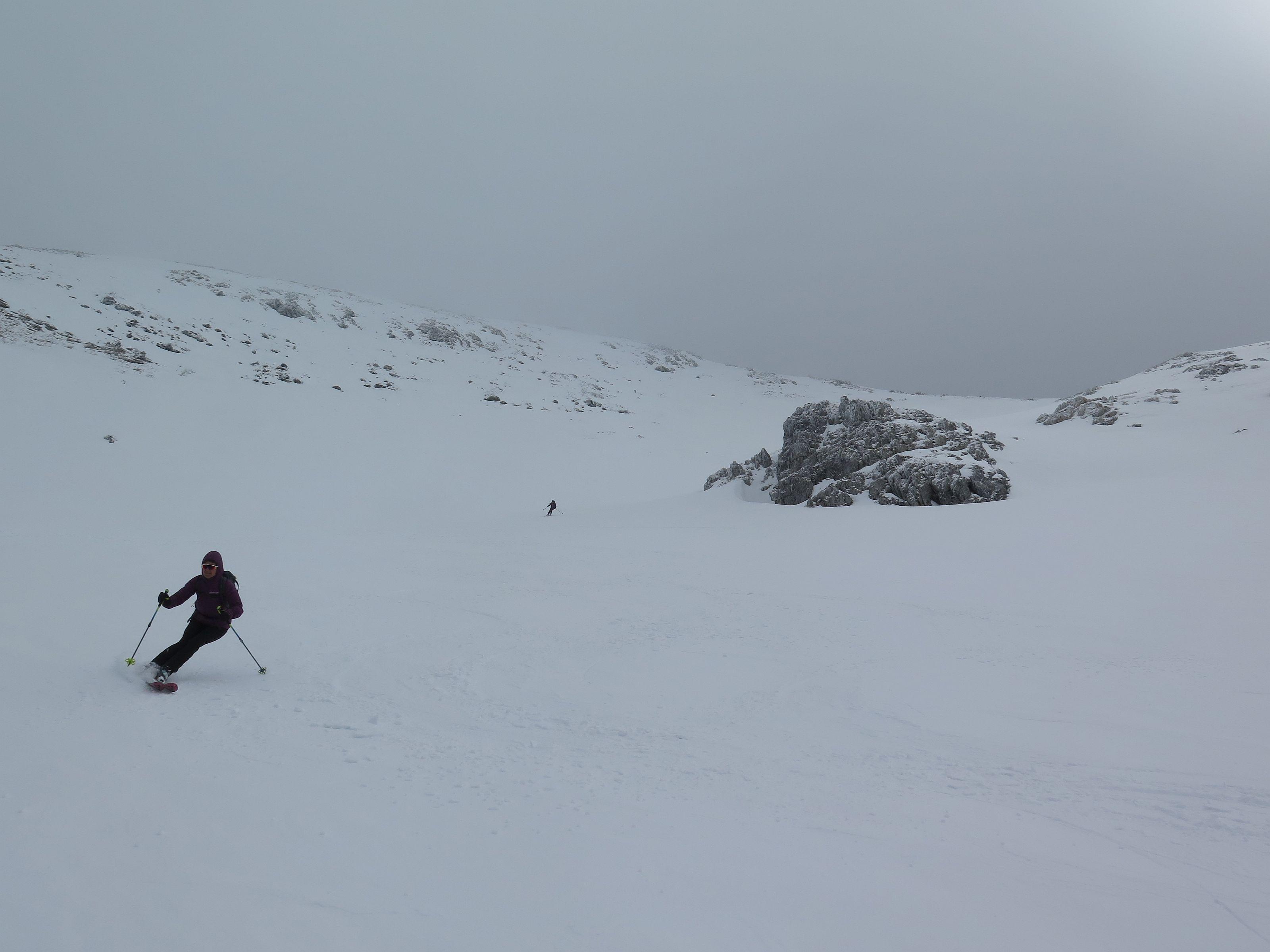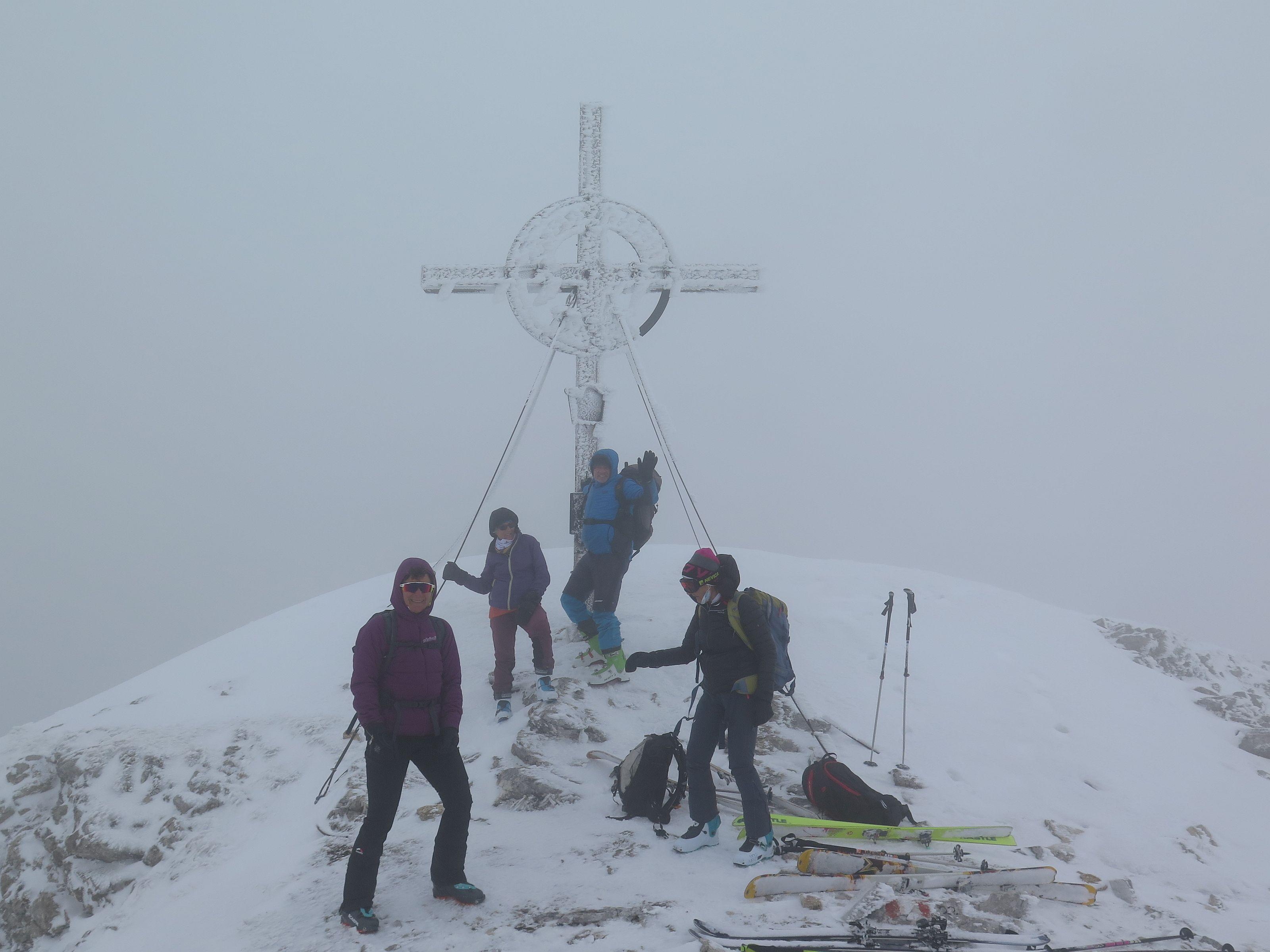 Im Aufstieg : Wolken, Nebel, lebhafter Wind und trübe Gesichter , bei der Abfahrt Auflockerungen, im oberen Abfahrtsbereich geringe Pulverschneeauflage auf festen glatten Flächen, im unteren Teil Firn und strahlende Gesichter.