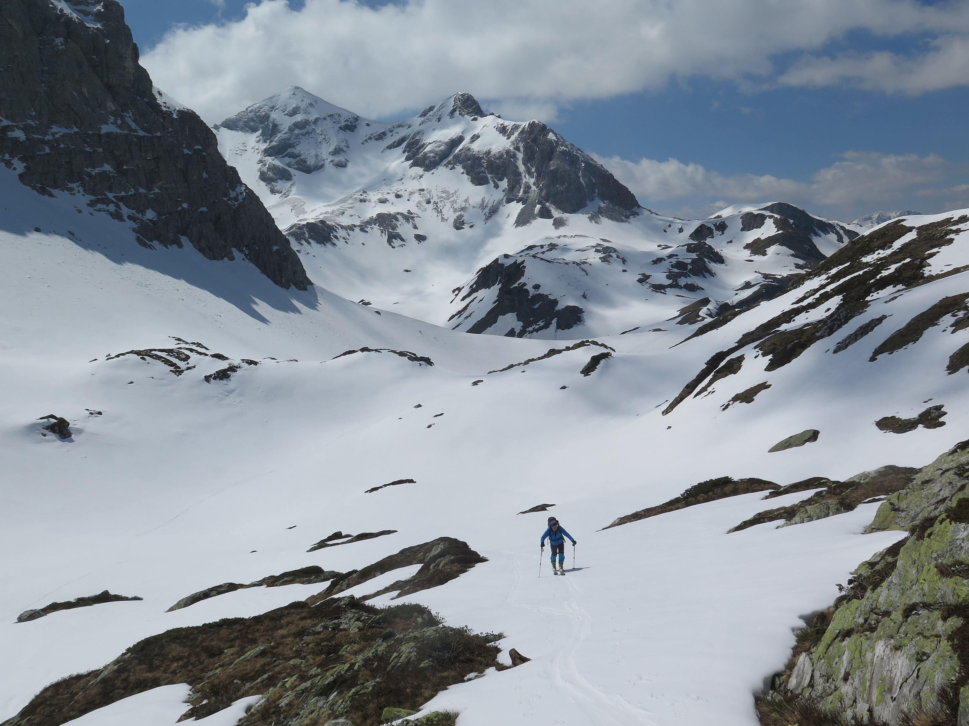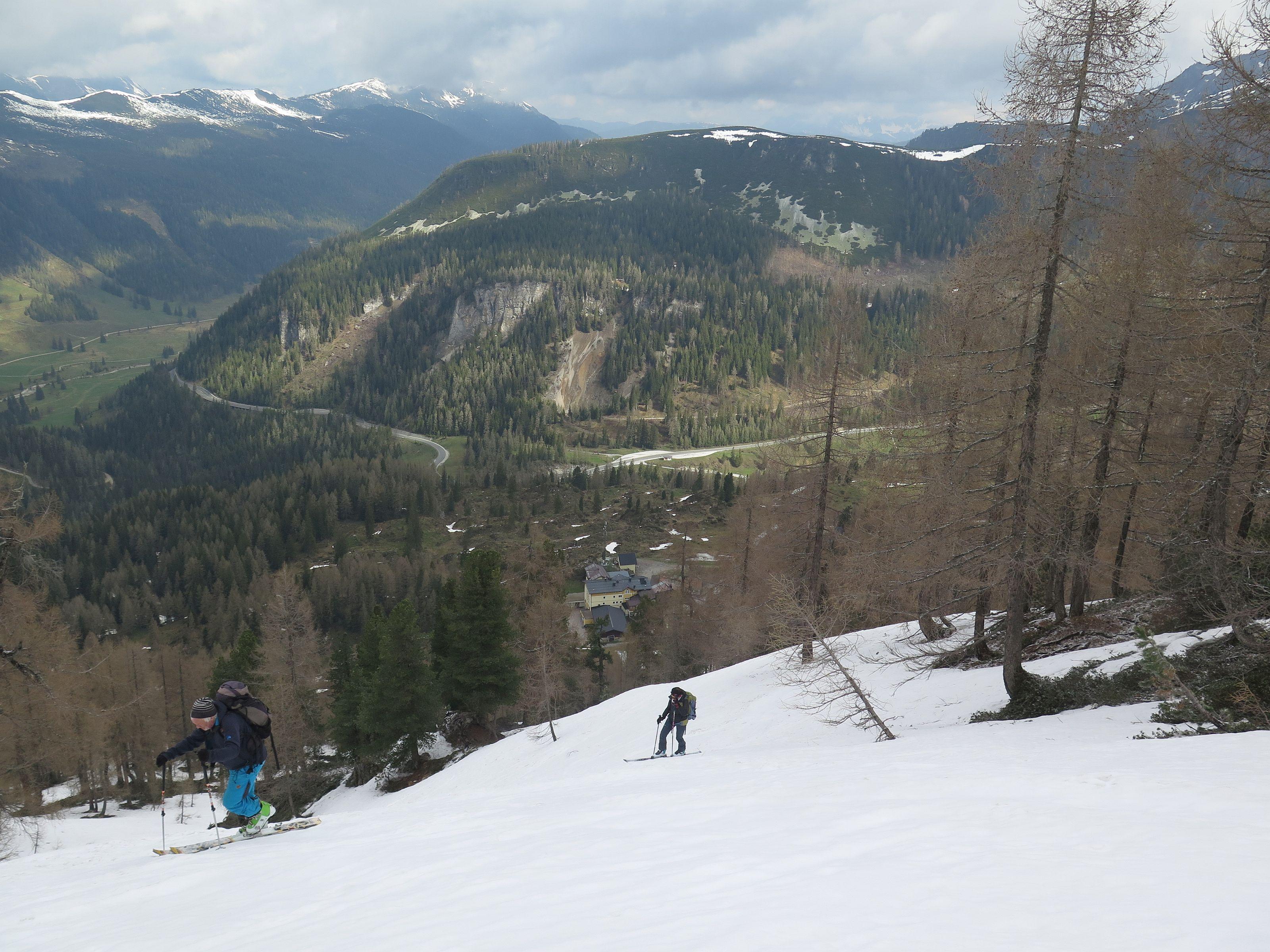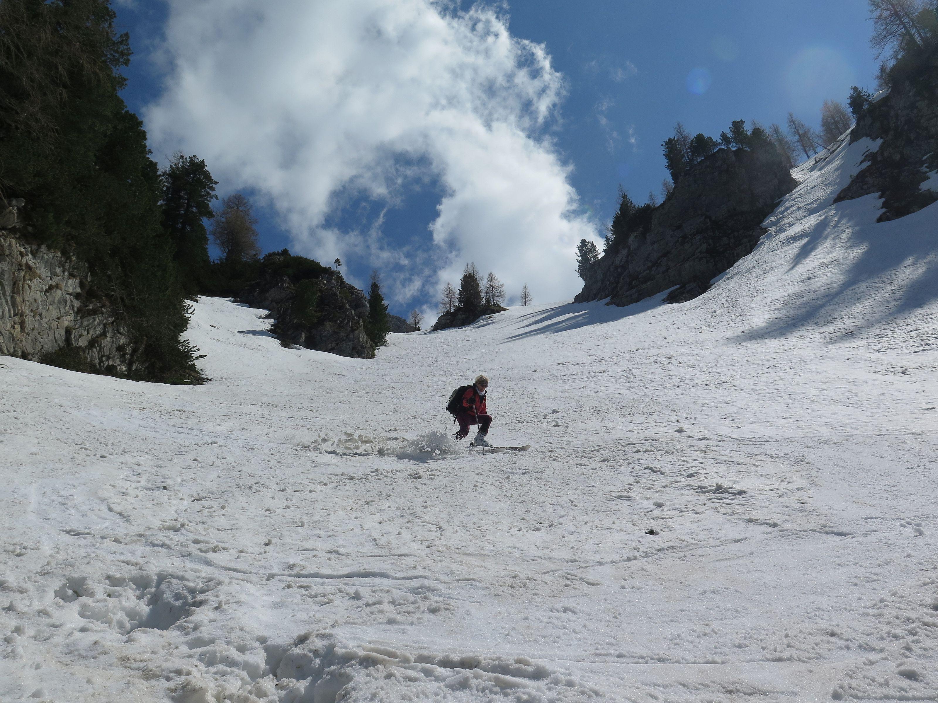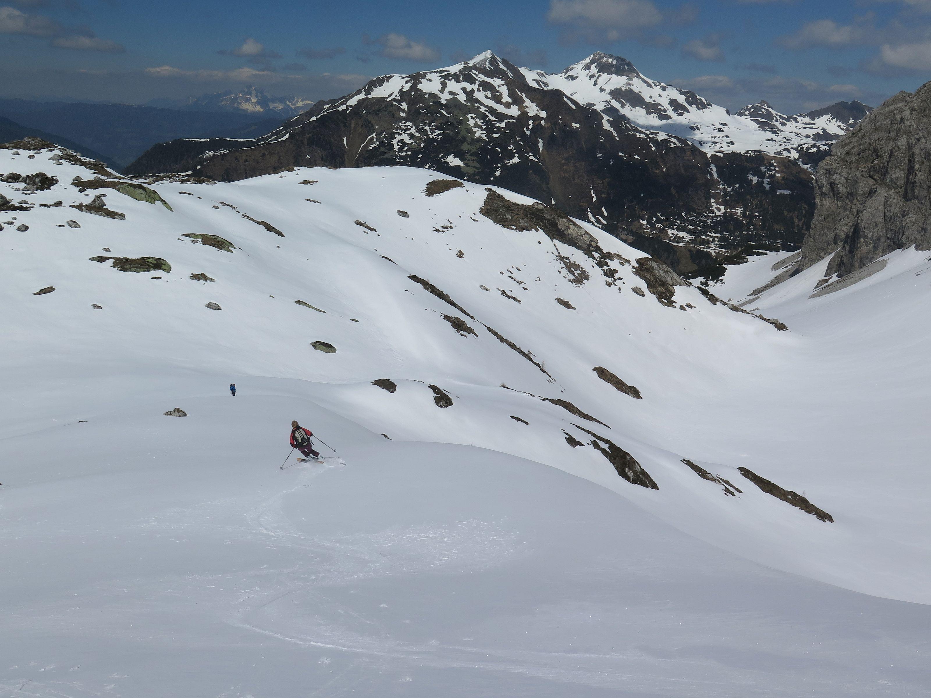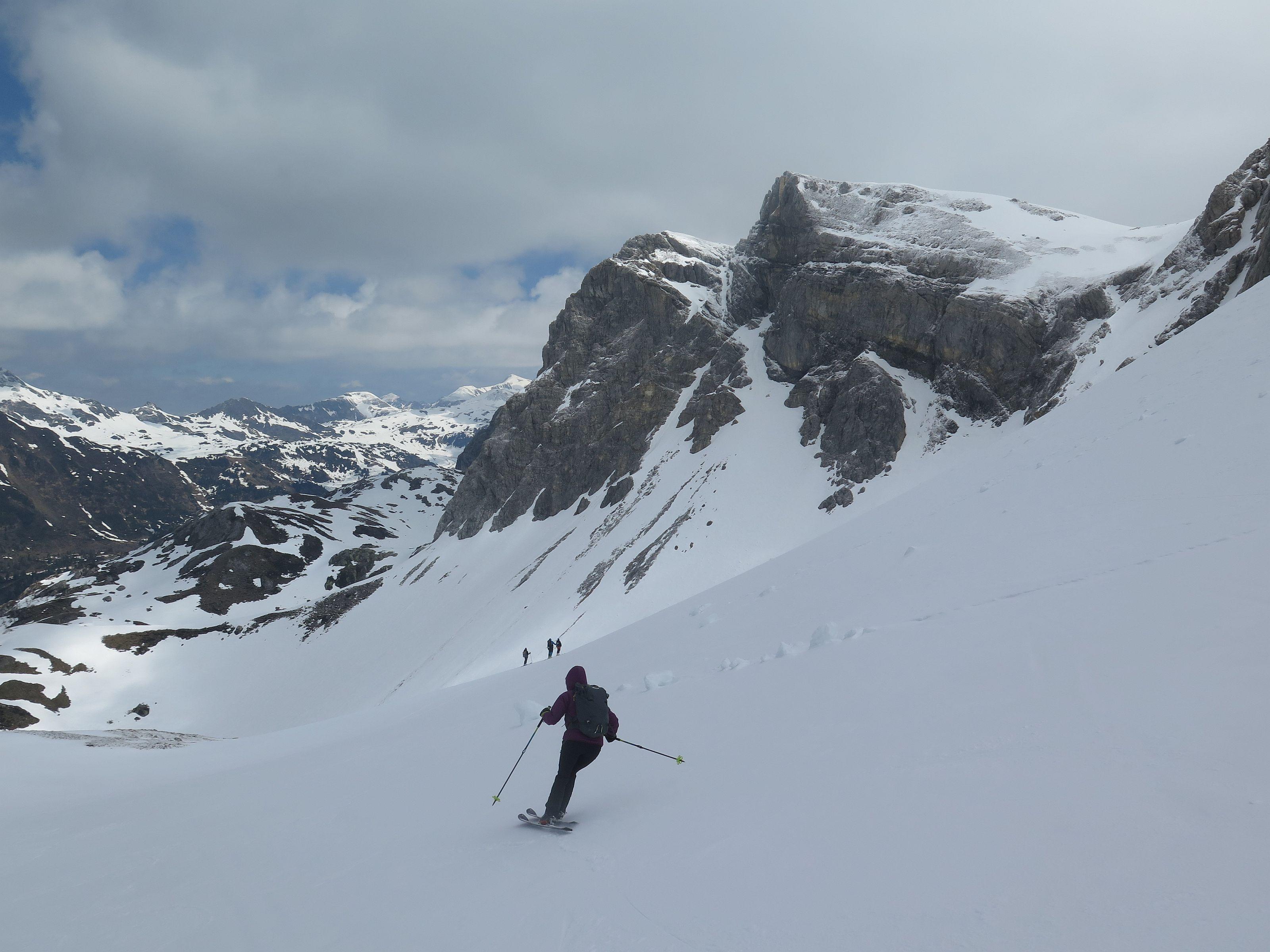 Im Aufstieg : Wolken, Nebel, lebhafter Wind und trübe Gesichter , bei der Abfahrt Auflockerungen, im oberen Abfahrtsbereich geringe Pulverschneeauflage auf festen glatten Flächen, im unteren Teil Firn und strahlende Gesichter.