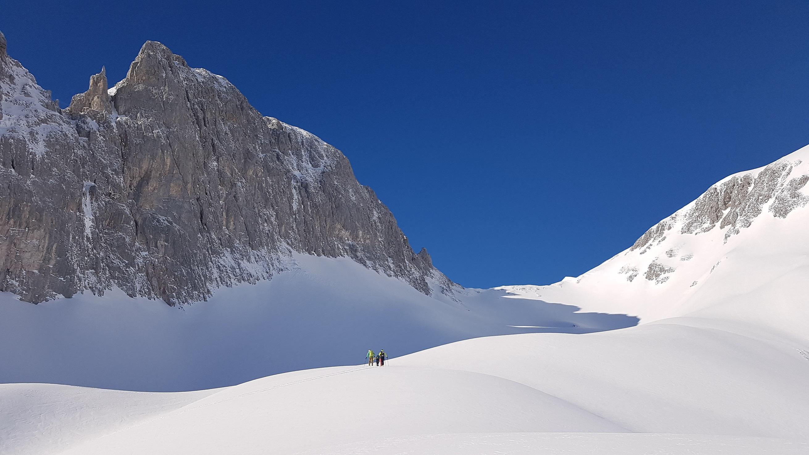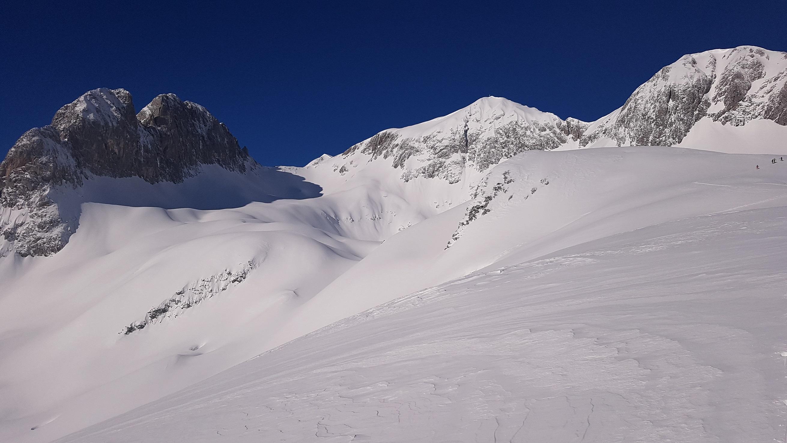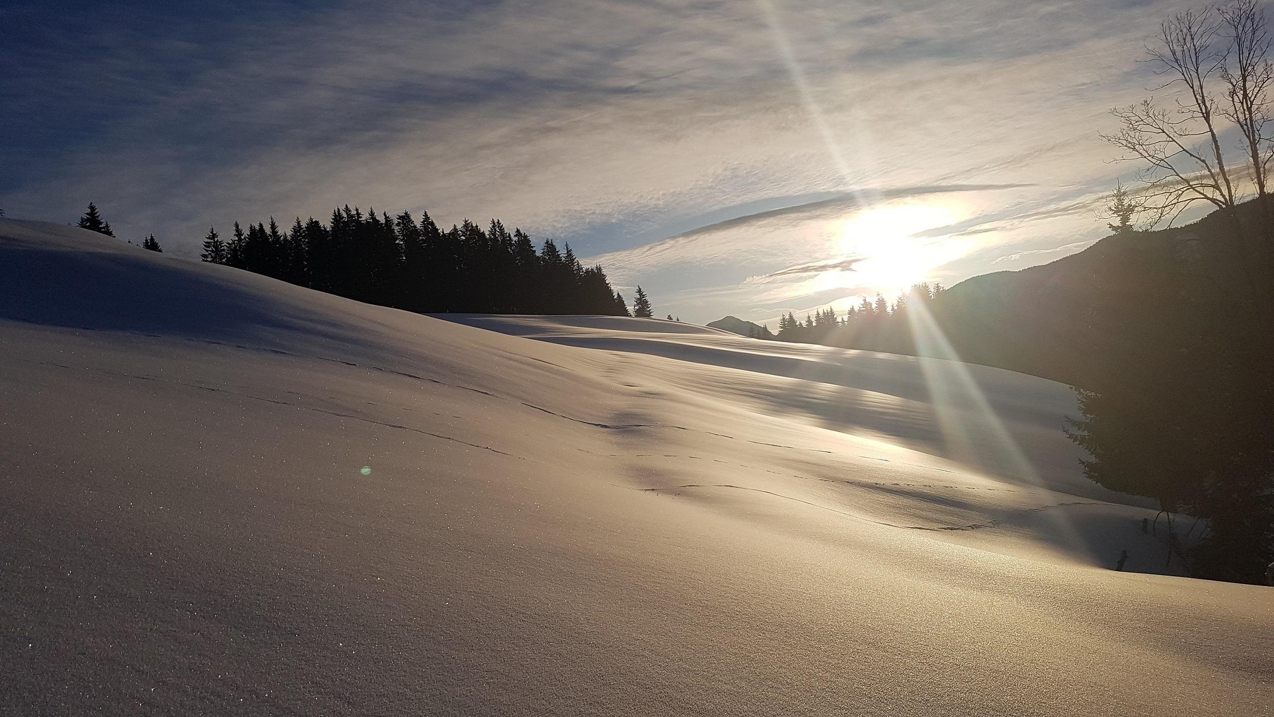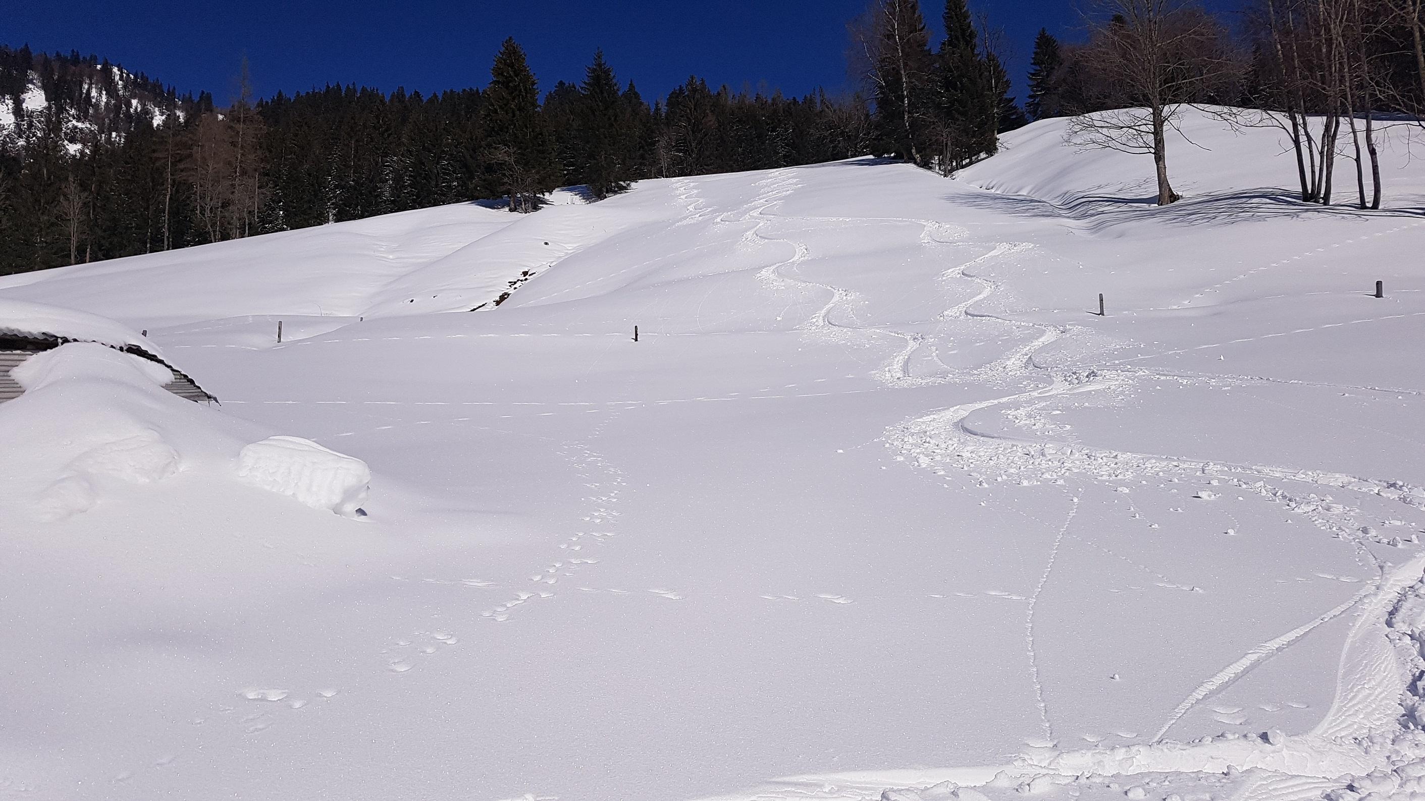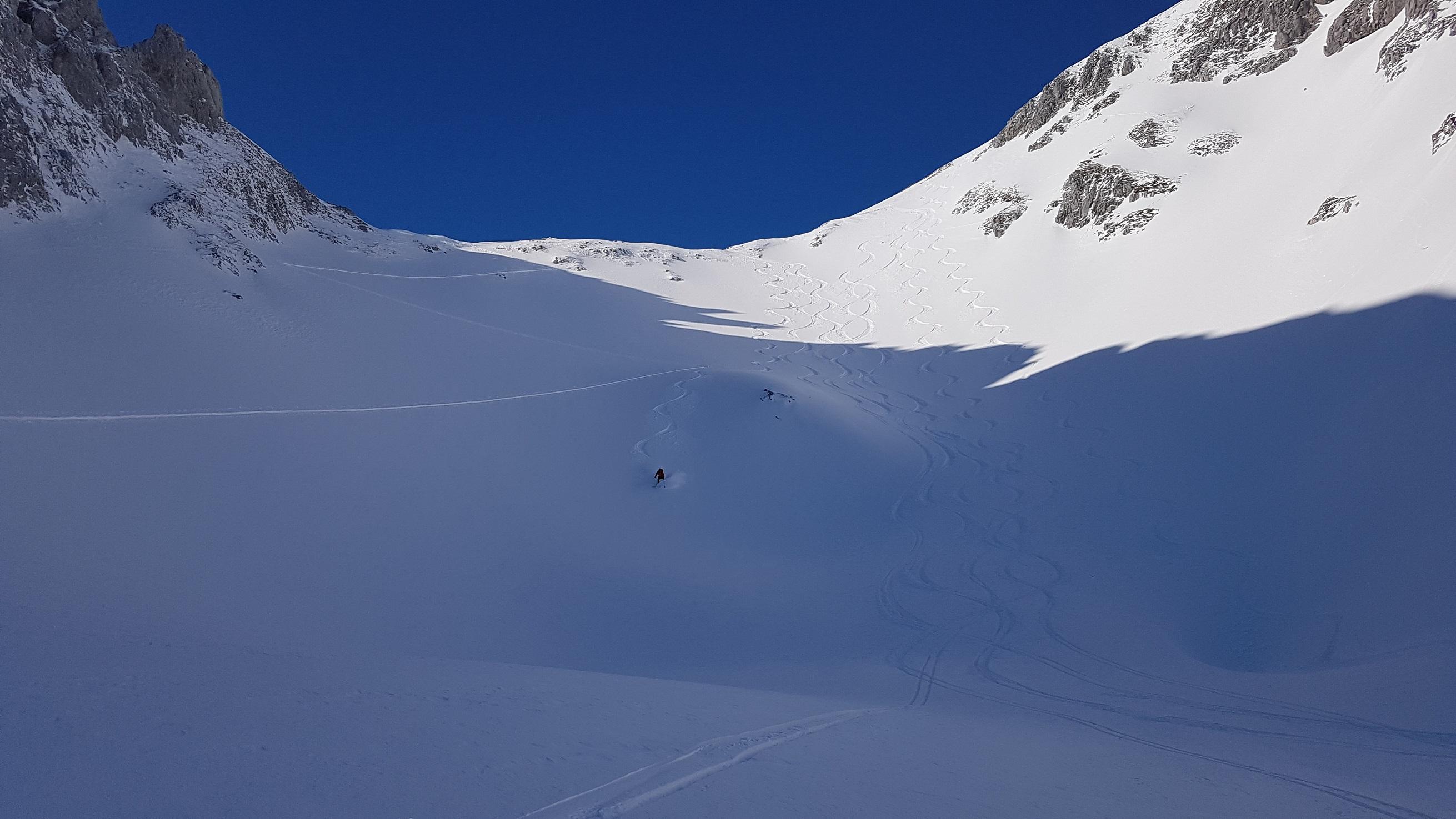 Fazit: Ständig gut ausnutzbares kupiertes Gelände, hier macht Spuren eine Freude. Traumhafte 1.250 hm Pulverabfahrt in vollendeter Form.