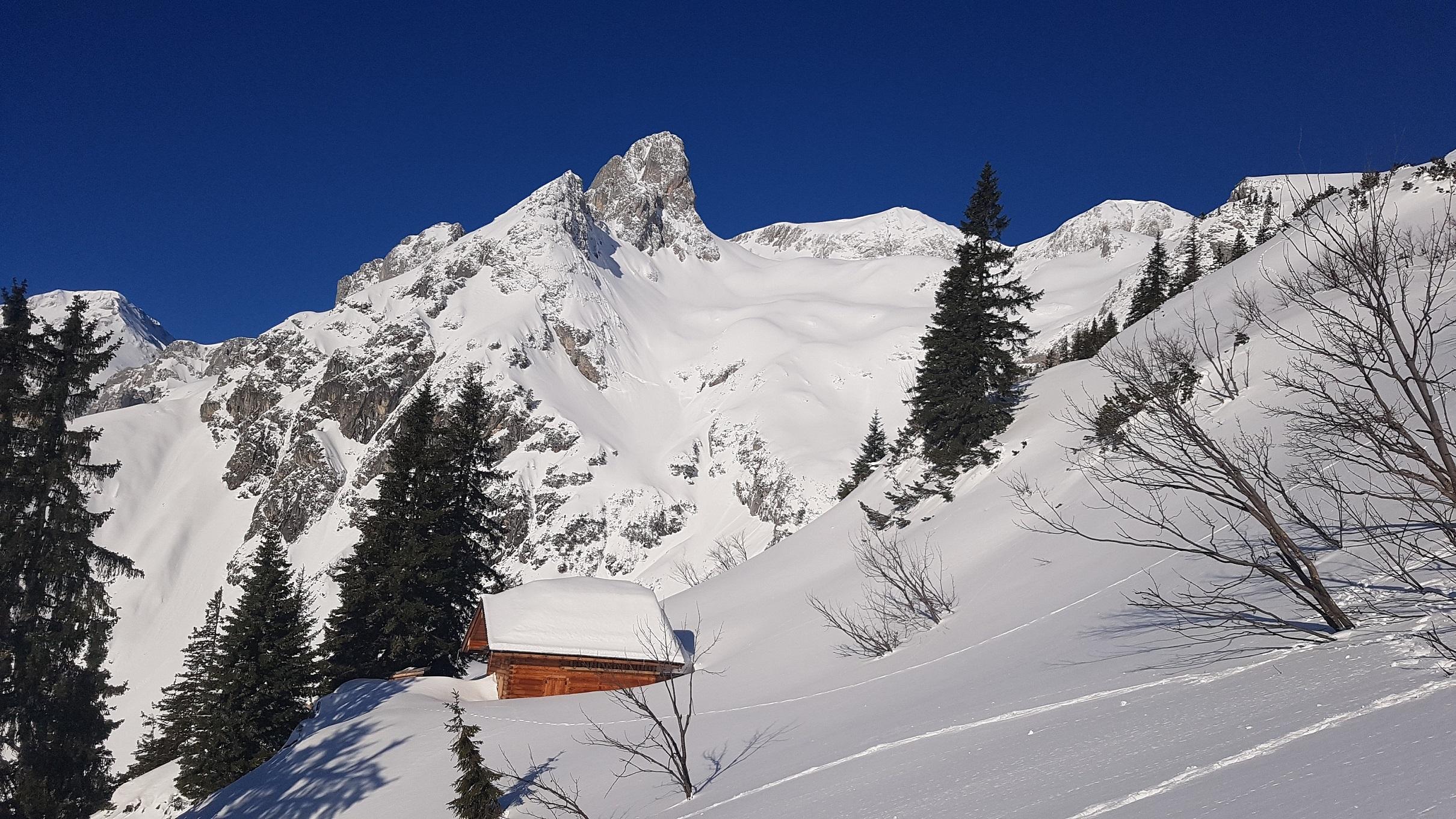 Hier den unverspurten Hängen als erster zu folgen ist schon fast ein kleines Privileg. Immer die derzeitigen Verhältnisse im Auge treffen wir aber überraschenderweise auf gute Verhältnisse. Die dichte und lichte Waldpassage am Anfang bzw. bis ca. Jagdhütte hat bei ca. 60 cm die Störschicht vom Regen. Daher Gelände unbedingt ausnutzen. Ab 2000 Meter kompakter Schnee im Kar bzw. vor dem Gipfelgrat.