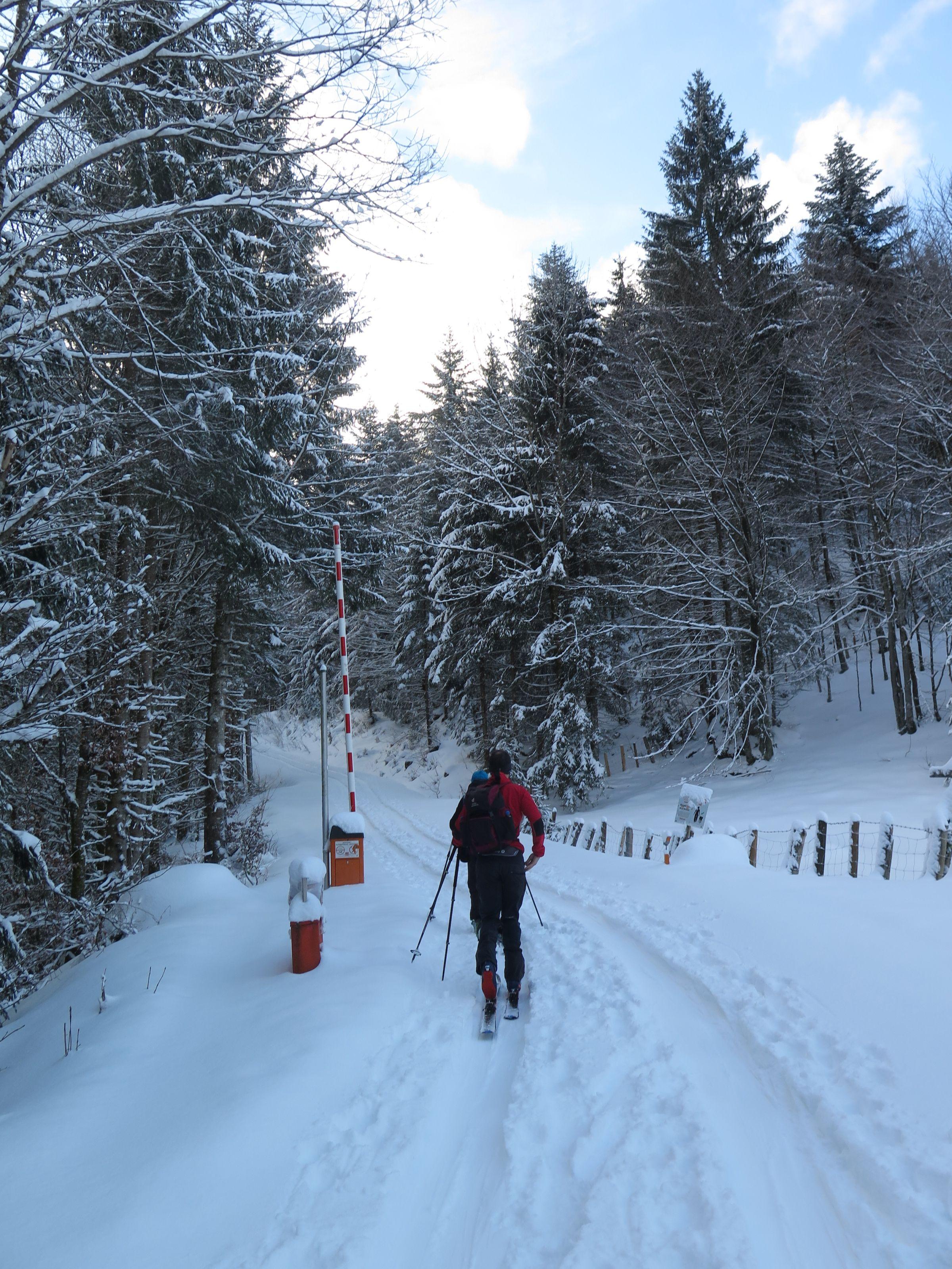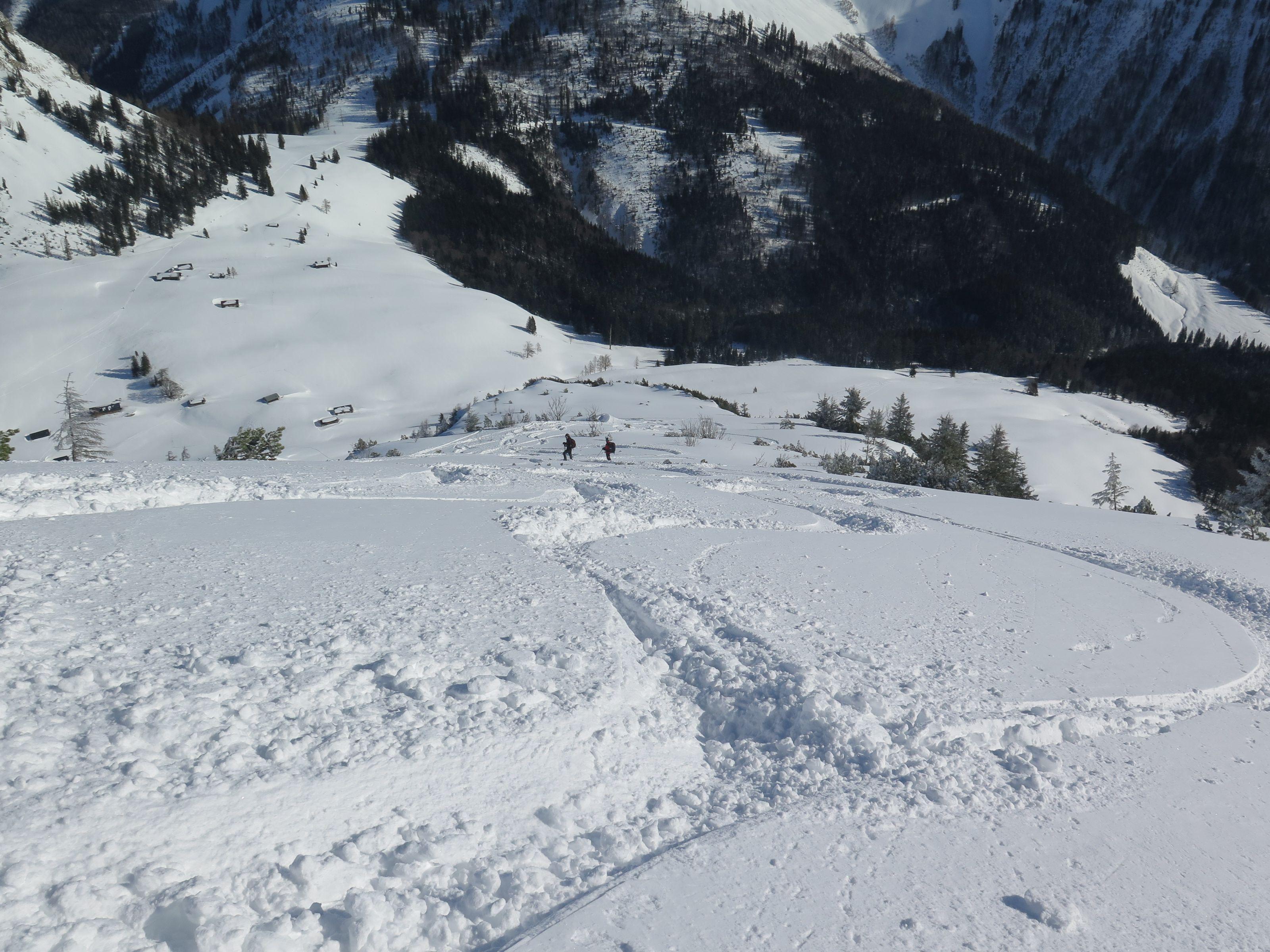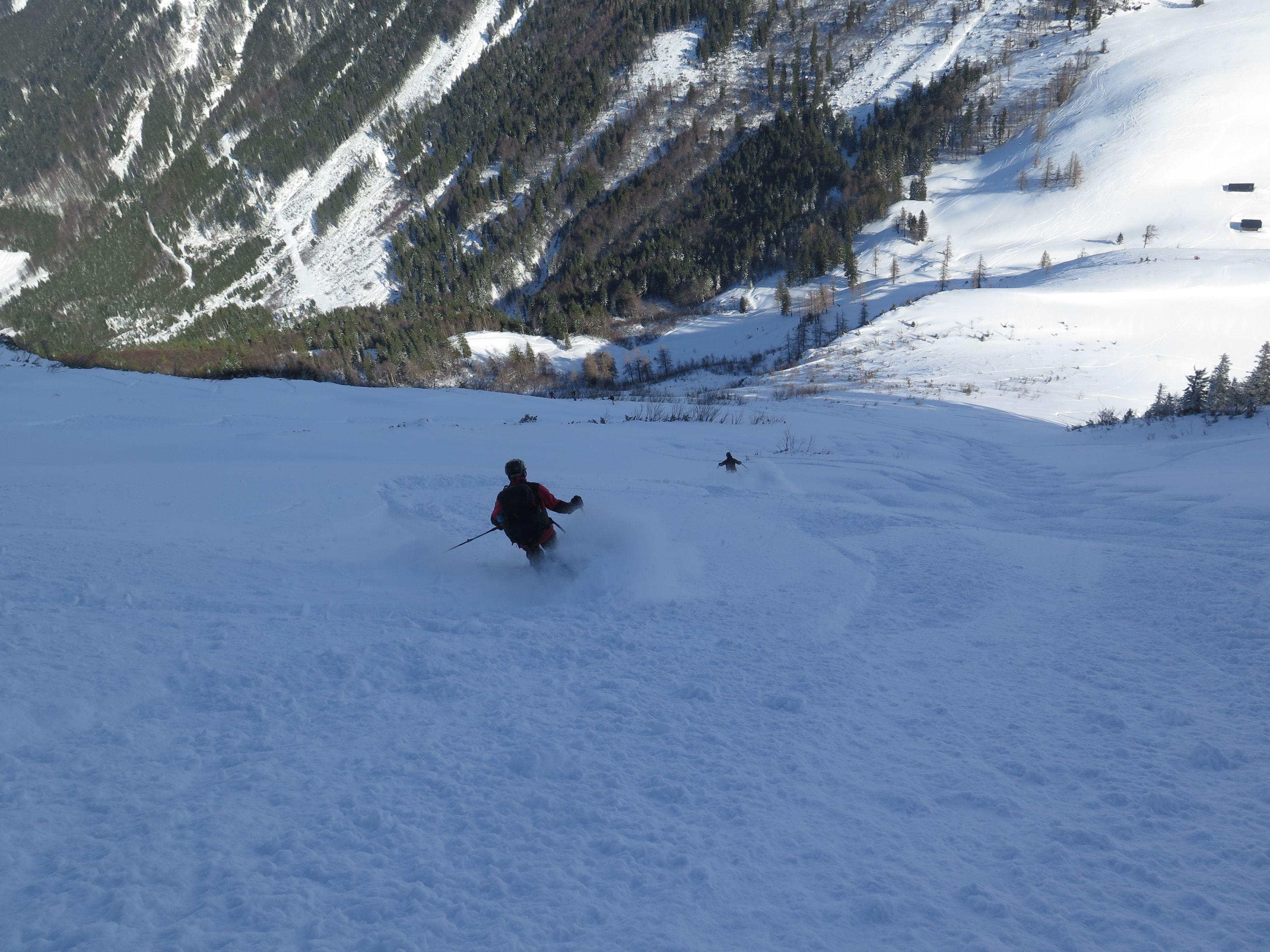 Forststraße von der Genneralm zum Parkplatz ohne Feindkontakt zu befahren. Vom Gennerhorn selten so gute Abfahrtsverhältnisse wie heute.