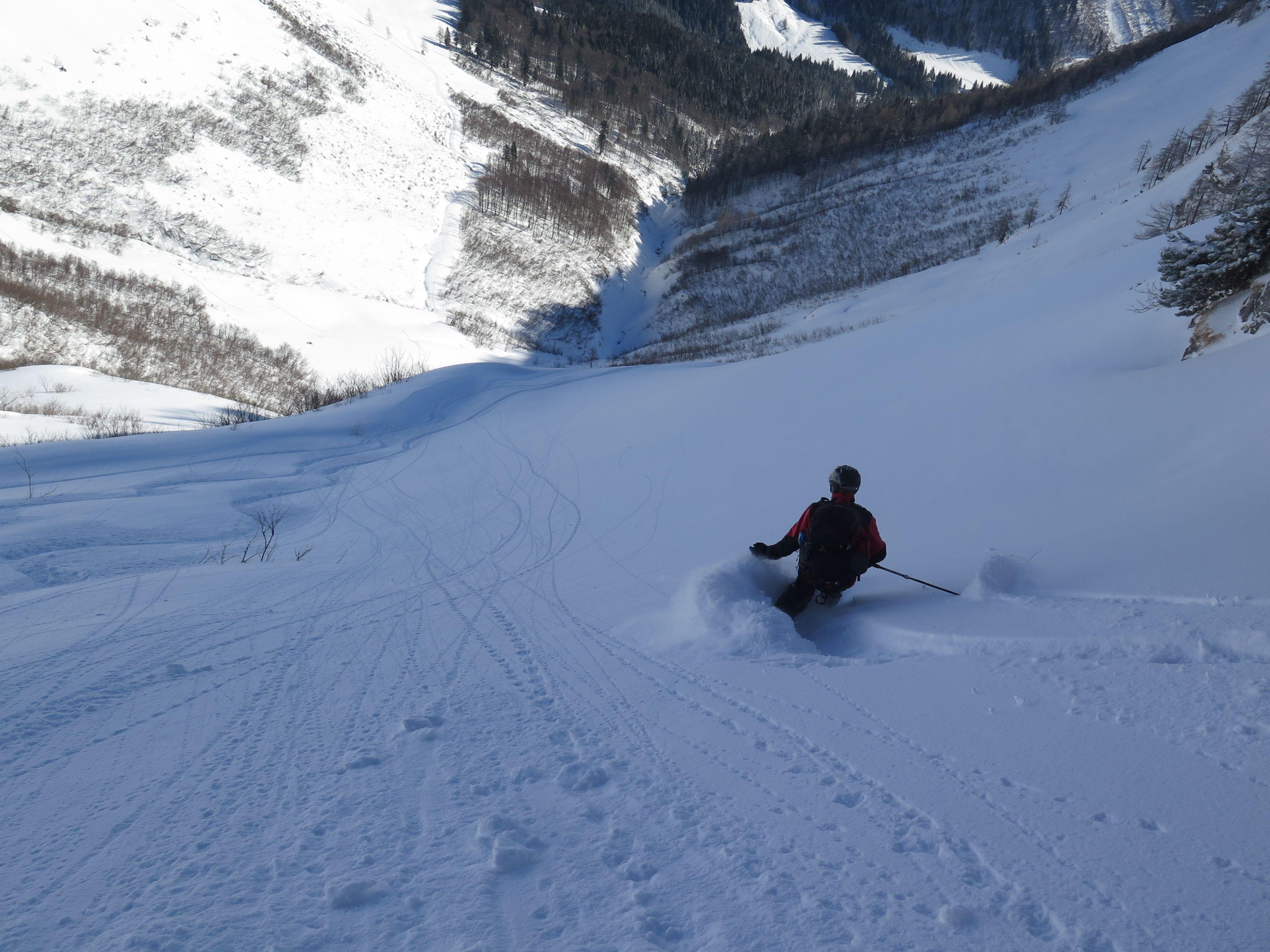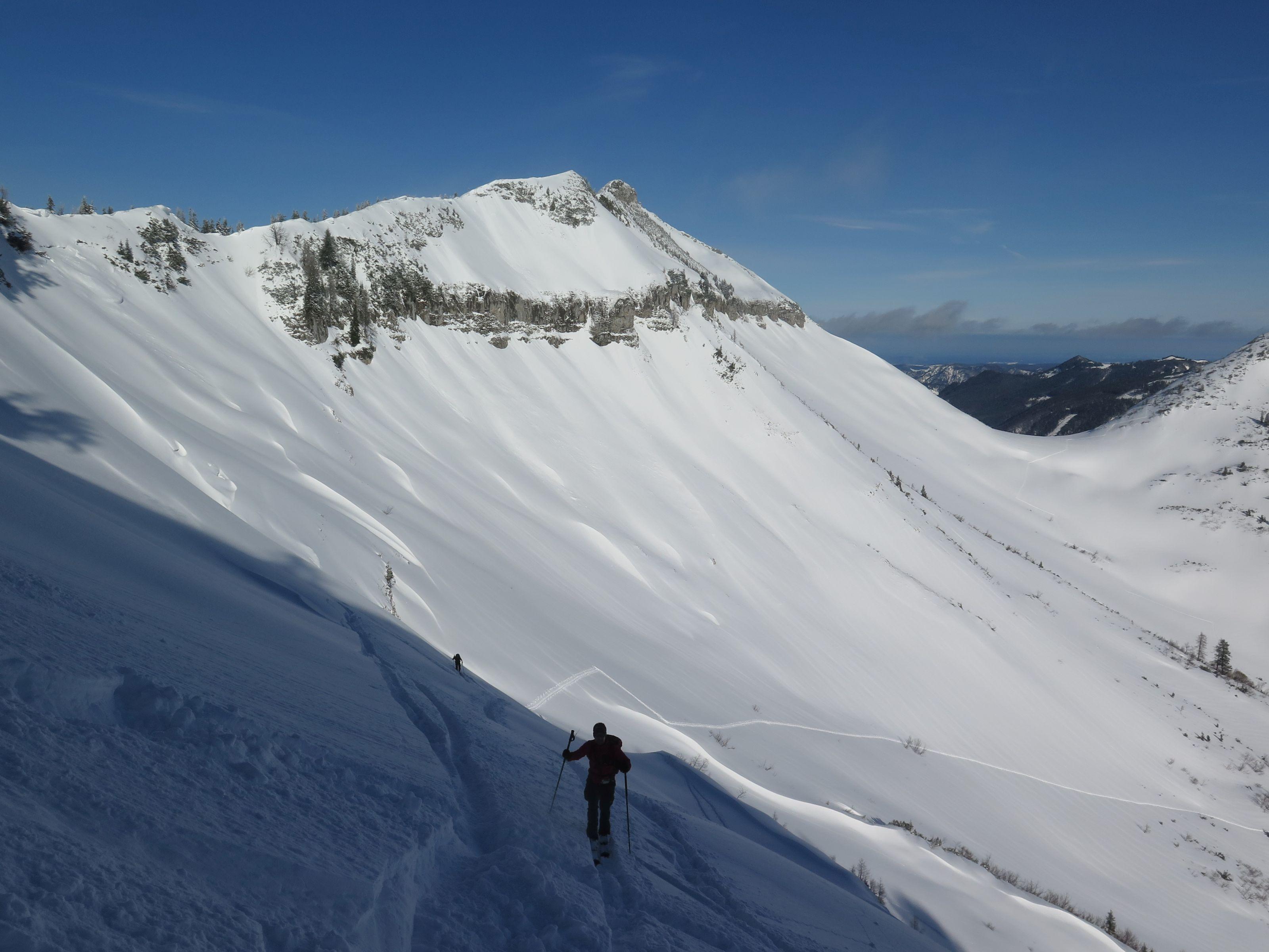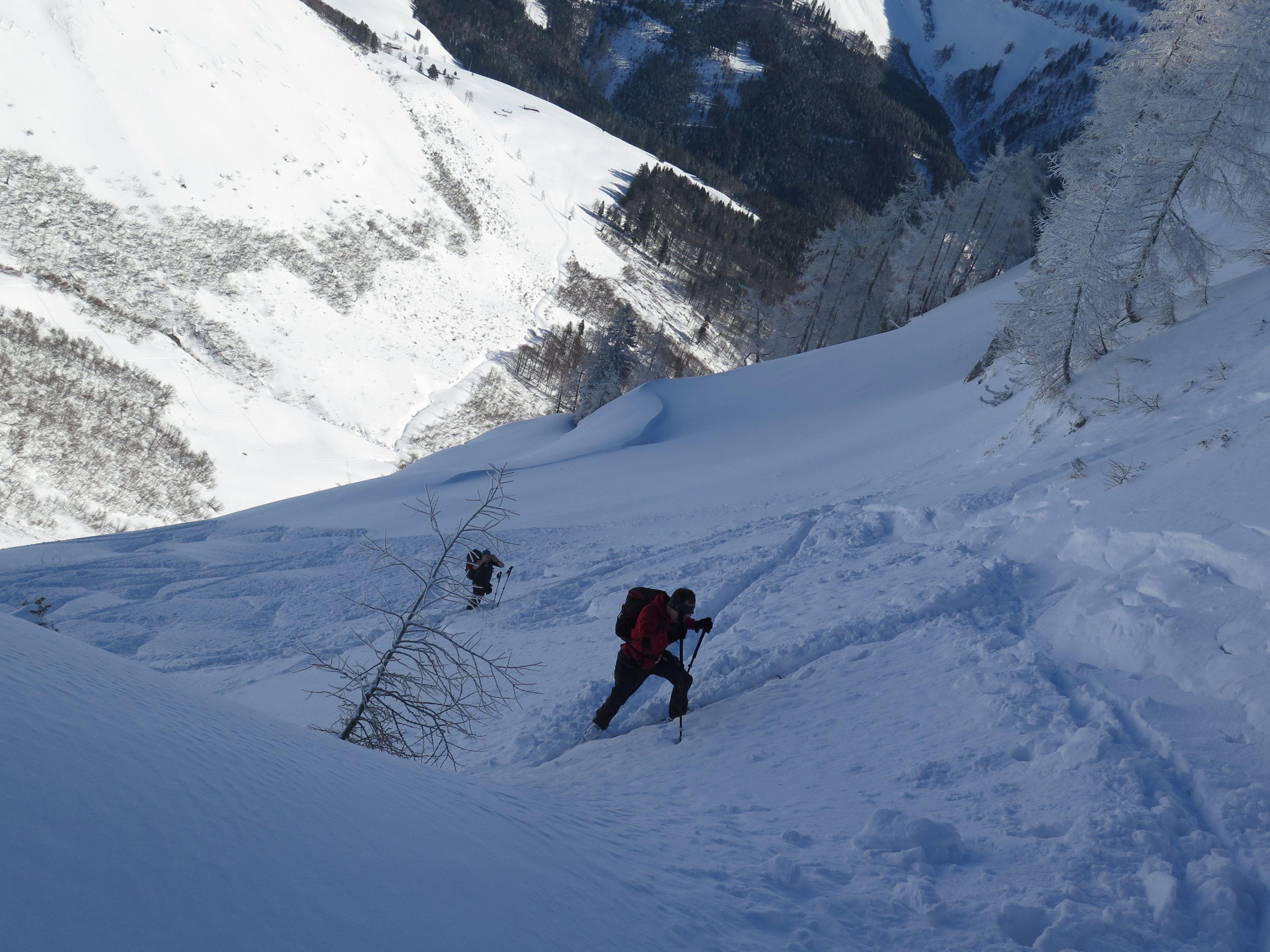 Forststraße von der Genneralm zum Parkplatz ohne Feindkontakt zu befahren. Vom Gennerhorn selten so gute Abfahrtsverhältnisse wie heute.