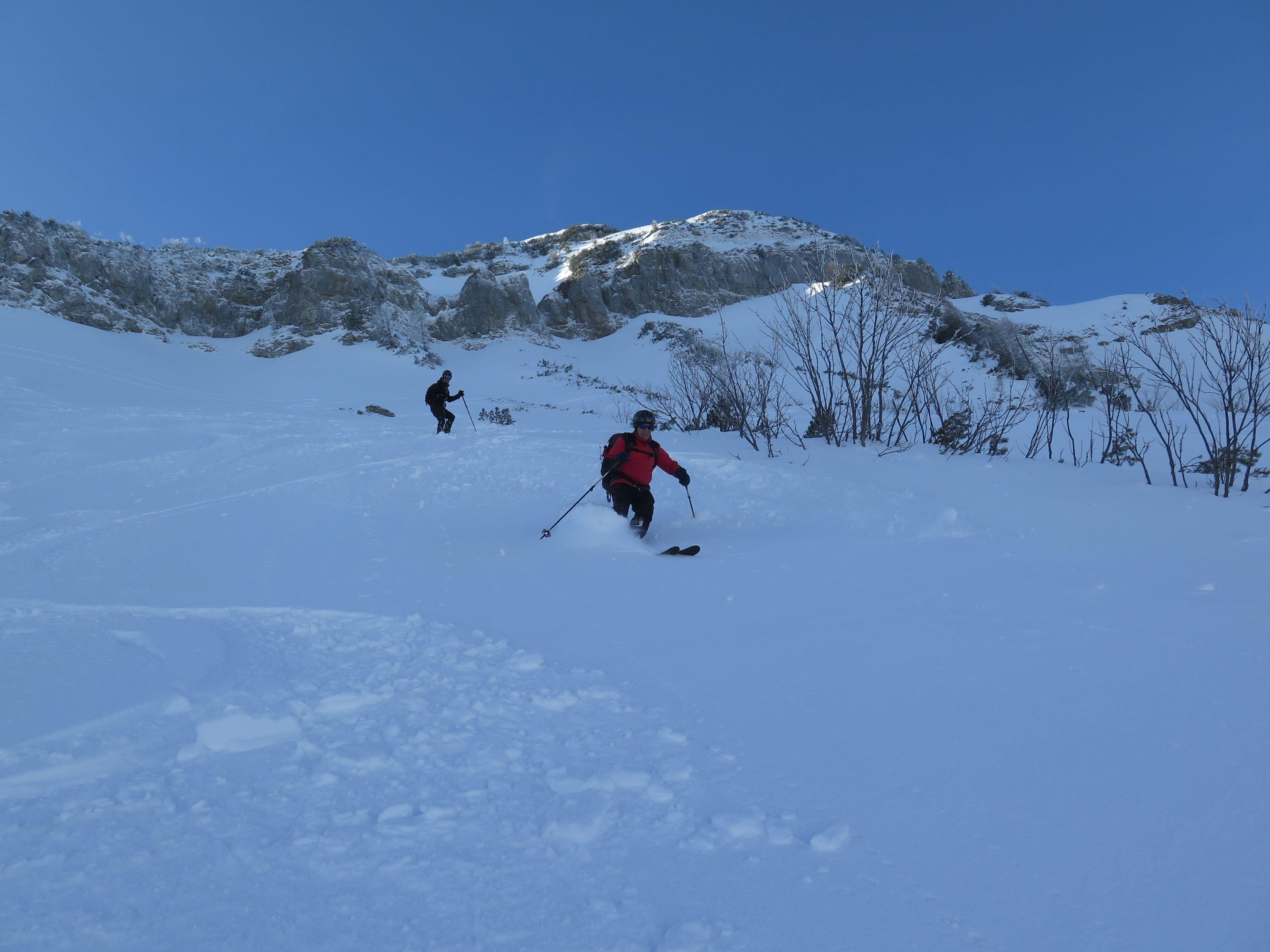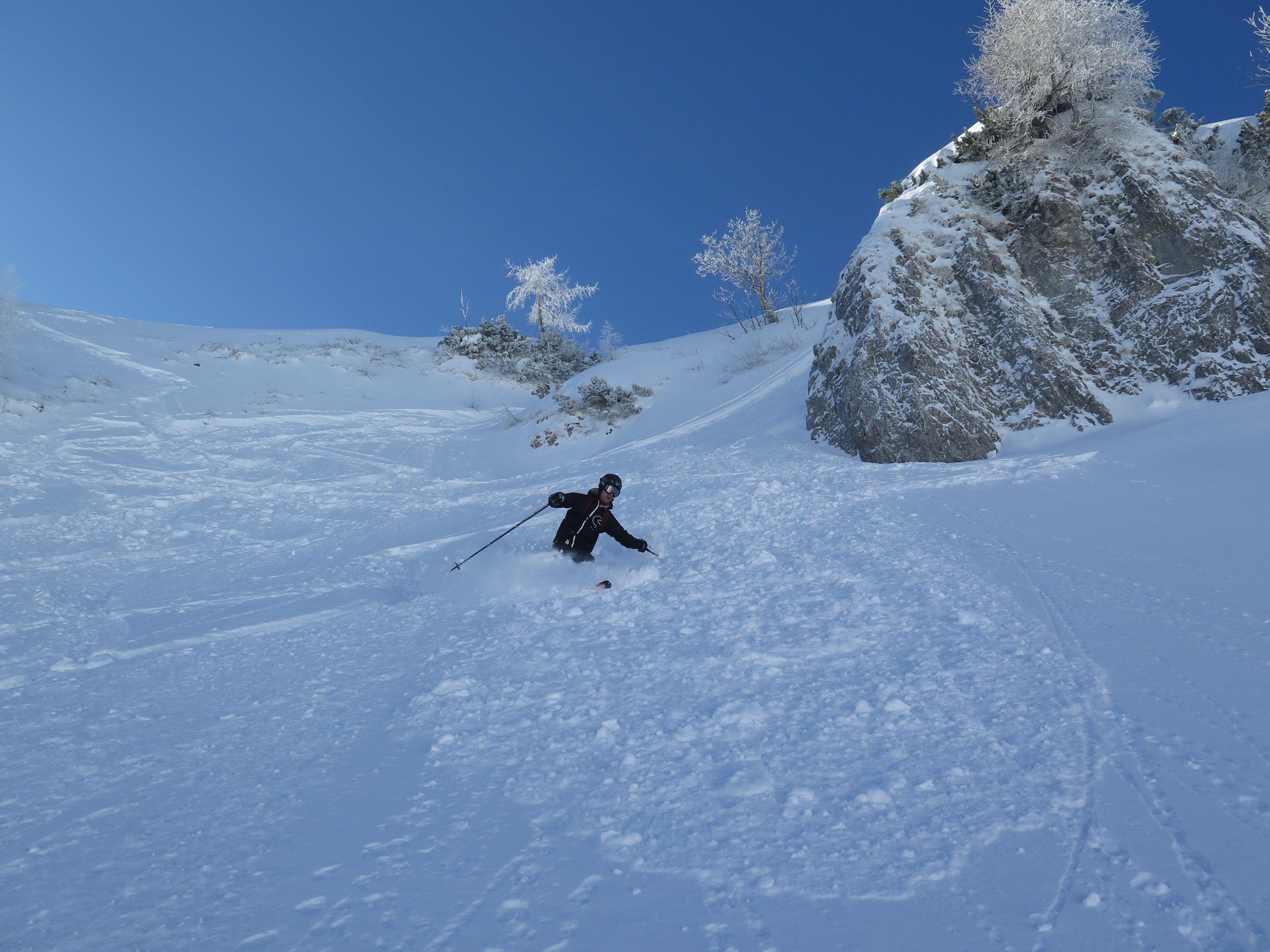 Sonniges Wetter, auf den Gipfeln lästiger Wind. Schnee : Pulverschnee.
