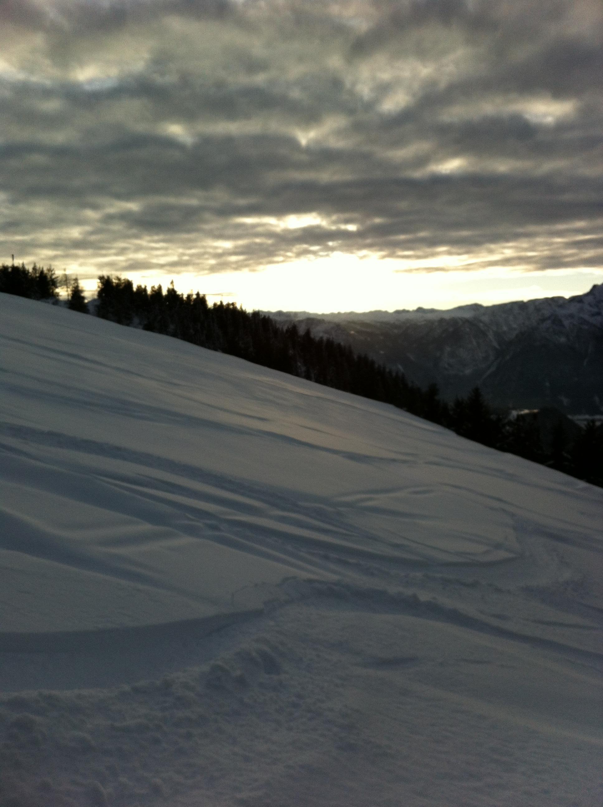 Gute Verhältnisse am Trattberg. Parkgebühr 4 € nach dem Schranken. Die Strasse ist nicht geräumt, sondern von dem Raupengerät der Enzianhütte präpariert. Sehr viele Schlittenfahrer unterwegs. Die Normalabfahrt ist total ausgefahren, daneben gibt es noch schönen Pulver. Kein Steinkontakt bei der Abfahrt