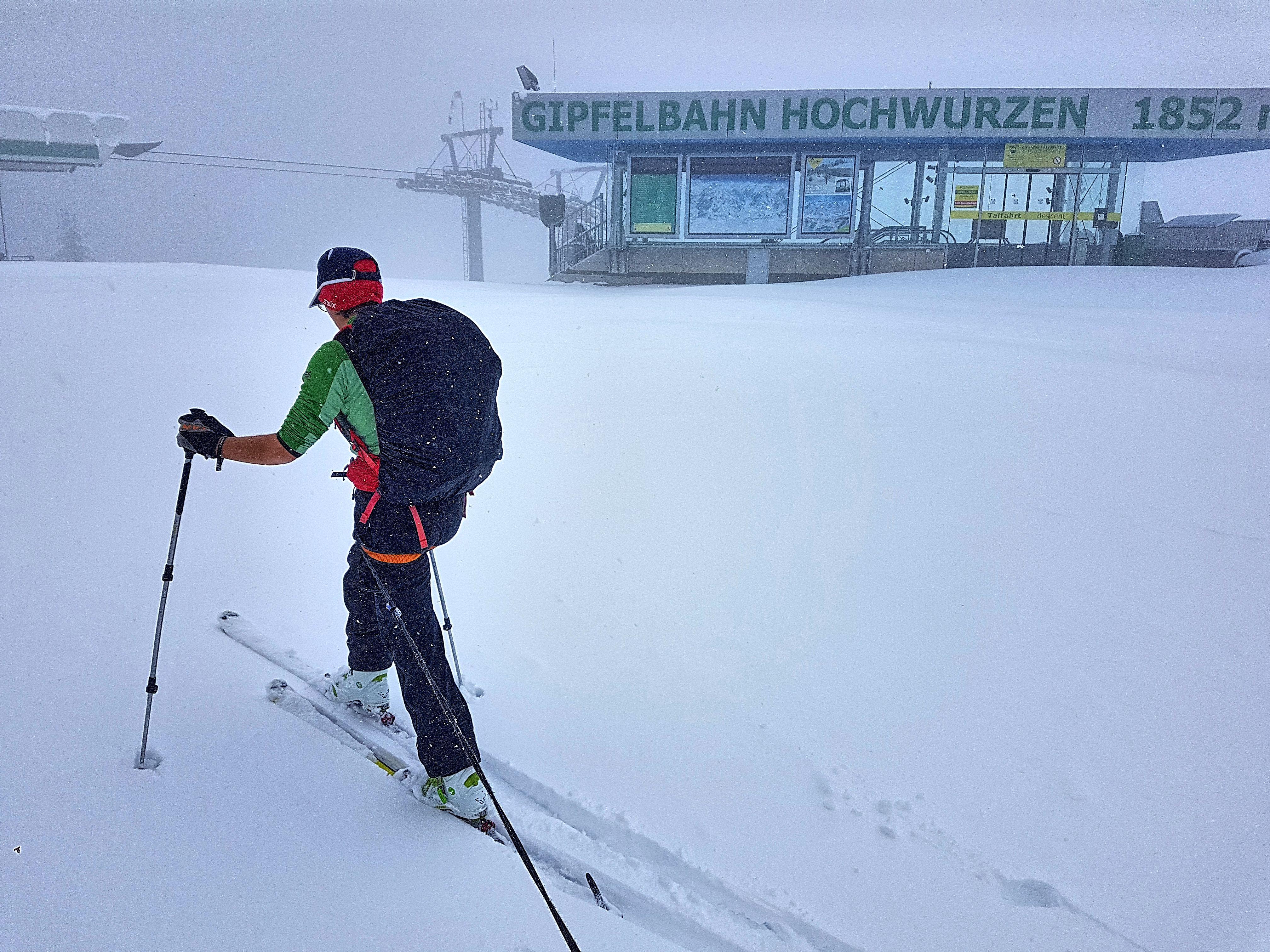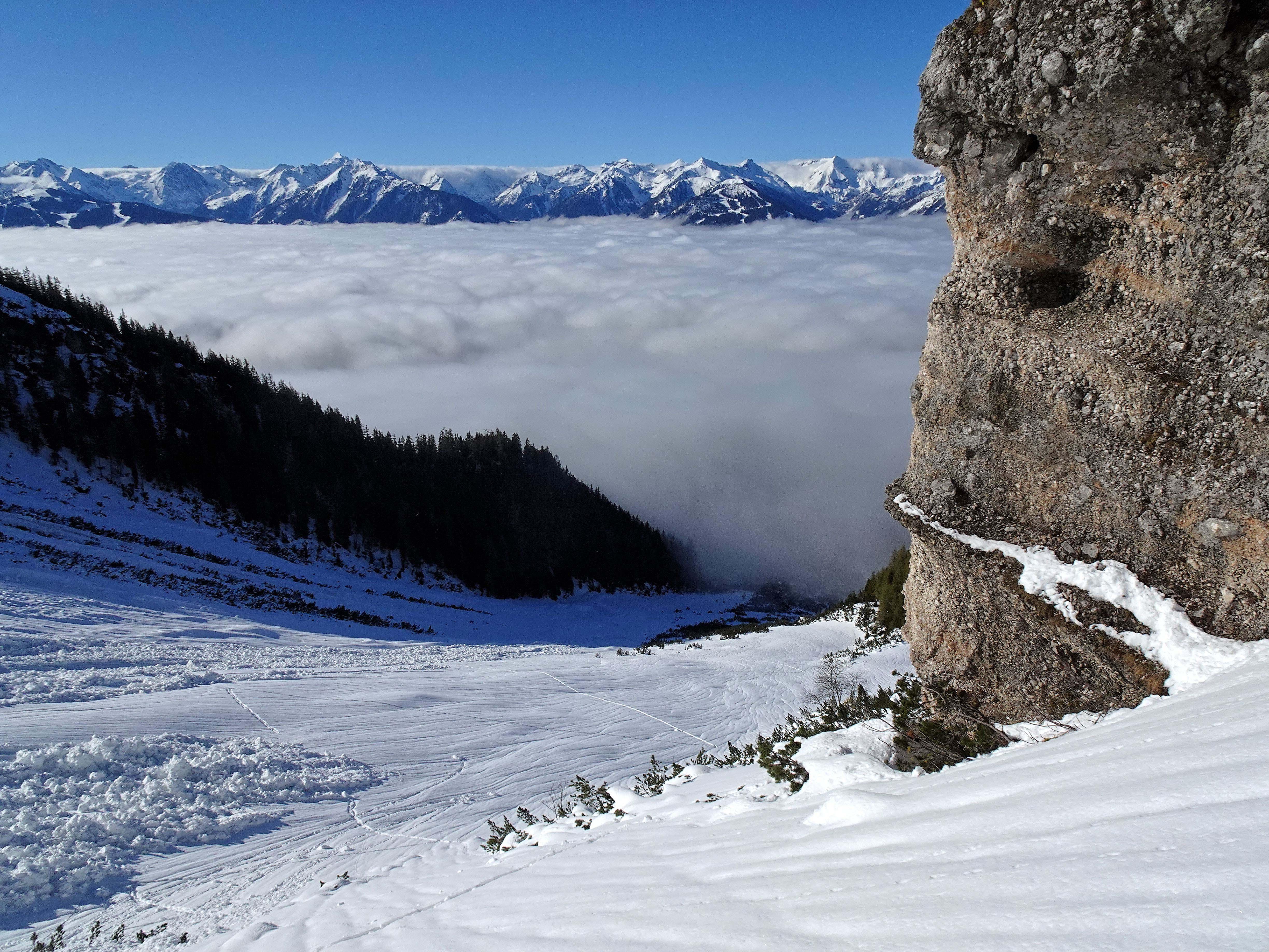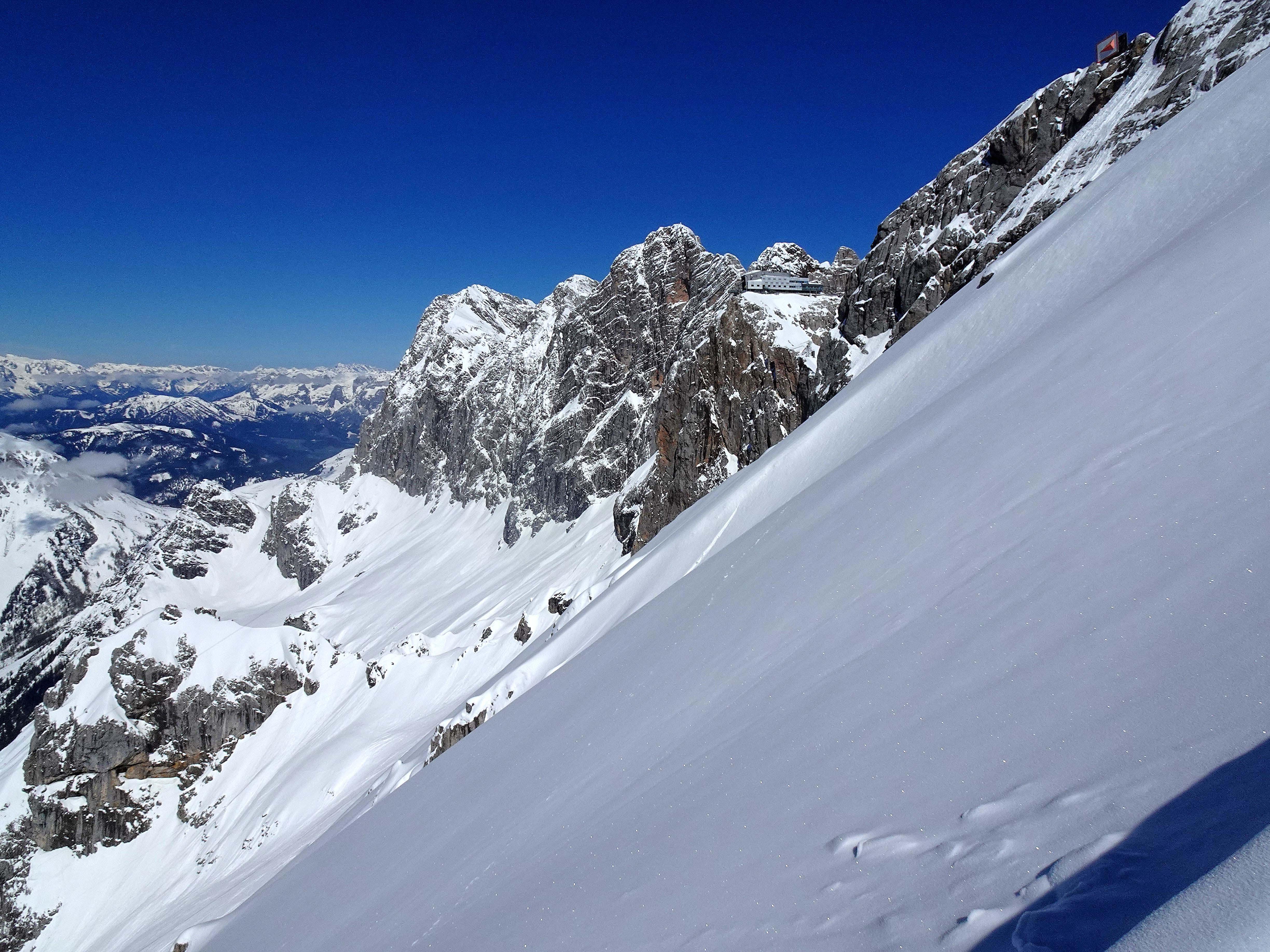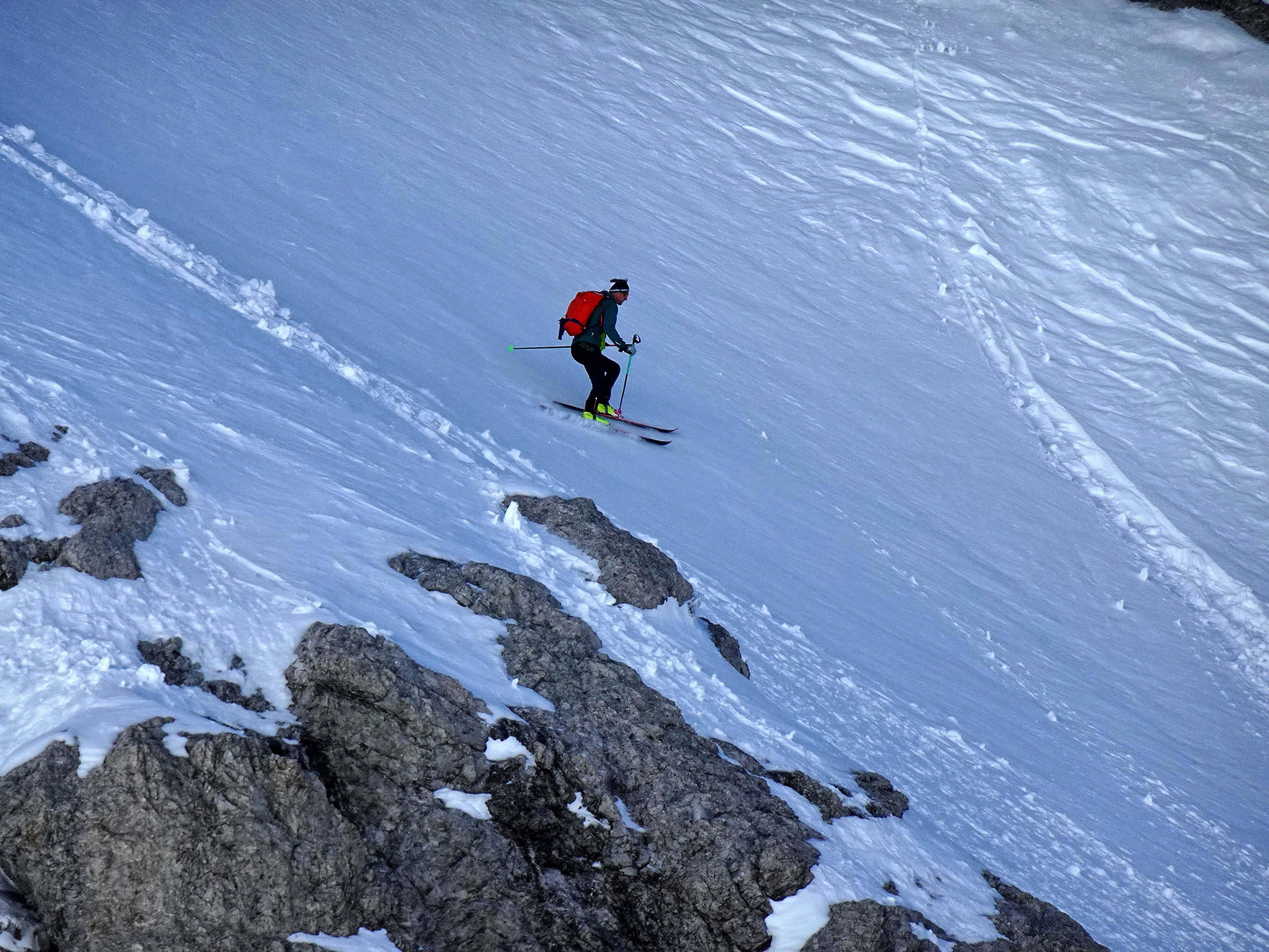 Nach einigen Tiefschneetouren heute nochmals hinterer Türlspitz ab Ramsau. Durchbruch durch die Hochnebeldecke bei 1500m, darunter der Schnee mangels Abstrahlung nass, ebenso ostseitig um 7:30 Uhr. Schattseitig Harschdeckel, der erst ab 2000m hält. Edelgriesboden bestens ausgeschneit, frühmorgens wie eine präparierte Schipiste zu fahren. Ostseitige Edelgrieseinfahrtbereits weich mit "Schneckenbildung" bis Mannsgröße ausgehend von Aufstiegsspur bzw. ab überwechteten Grat spontan.