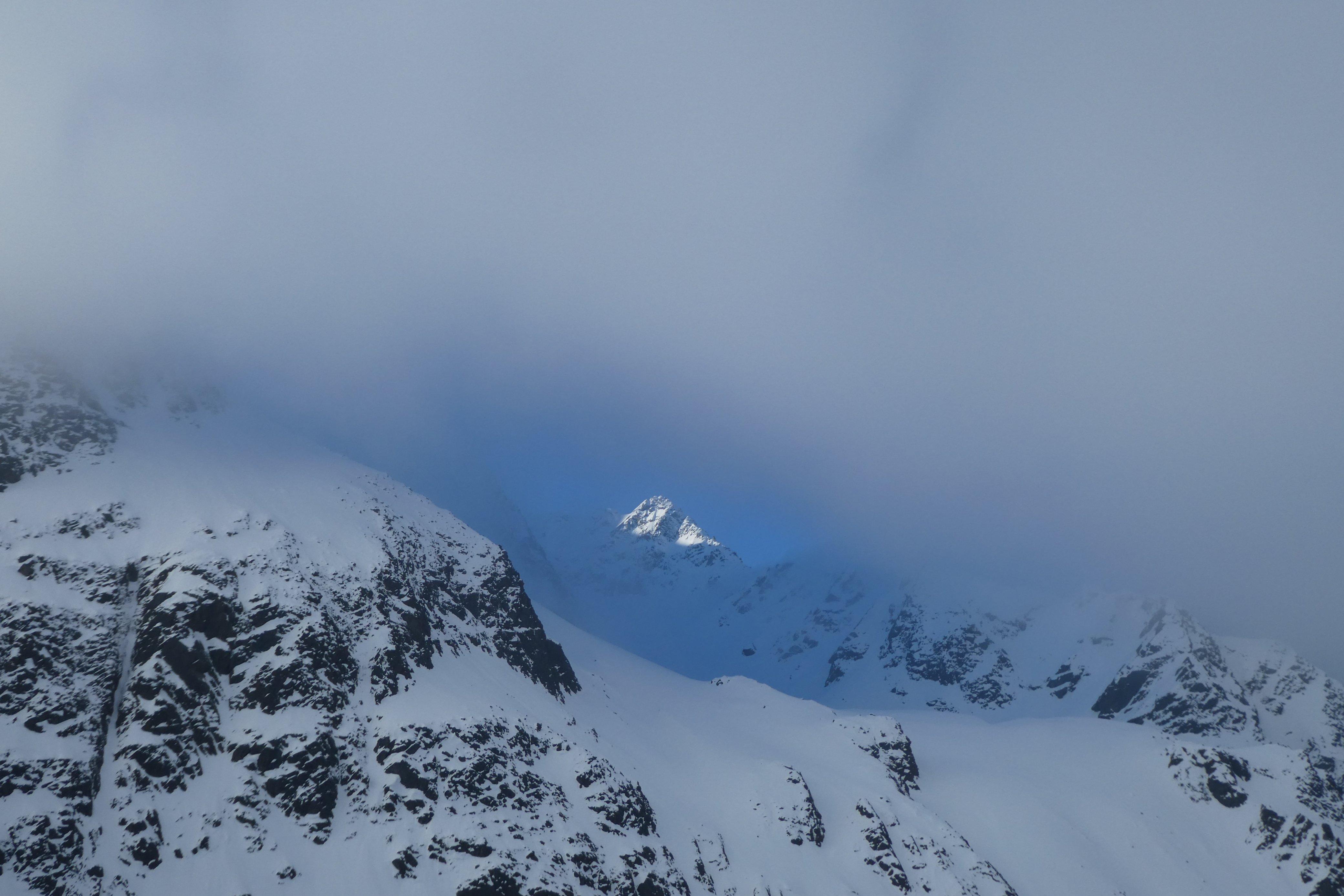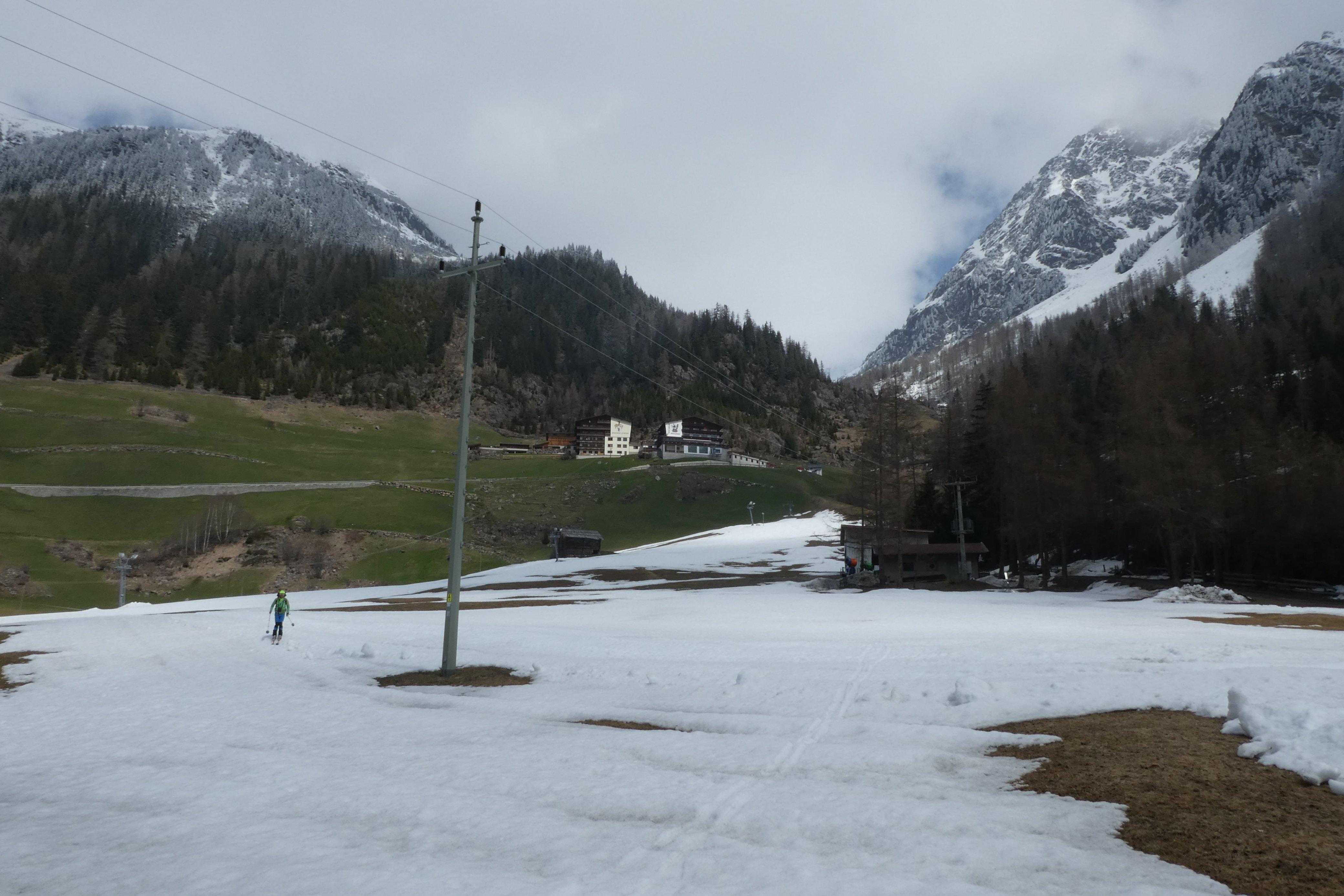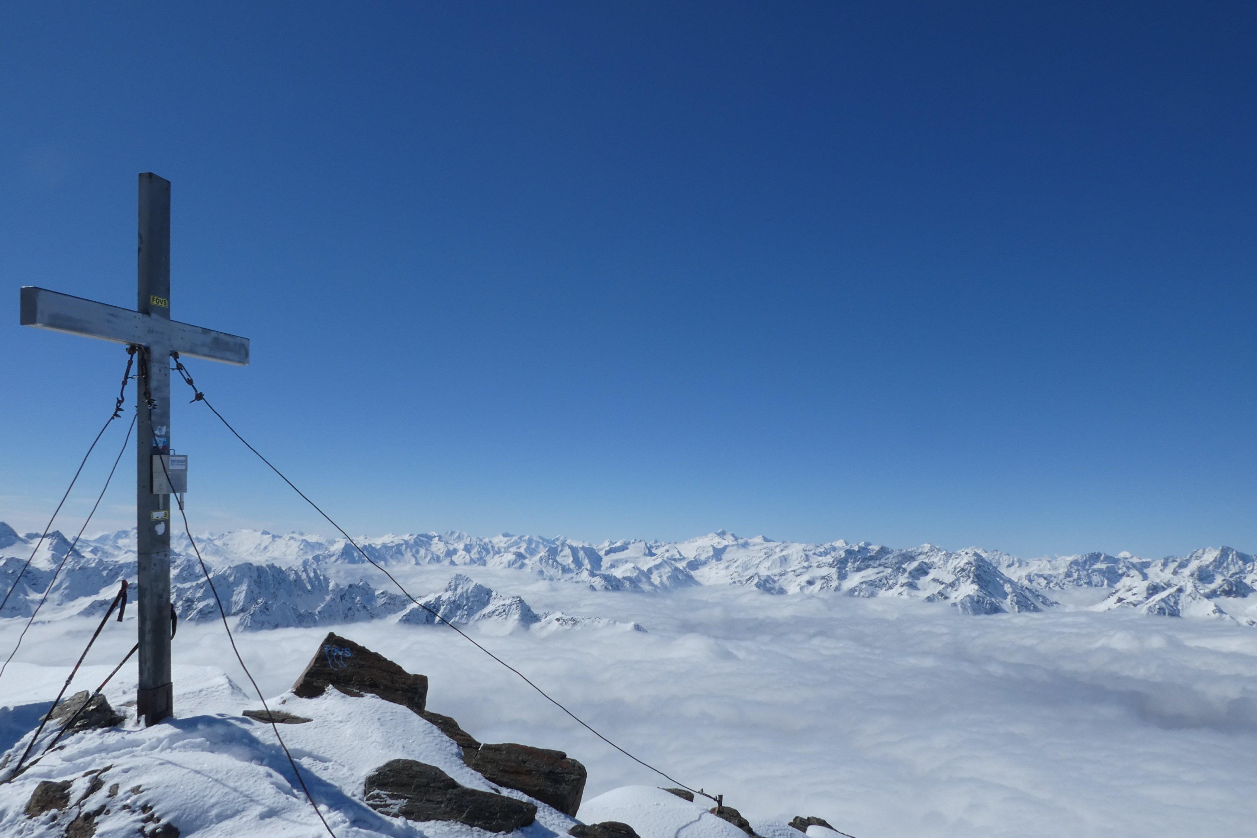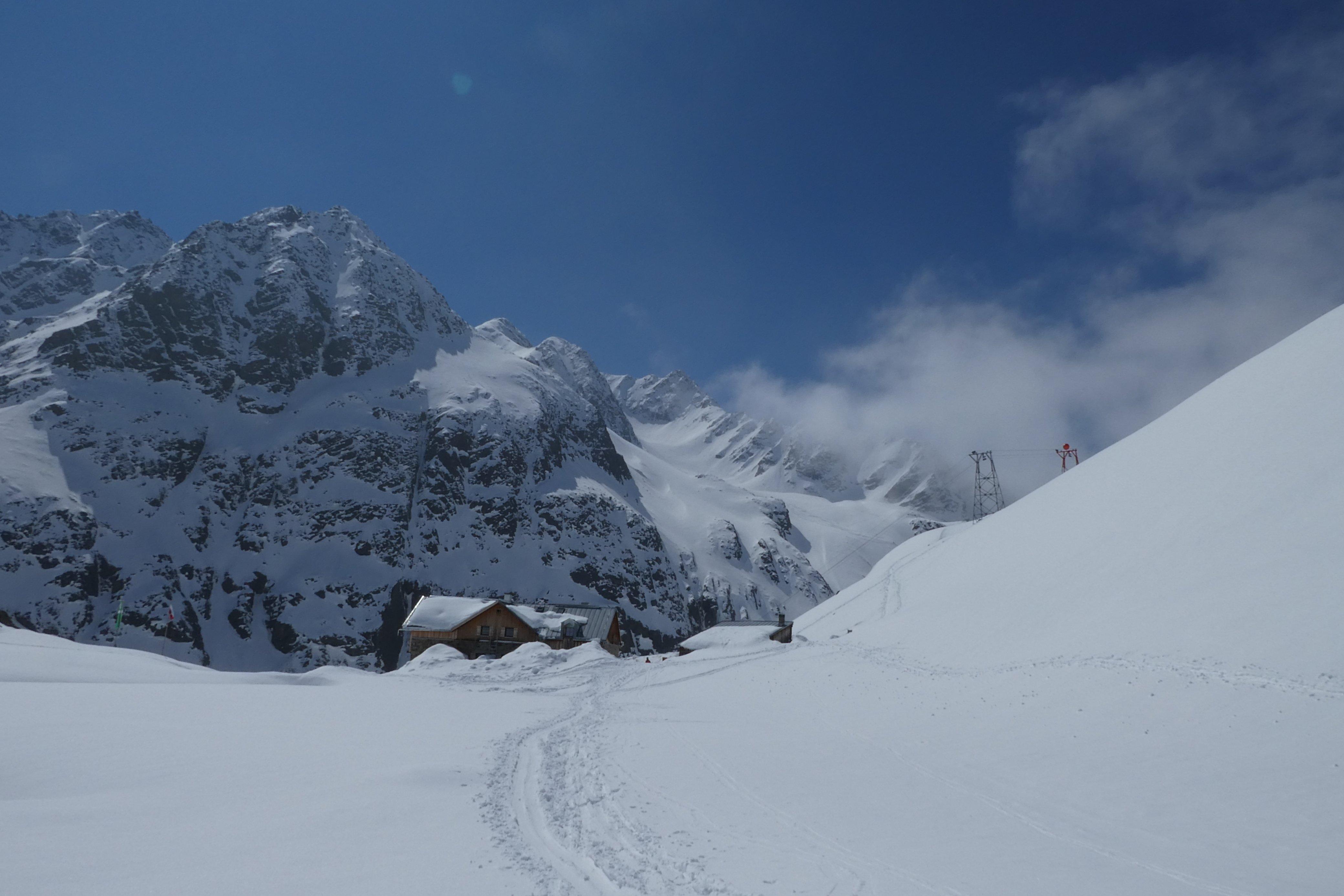 Der Grieskogel und die perfekten Bedingungen waren immerhin Trost genug: Ausreichend kalte Nacht zuvor, Stubaier Insel im Nebelmeer, 30 cm Pulver in den Gipfelhängen und genialer Firn bis zur Winnebachseehütte. Auch der Schnee Richtung Tal war noch nicht versumpft, sodass wir bis ca. 200 hm oberhalb von Gries noch fein fahren konnten.