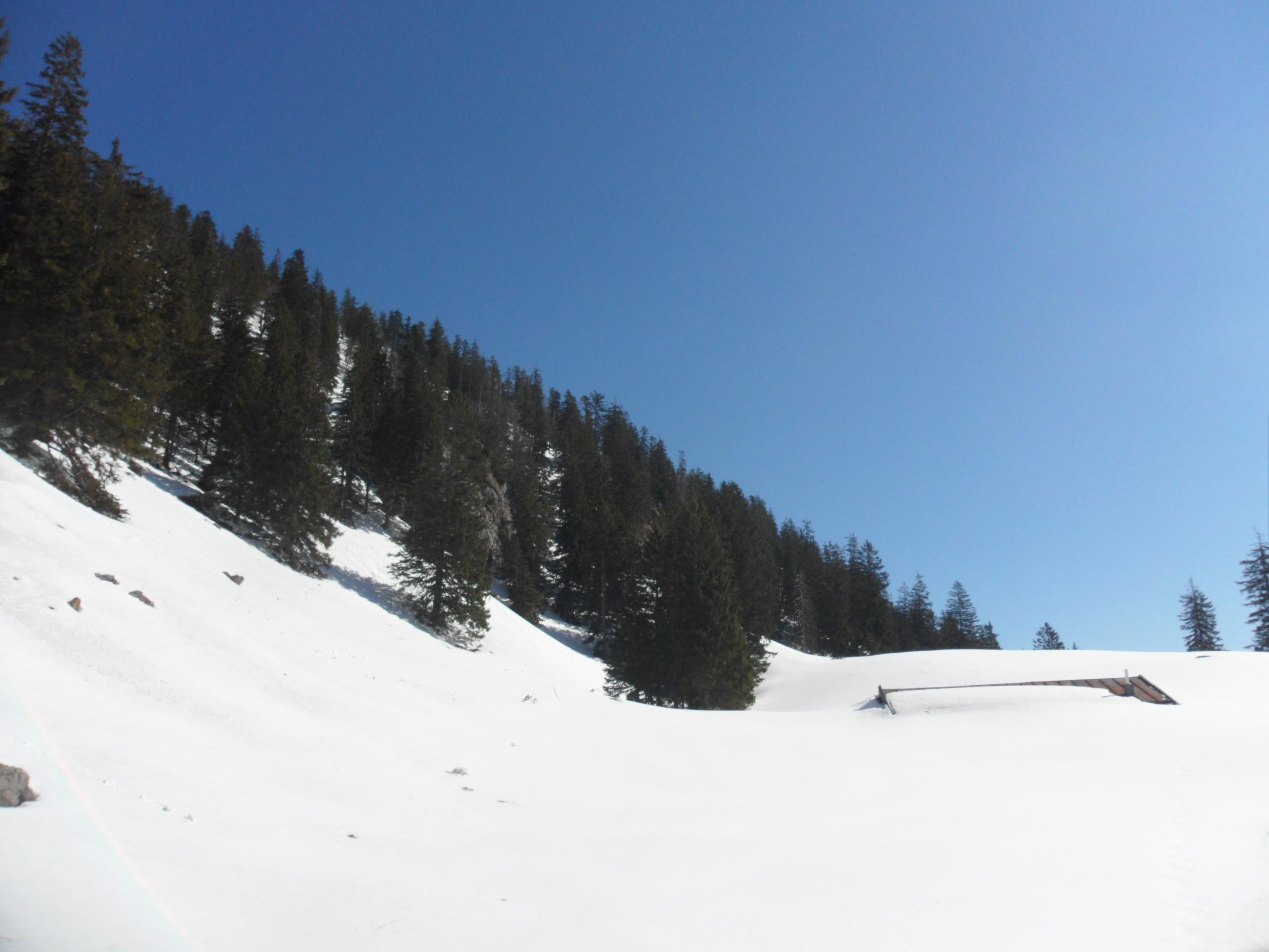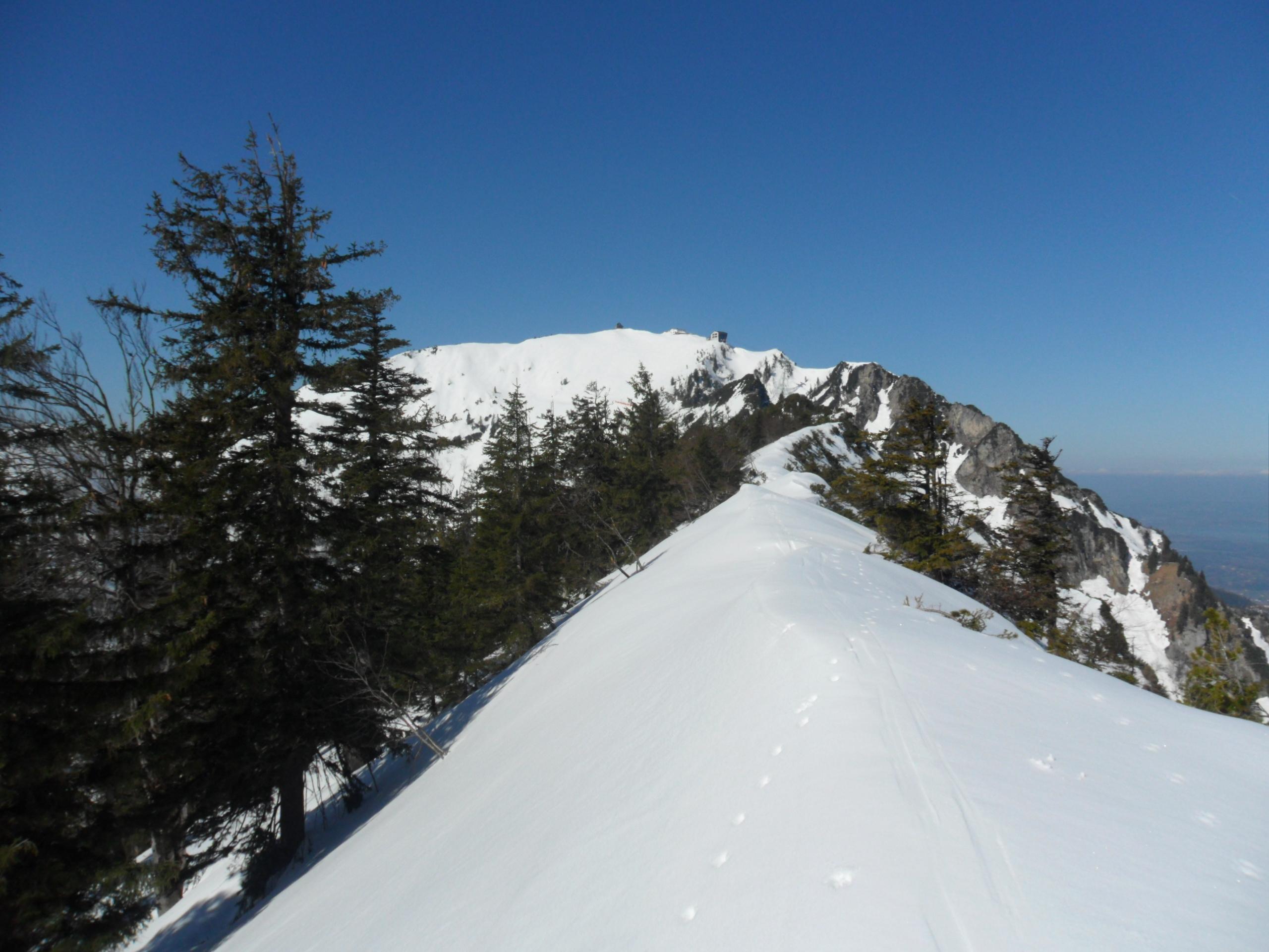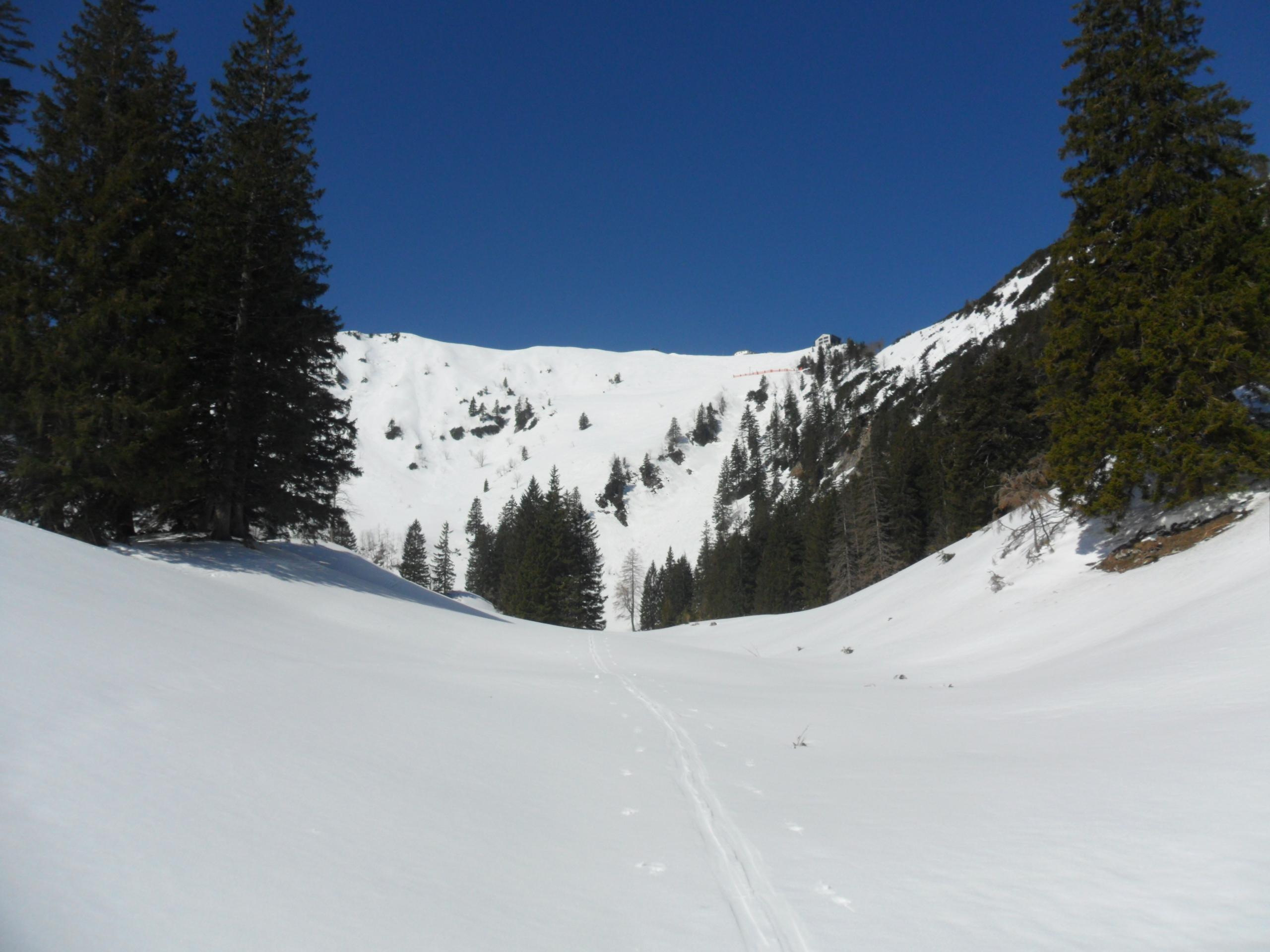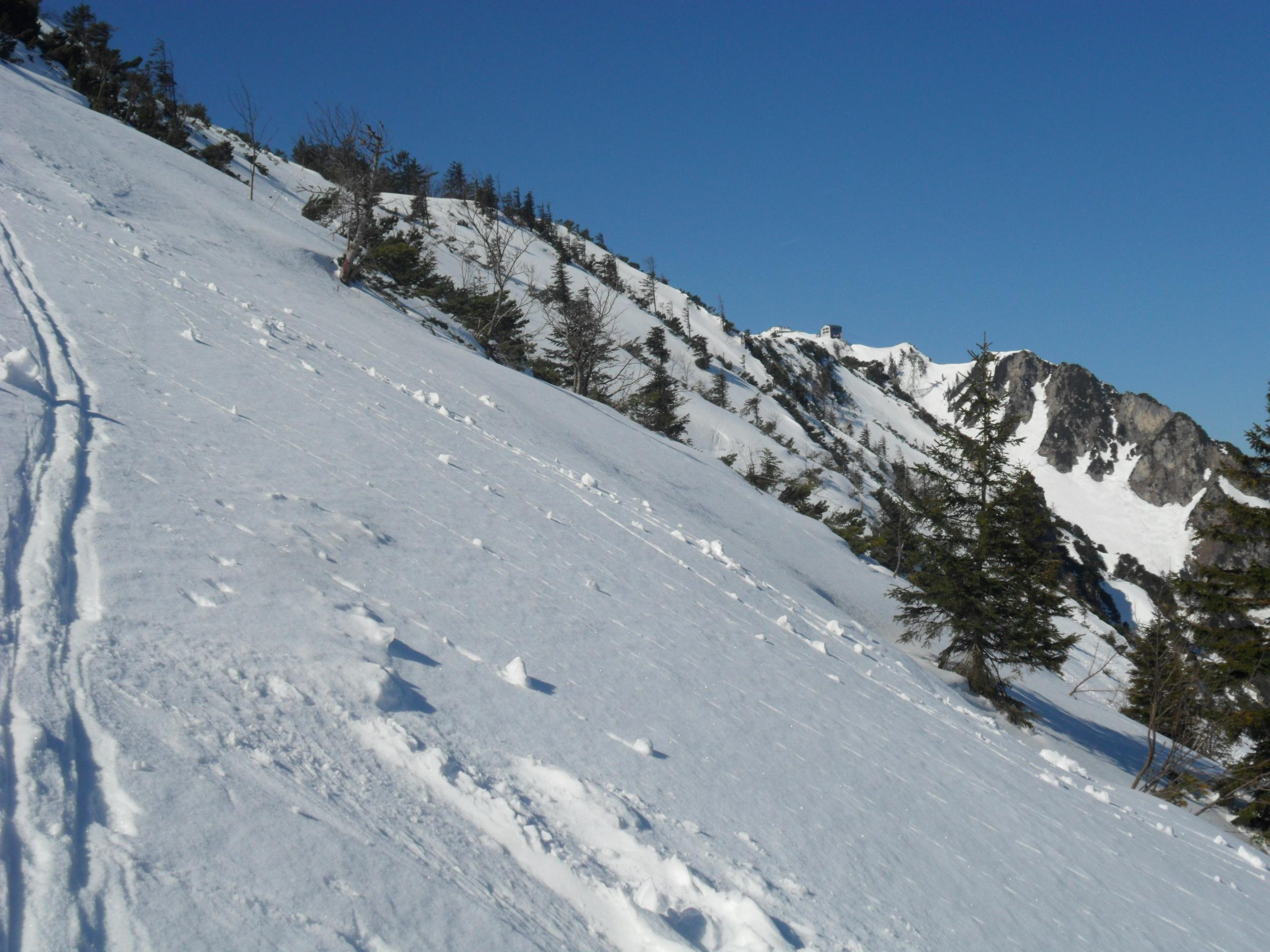 Gegen 10 Uhr hat es optimal aufgefirnt für die südseitige Abfahrt von der Strohnschneid. Abfahrt über die Piste ging auch sehr gut, nach unten hin wurde es immer weicher. War dann aber auch schon spät dran.
