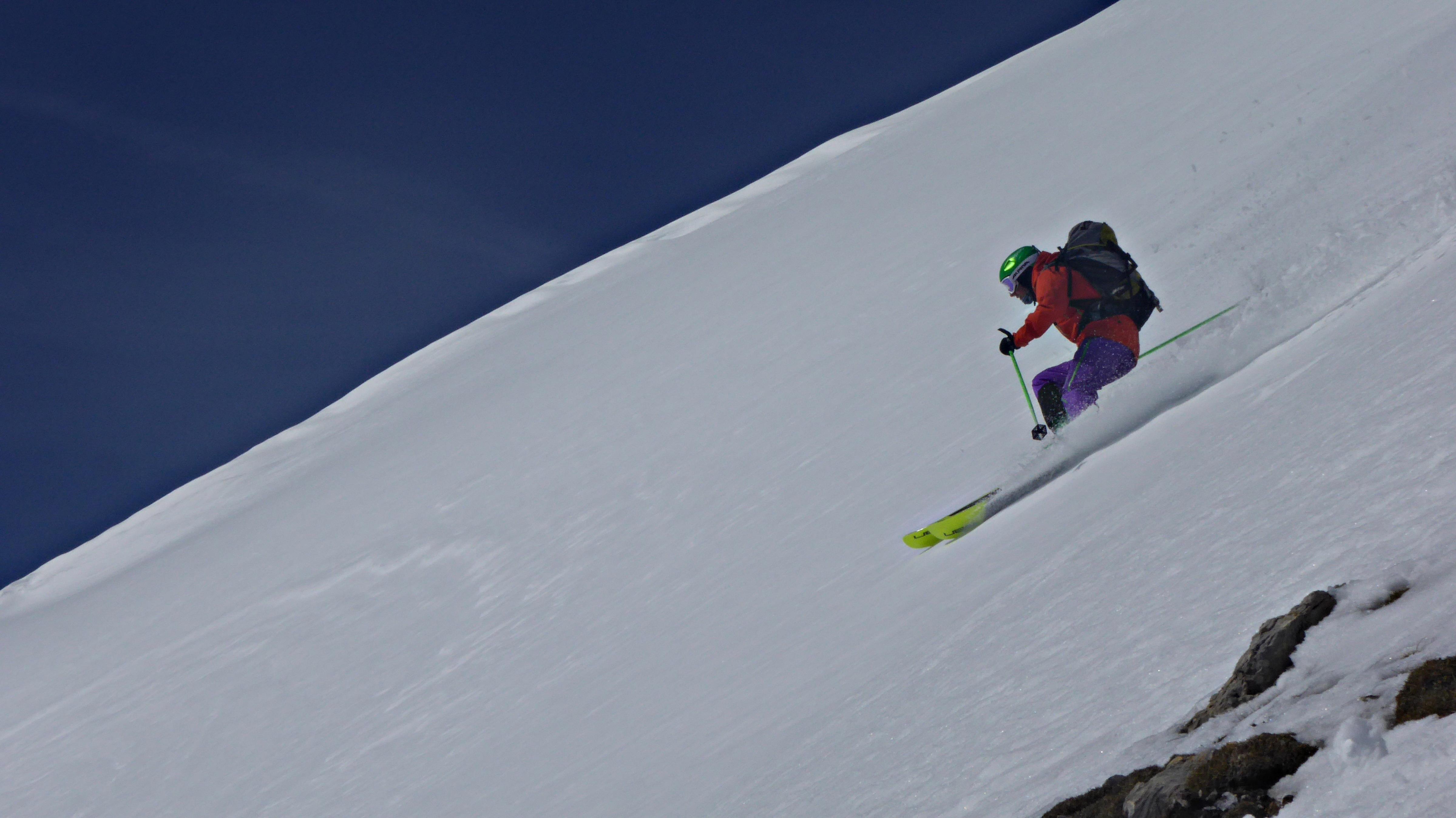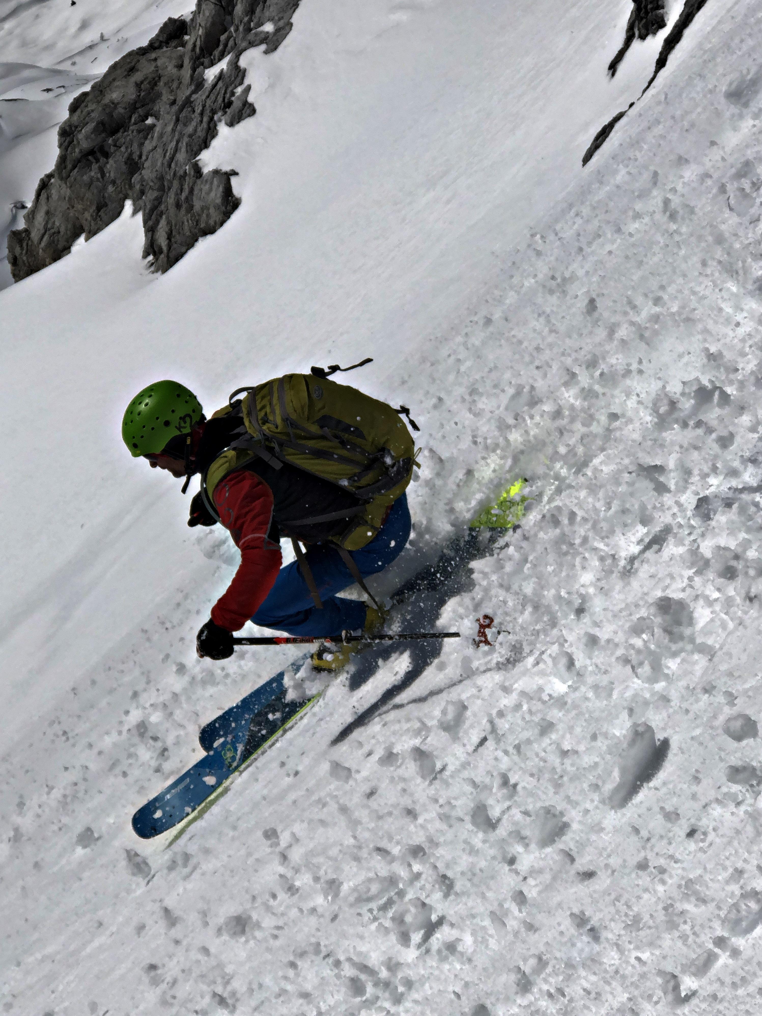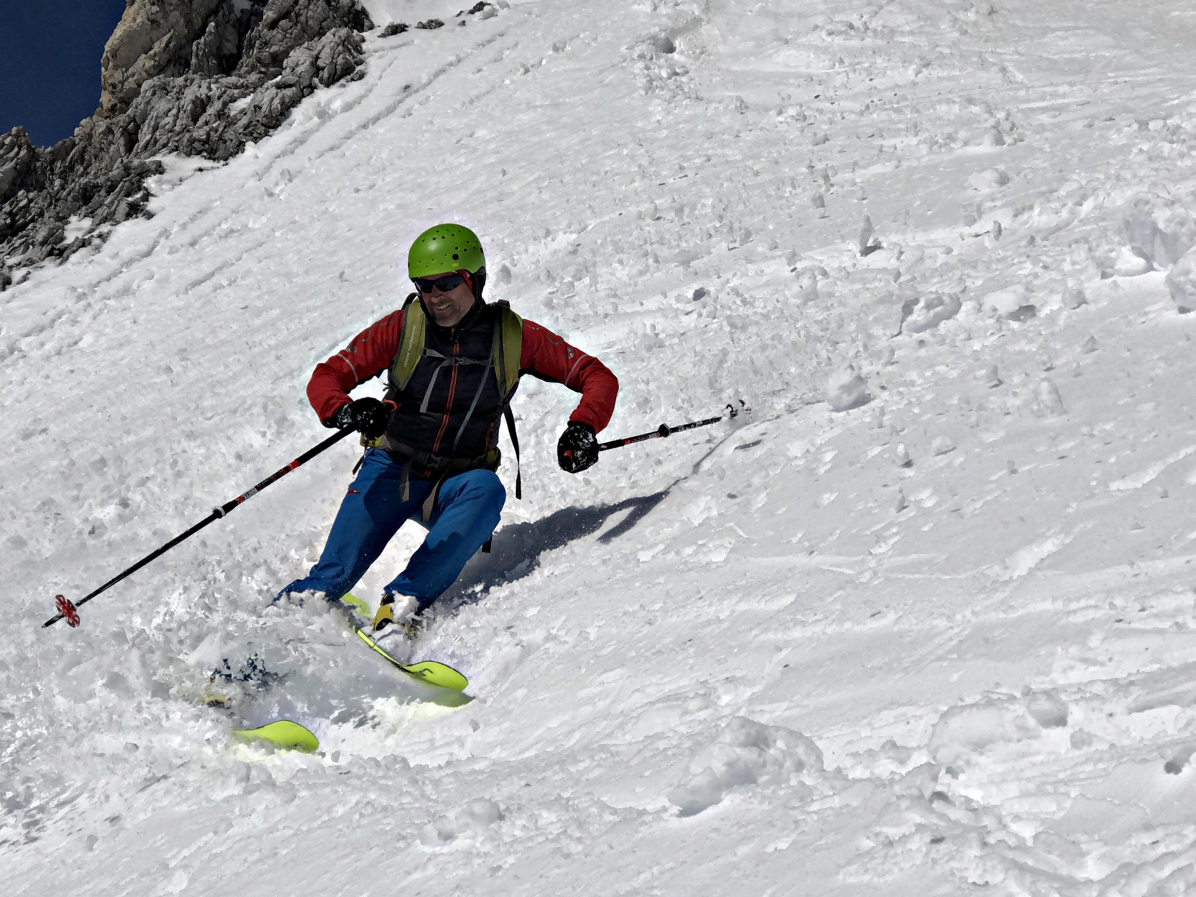 Vom Gipfel runter mit leichten Steinkontakten, dann jedoch perfekt aufgefirnt bis ca. 2.000 m. Darunter machte sich der Regeneinfluss und die Sonneneinstrahlung dann doch bemerkbar...