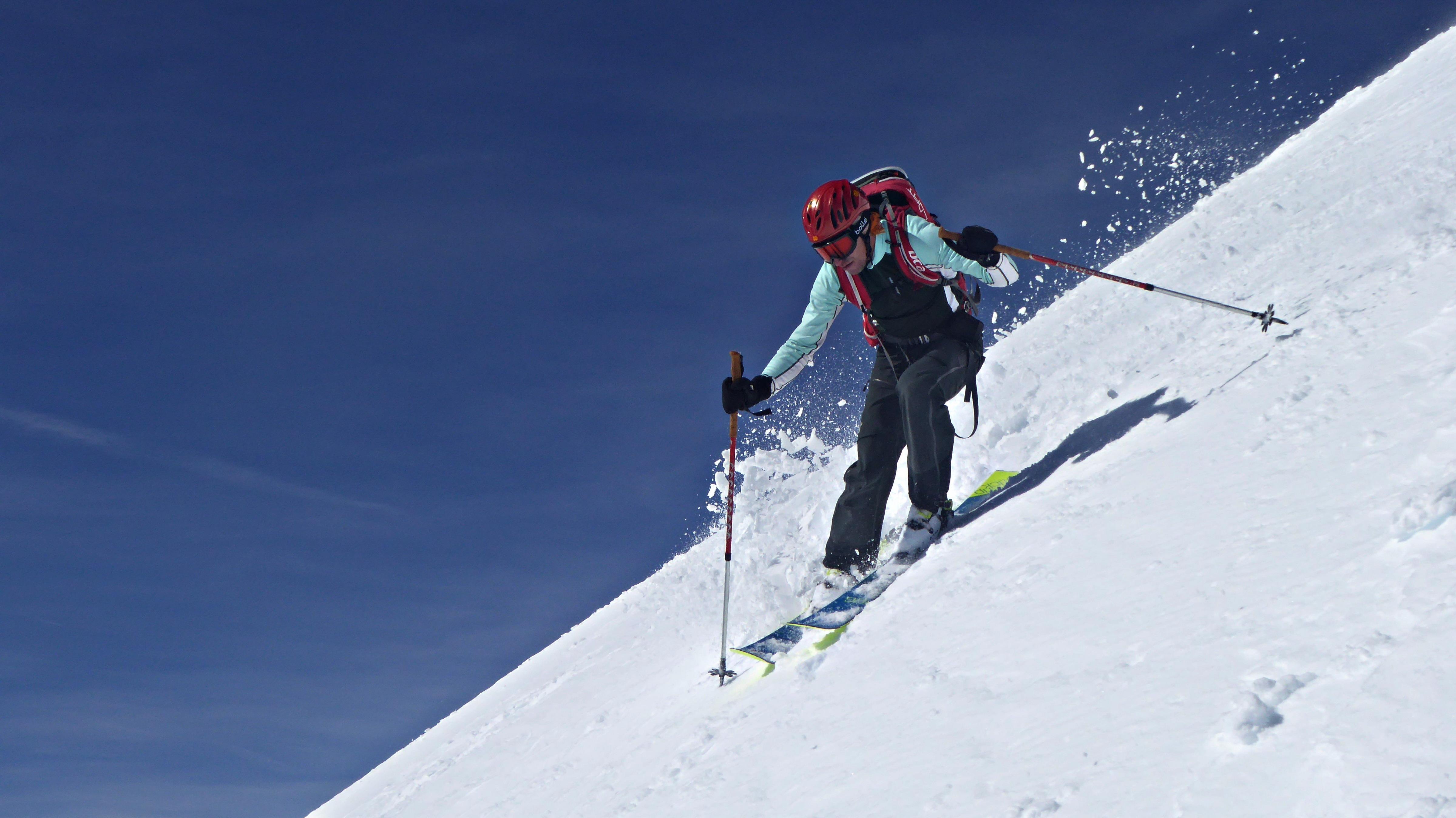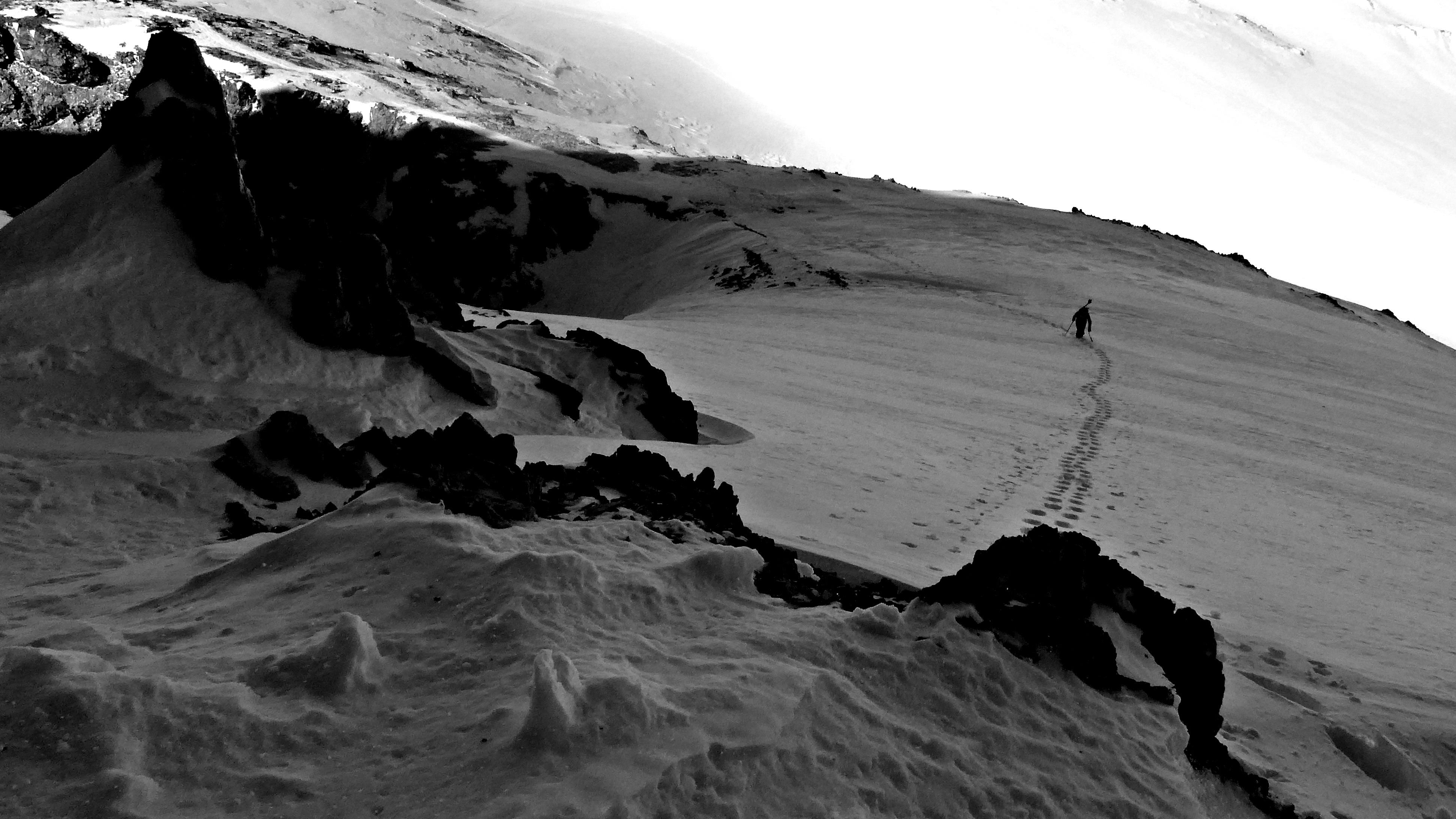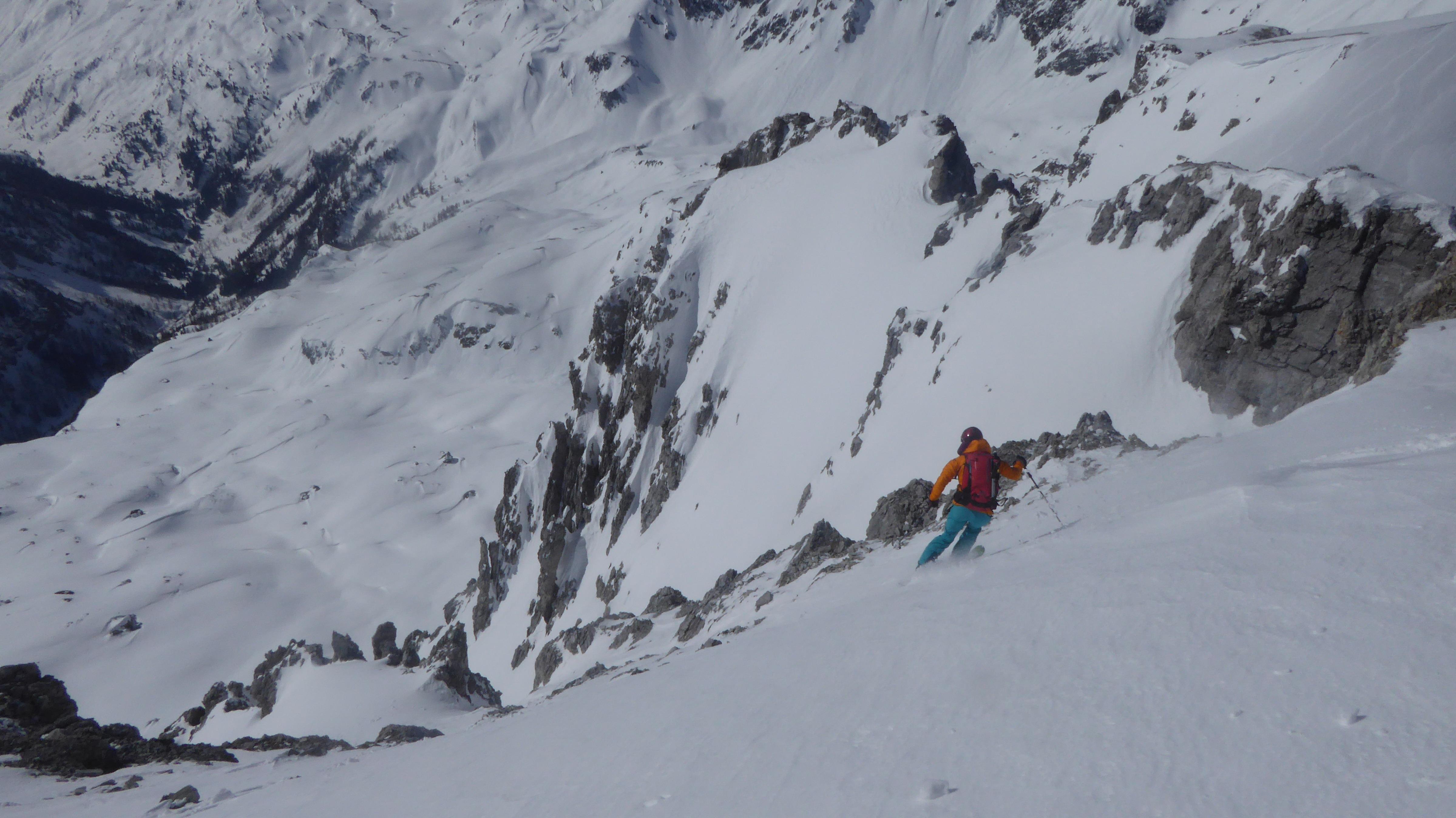 Vom Gipfel runter mit leichten Steinkontakten, dann jedoch perfekt aufgefirnt bis ca. 2.000 m. Darunter machte sich der Regeneinfluss und die Sonneneinstrahlung dann doch bemerkbar...