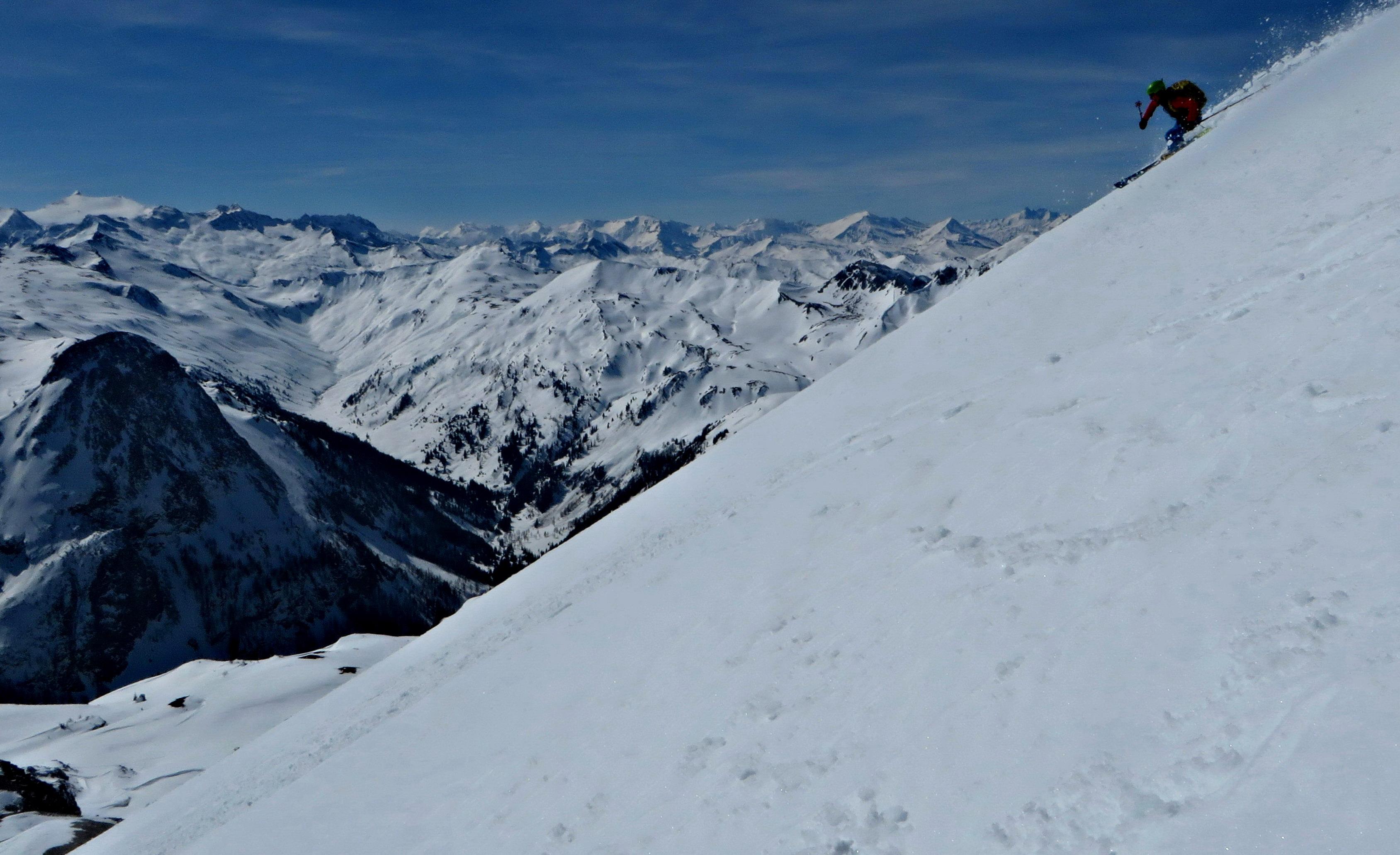 Insgesamt aber sehr gute und auch stabile Bedingungen - nur im Bereich der Waldgrenze auf 1.700 m - 1.900 m war die Bindung des oberflächlichen Sumpfes auf der kompakten Altschneedecke nicht mehr gut...dort waren die steileren Hänge mit Vorsicht zu genießen...
