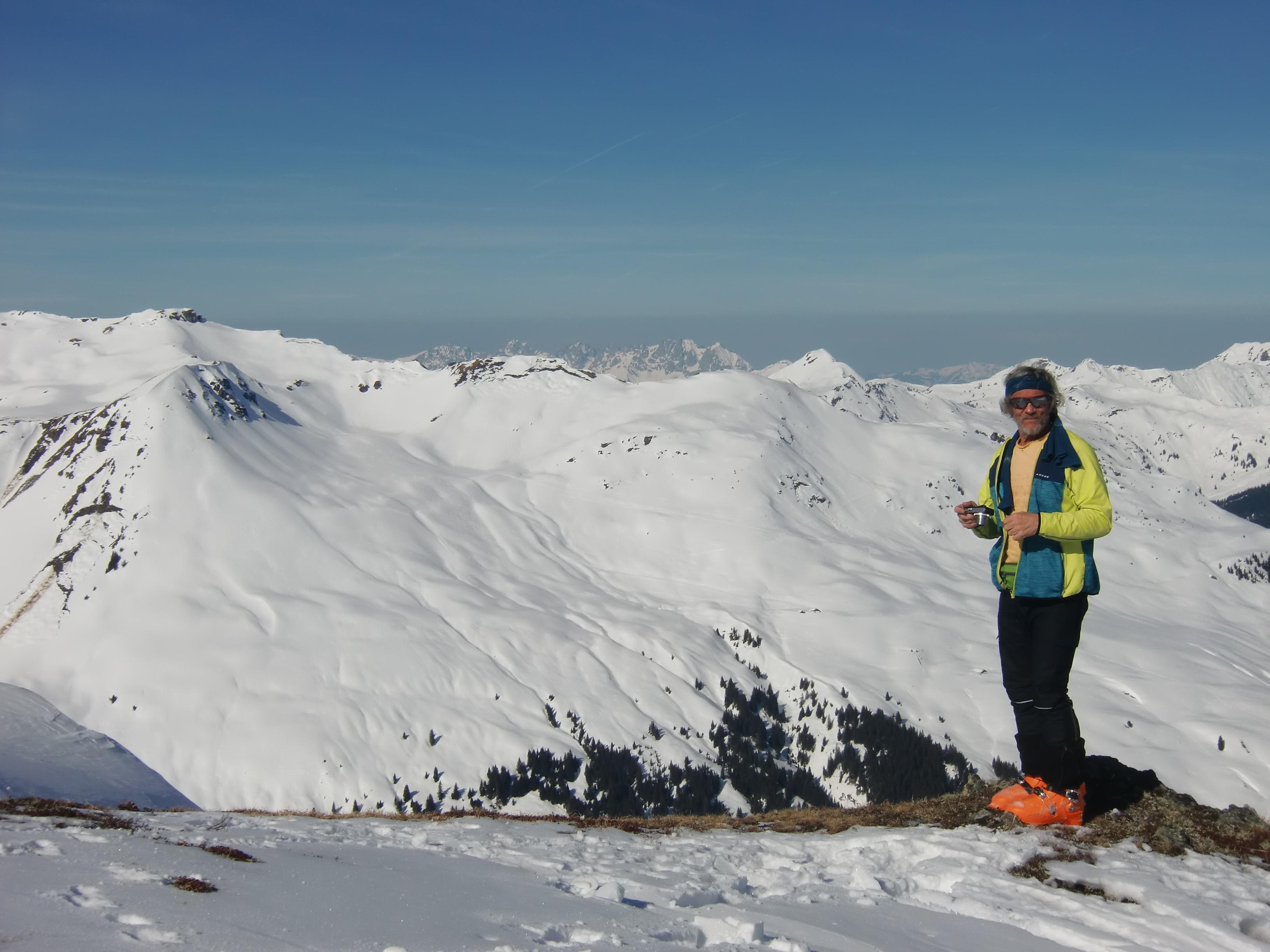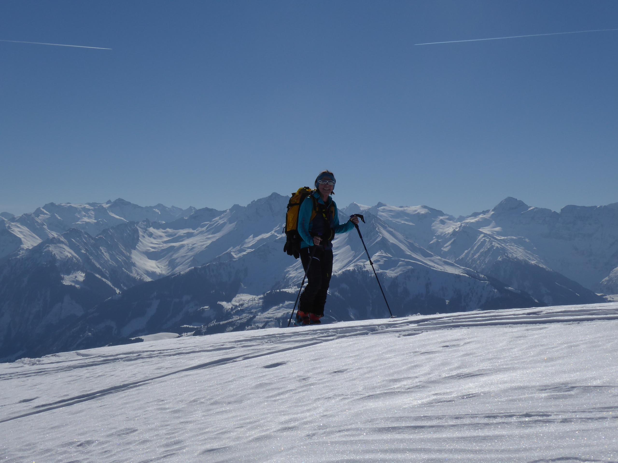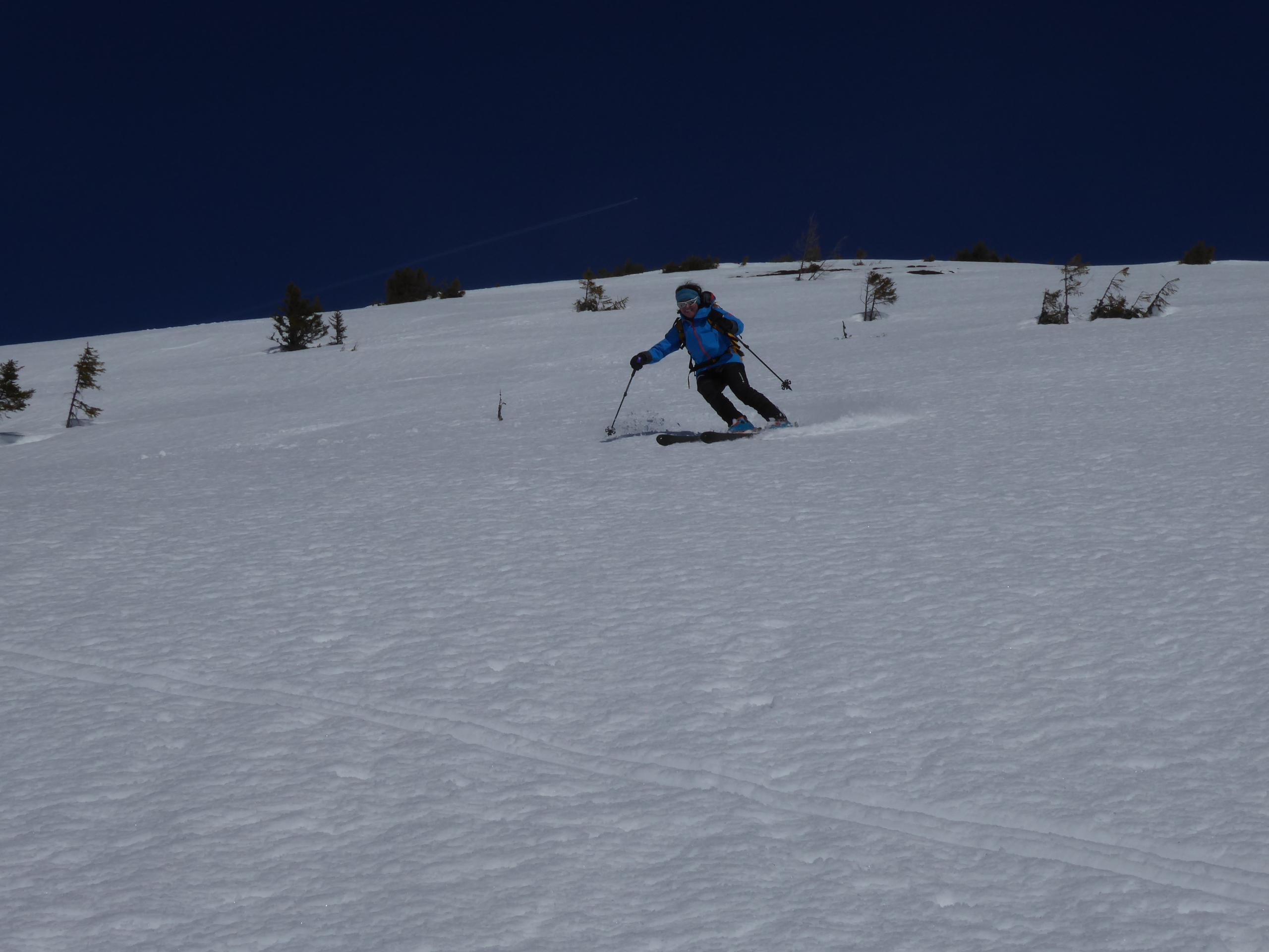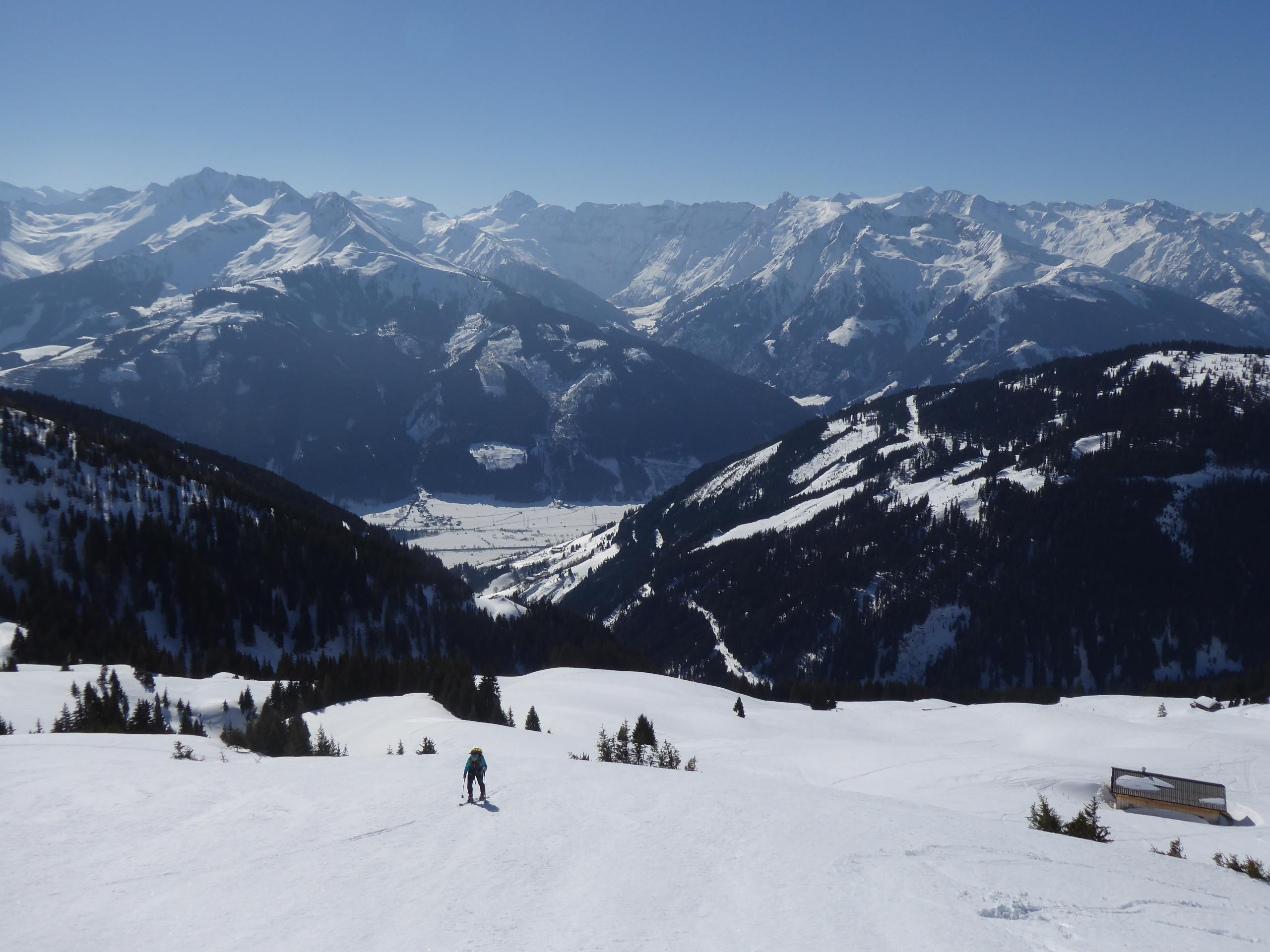 Nach kalt-schattigen Pulvertagen stand uns zum Abschluss unserer Oberpinzgau-Tage der Sinn nach Sonne genießen und Firn suchen. Experiment gelungen: Auf der Salzachtal-Sonnseite. Die ist ja oft recht launisch. Im Hochwinter hast nach 1-2 Sonnentagen Bruchharsch von oben bis unten und bis es einmal firnig wird, sind die unteren zwei Drittel schon aper. Aber diesmal hats gepasst. Firn von oben bis zum Auto.