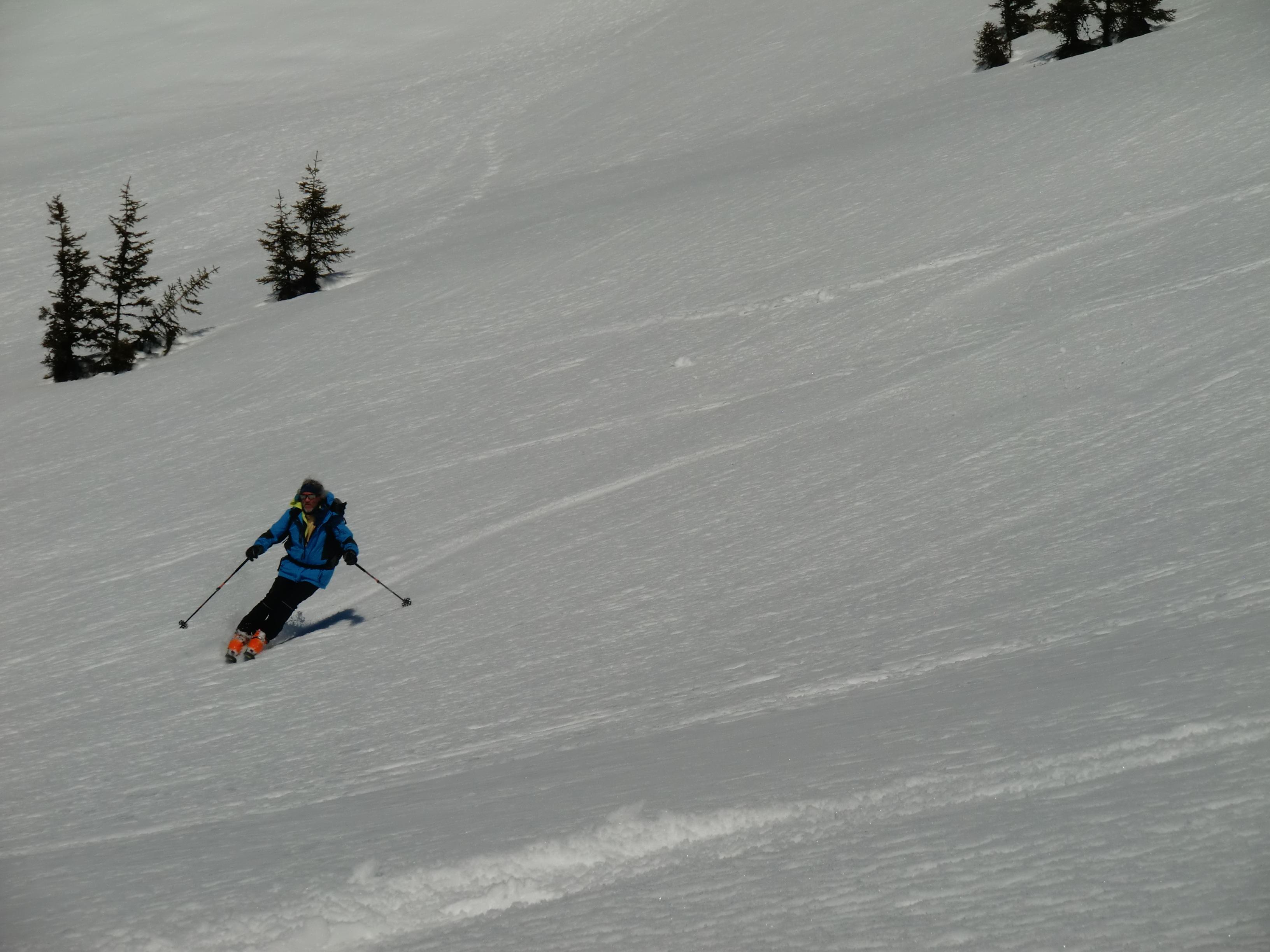 Die Zehetner Stange ist von zwei berühmteren Nachbarn eingerahmt: Westlich der Mittagskogel, östl. der Manlitzkogel, aber diese Hänge schauen am exaktesten nach Süden und waren noch fast unberührt. Durch eine sanfte kühle Brise war der Firn trotz Herumgetrödels bis 13:00h noch allerbestens.